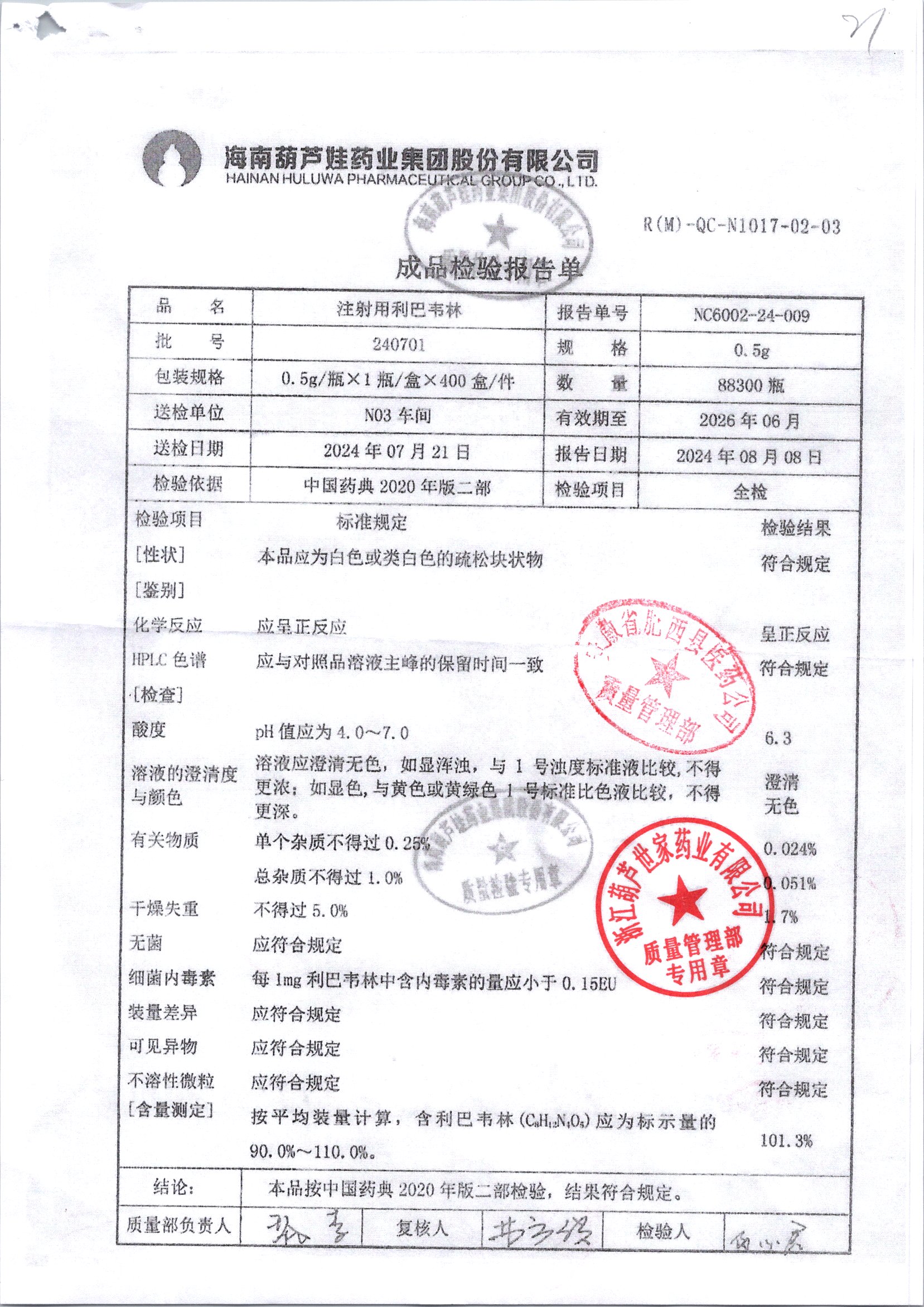 注射用利巴韋林 0.5g 240701 查看詳情