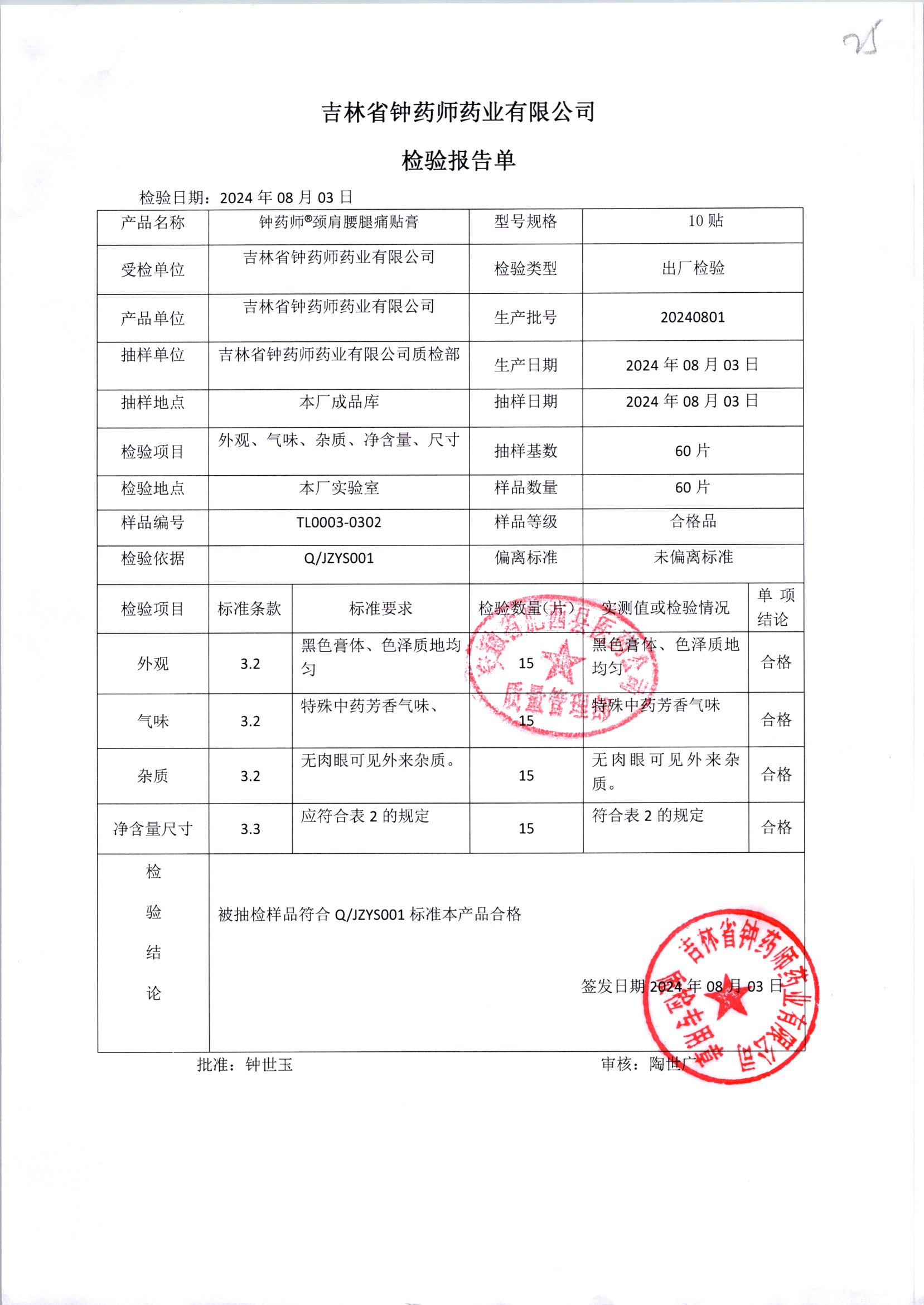 名稱 規(guī)格 批號 藥檢報告