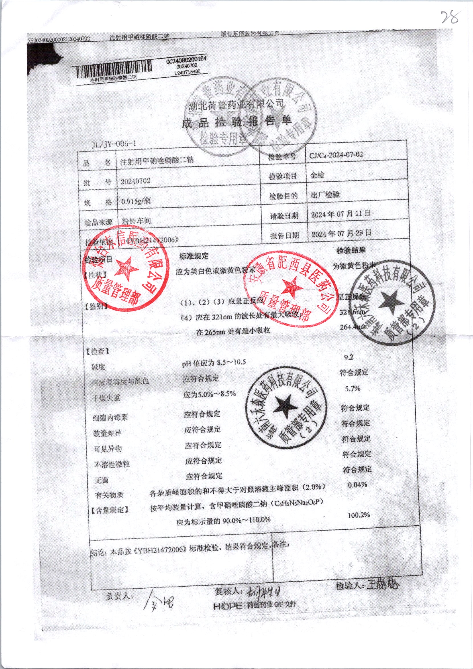 注射用甲硝唑磷酸二鈉 0.915g 20240702 查看詳情
