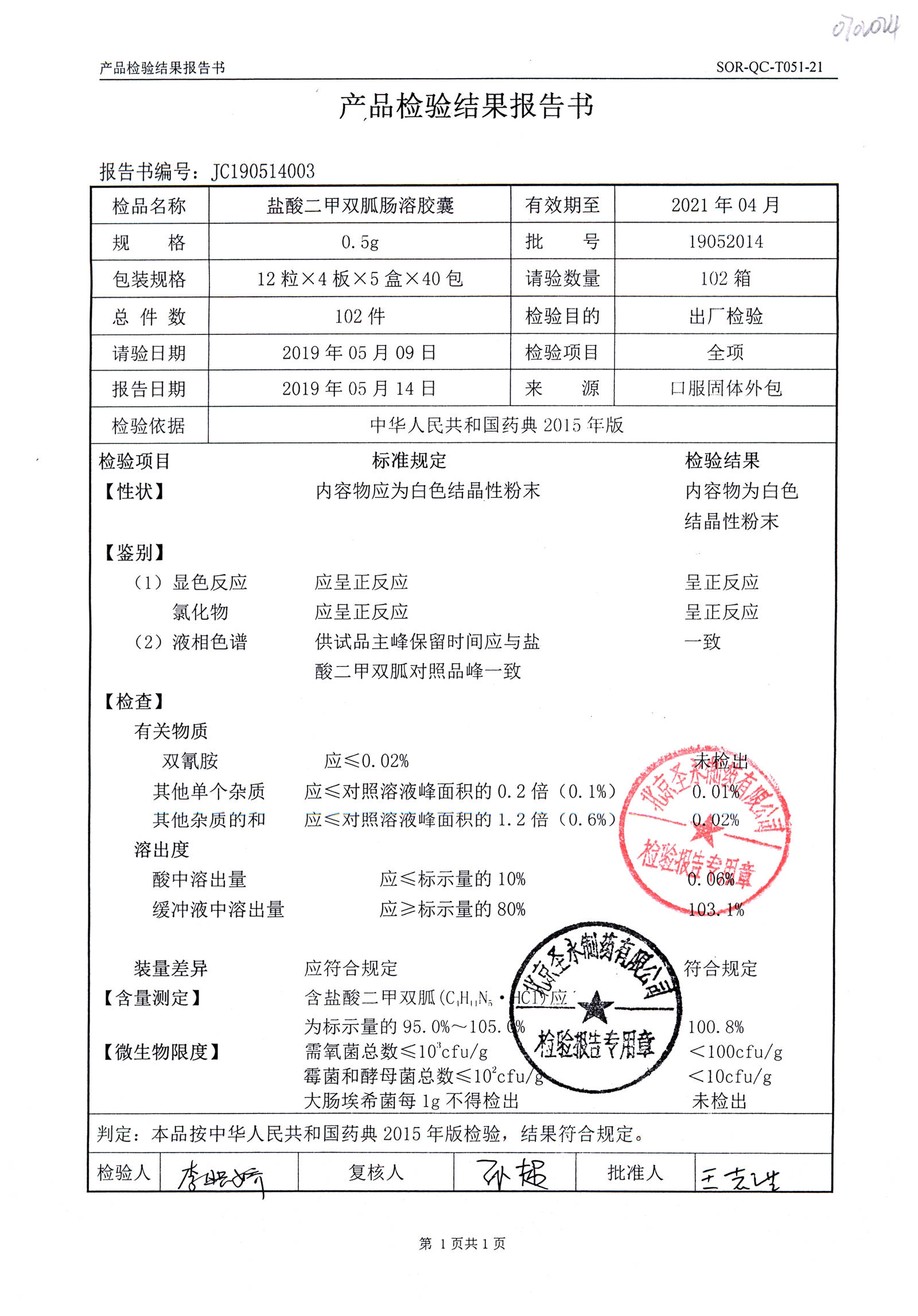 | 鹽酸二甲雙胍腸溶膠囊 | 0.5g*48粒 | 19032101(2/2) | 查看詳情 |