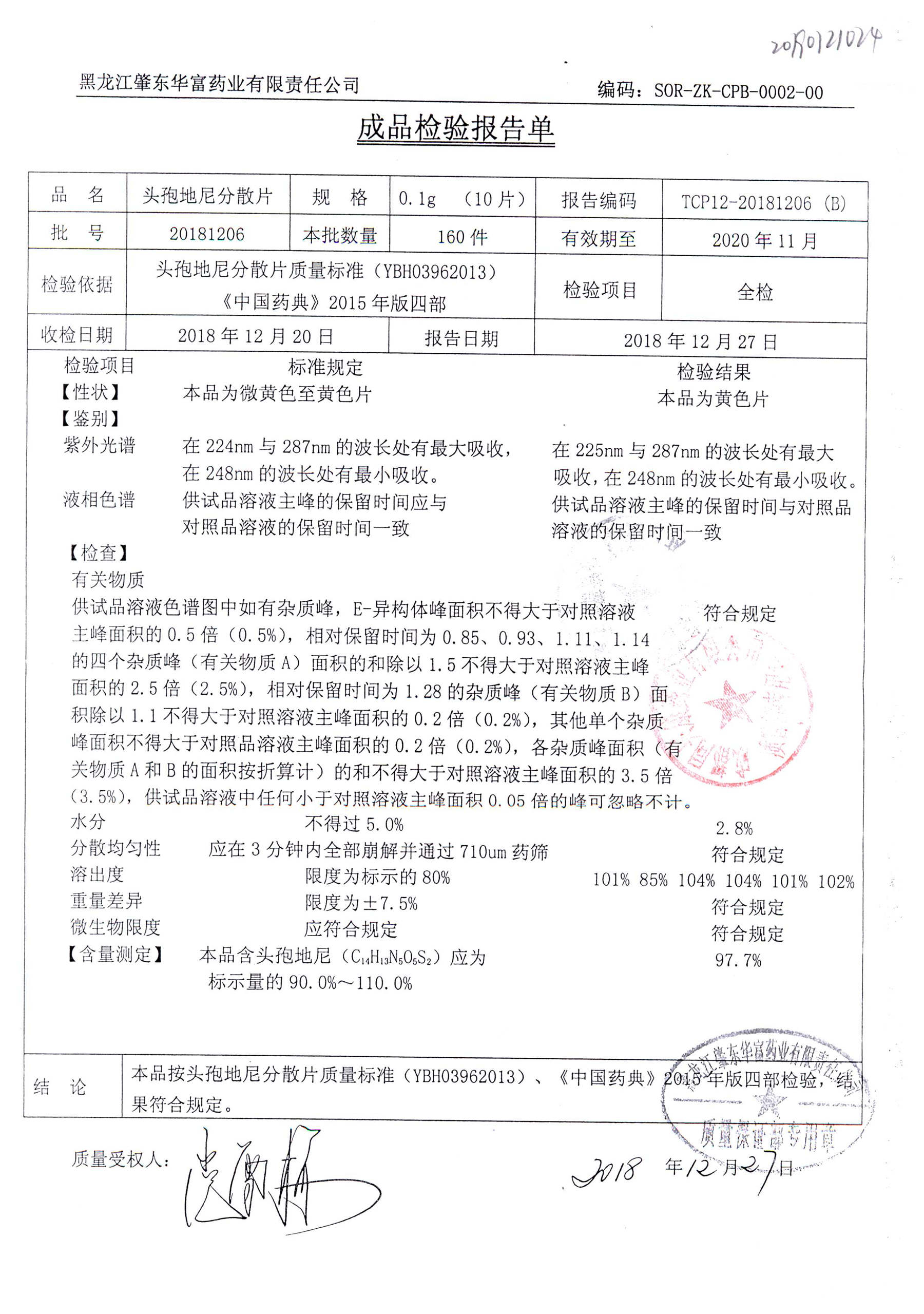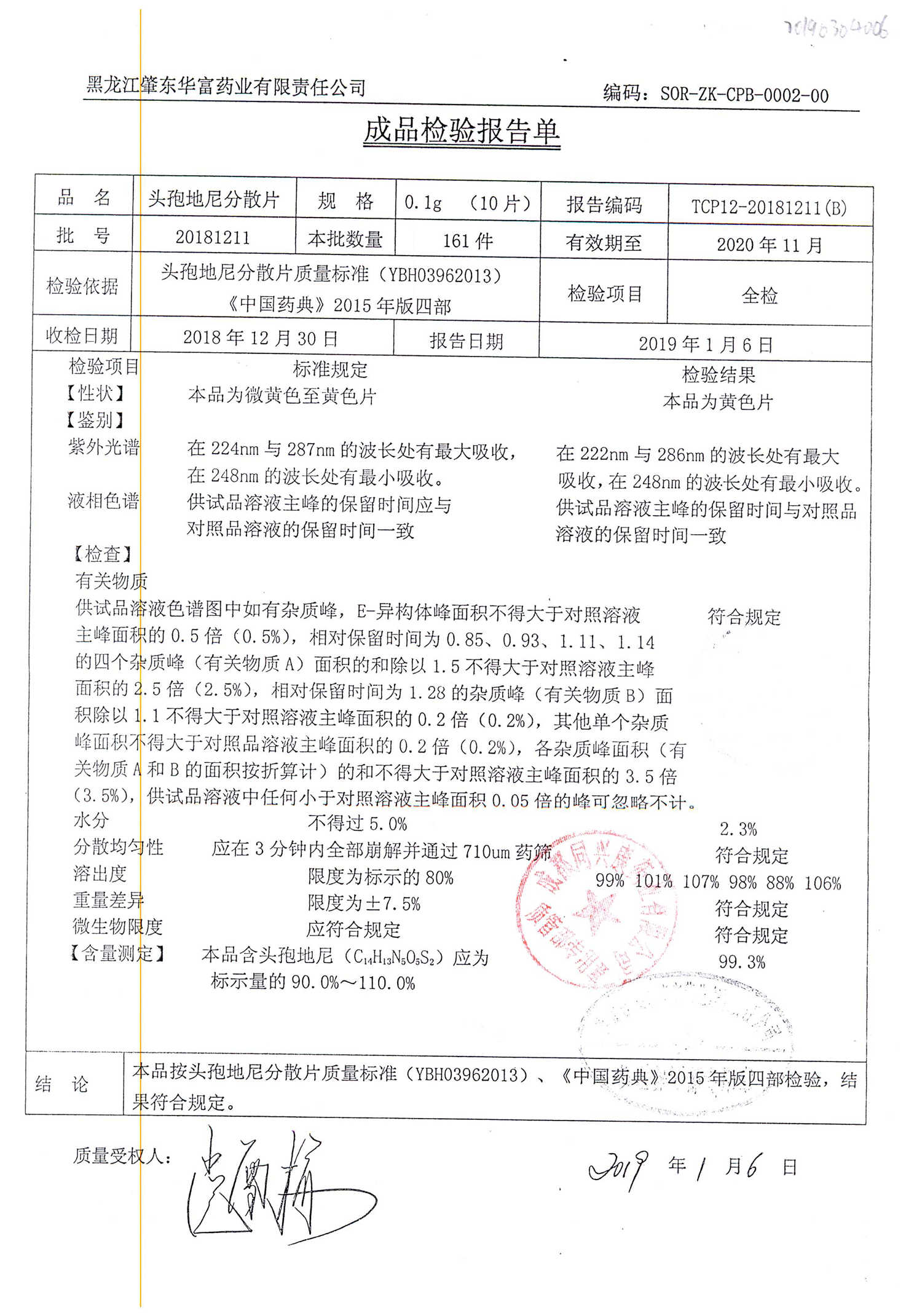 | 頭孢地尼分散片 | 0.1g*10s | 20181211 | 查看詳情 |