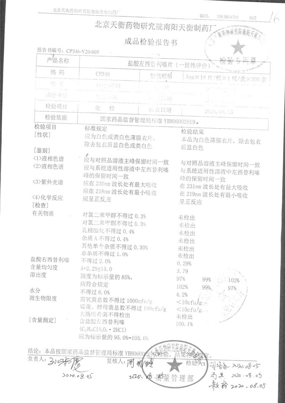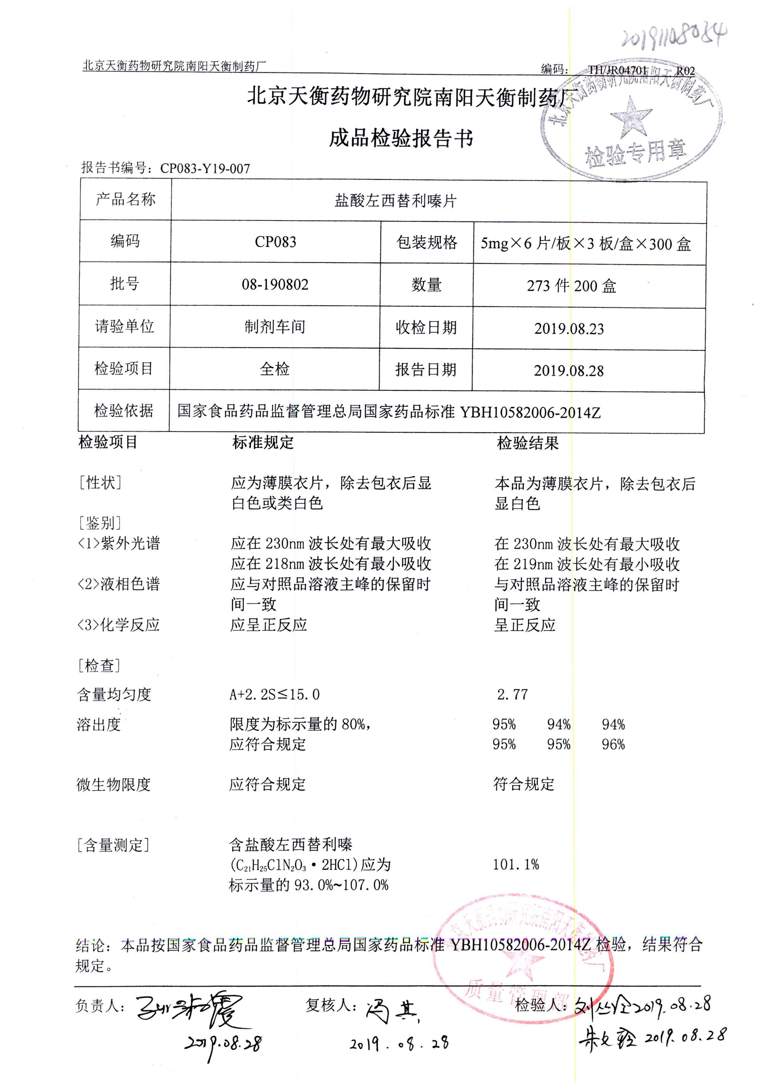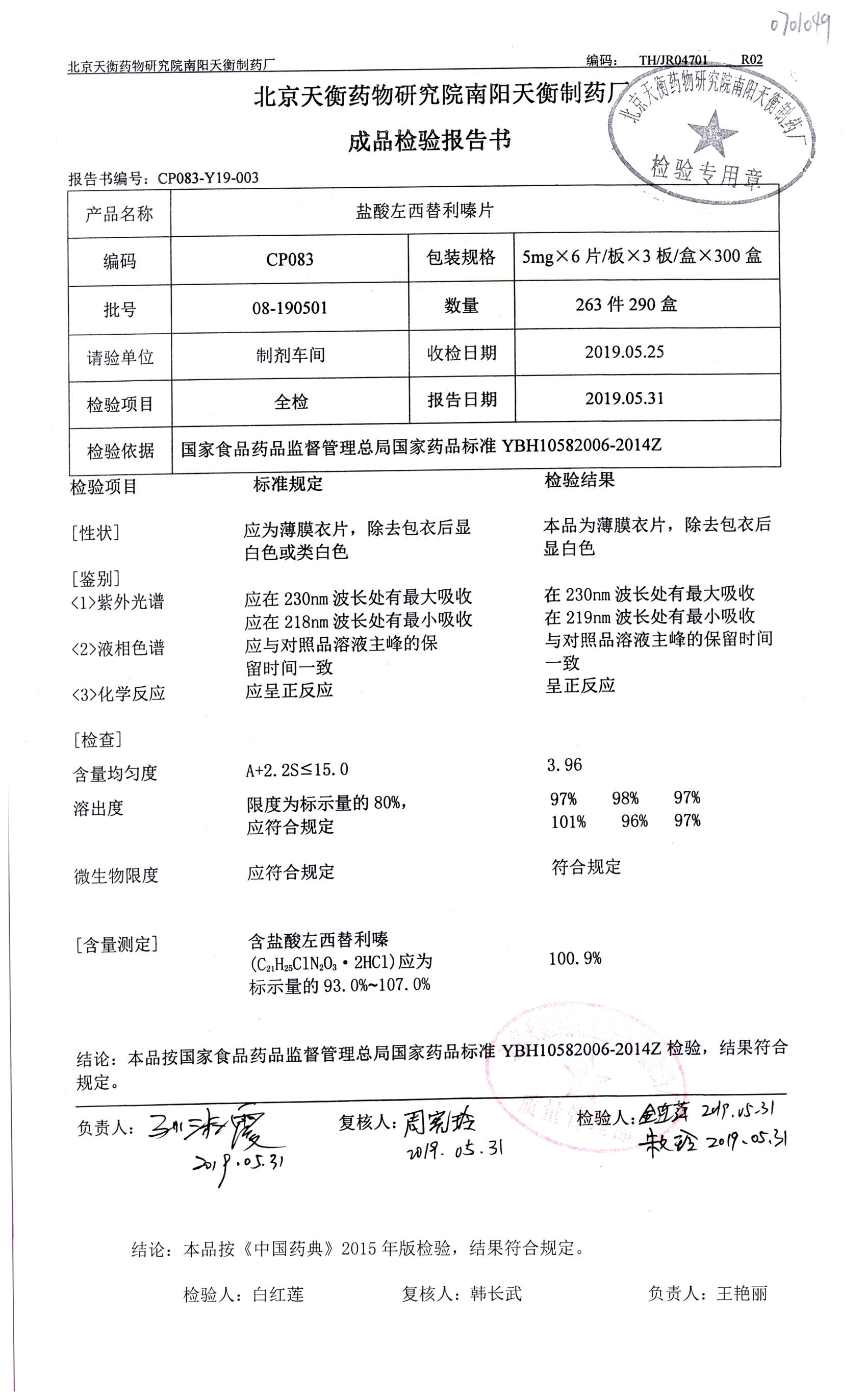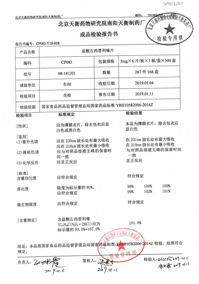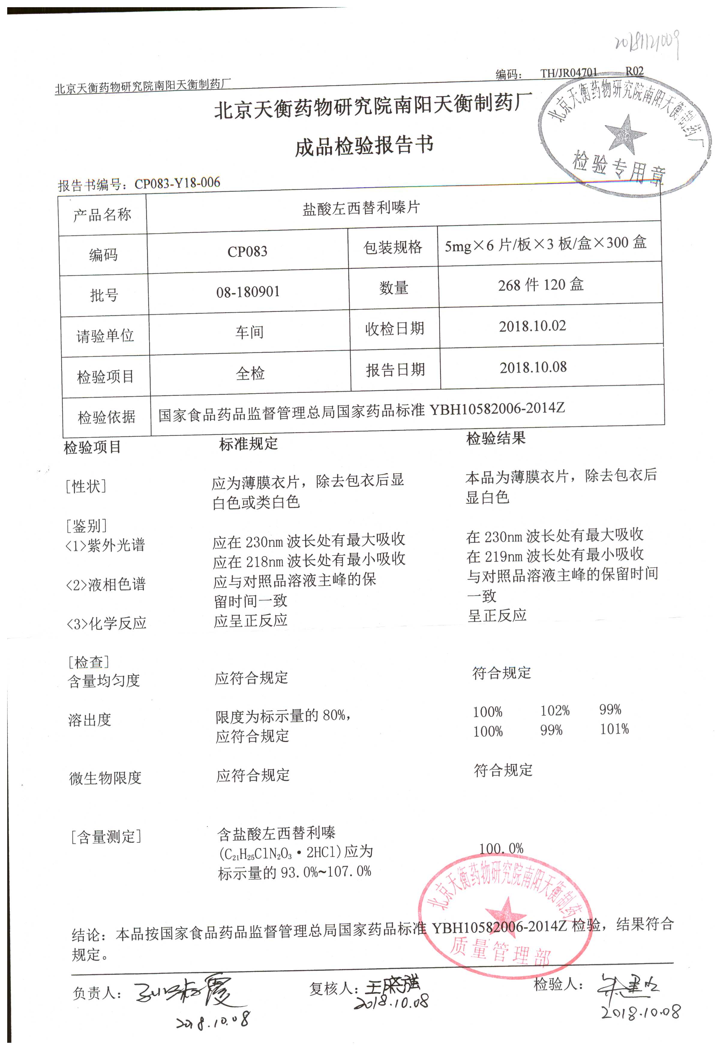 | 鹽酸左西替利嗪片 | 5mg*18s | 08-190801 | 查看詳情 |