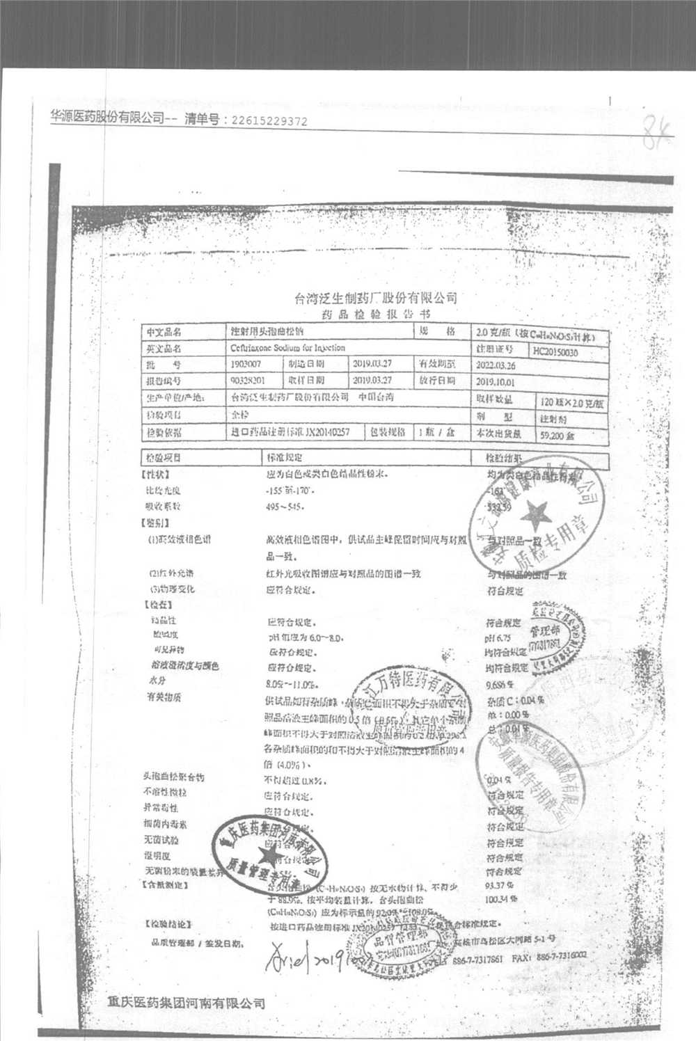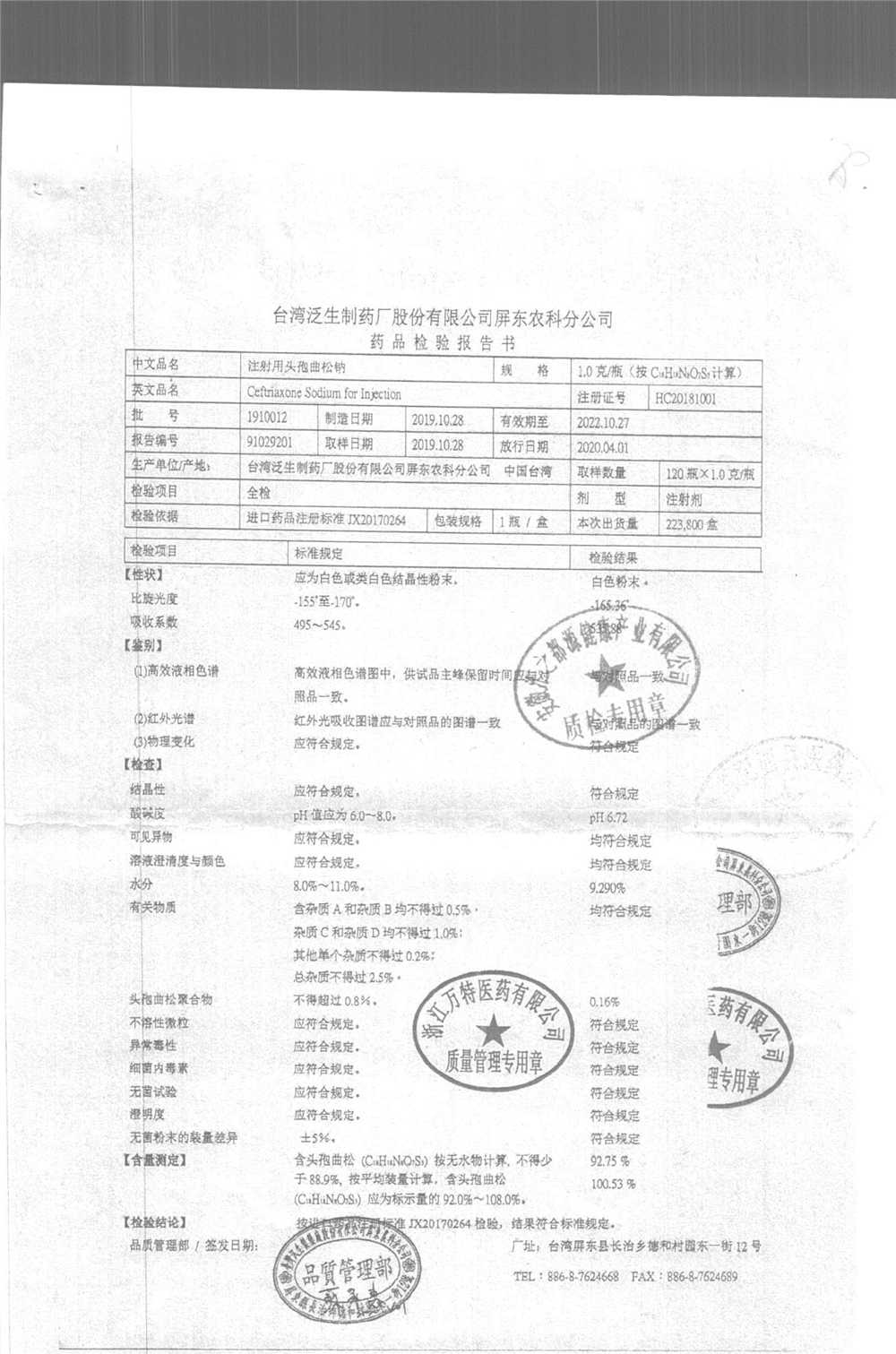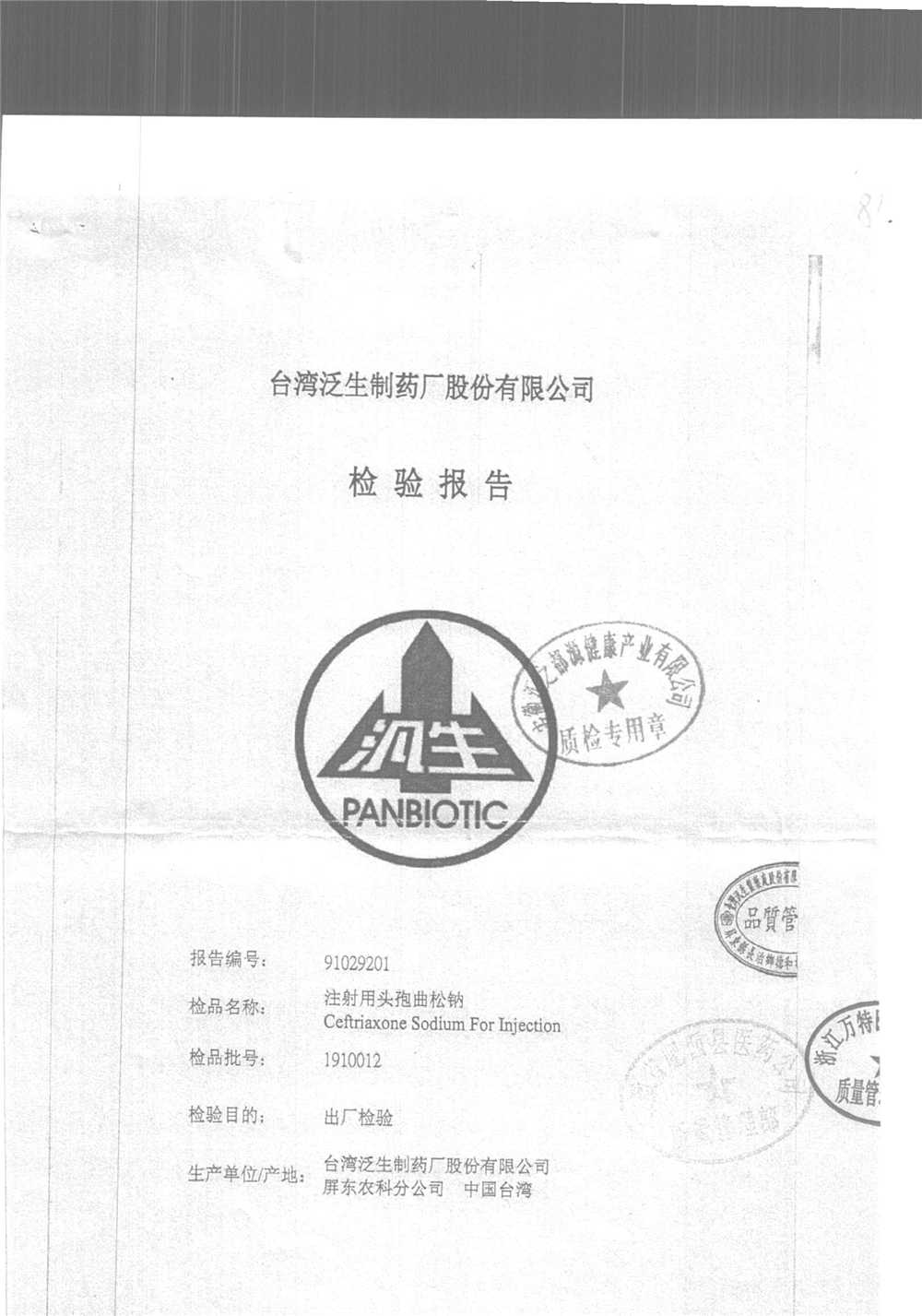 | 注射用頭孢曲松鈉 | 2.0g | 1903007(5/5) | 查看詳情 |