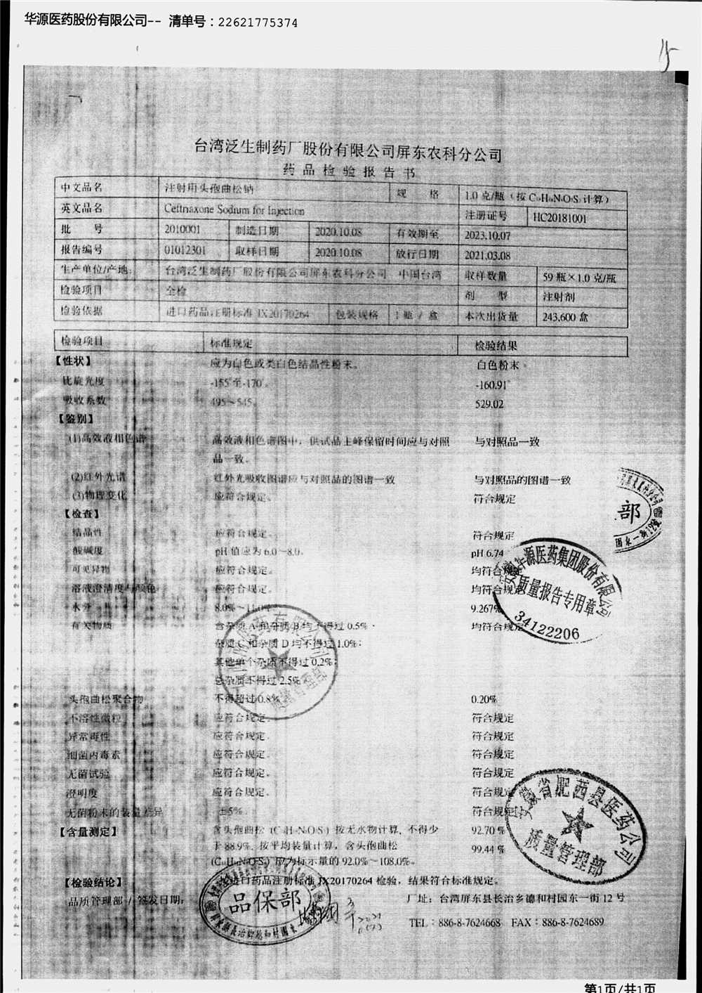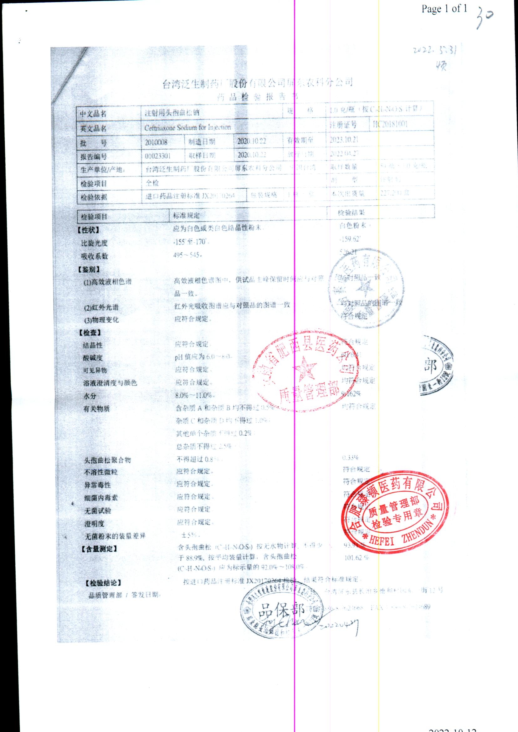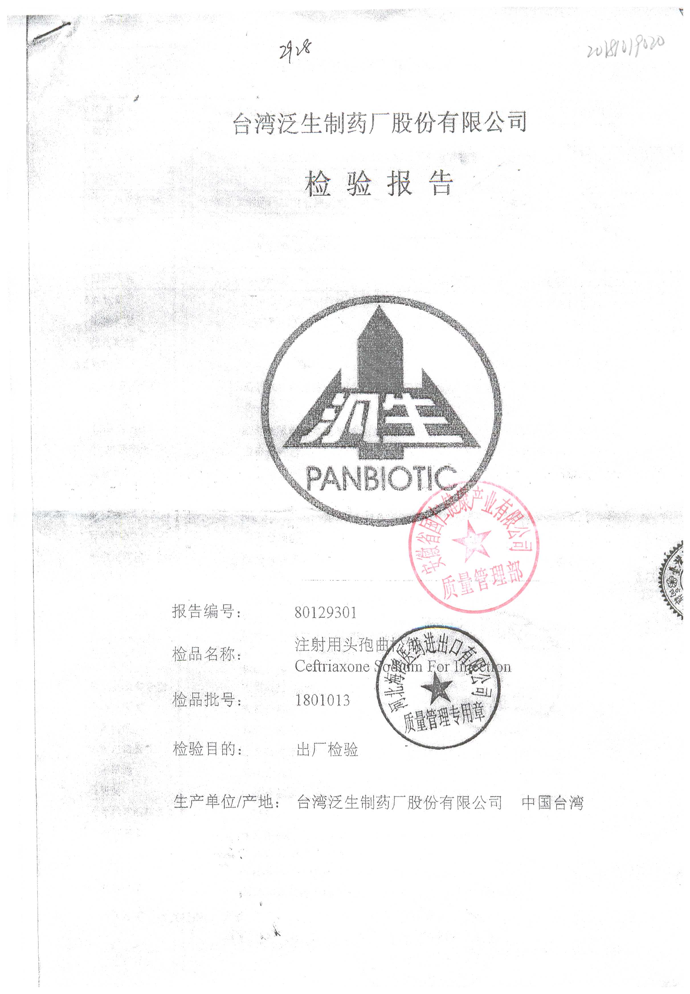 | 注射用頭孢曲松鈉 | 2.0g | 1903007(5/5) | 查看詳情 |