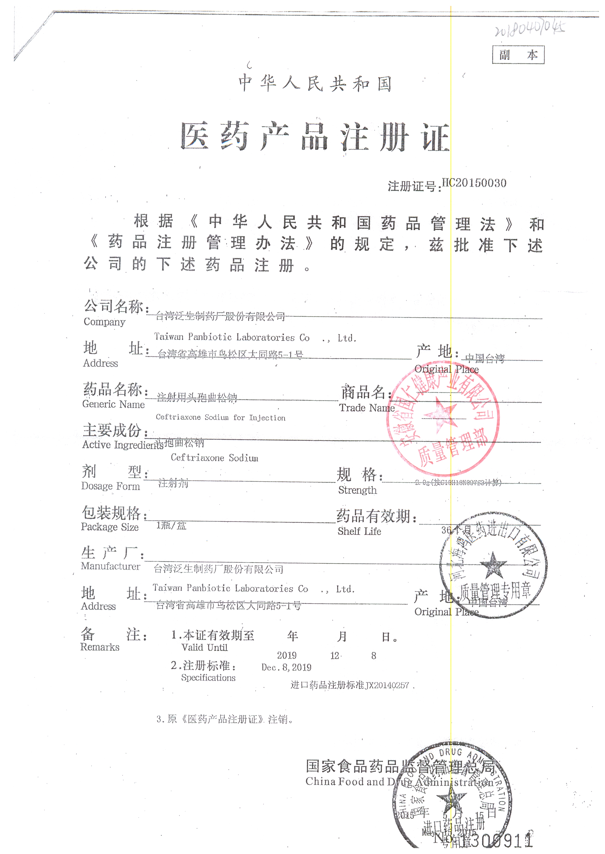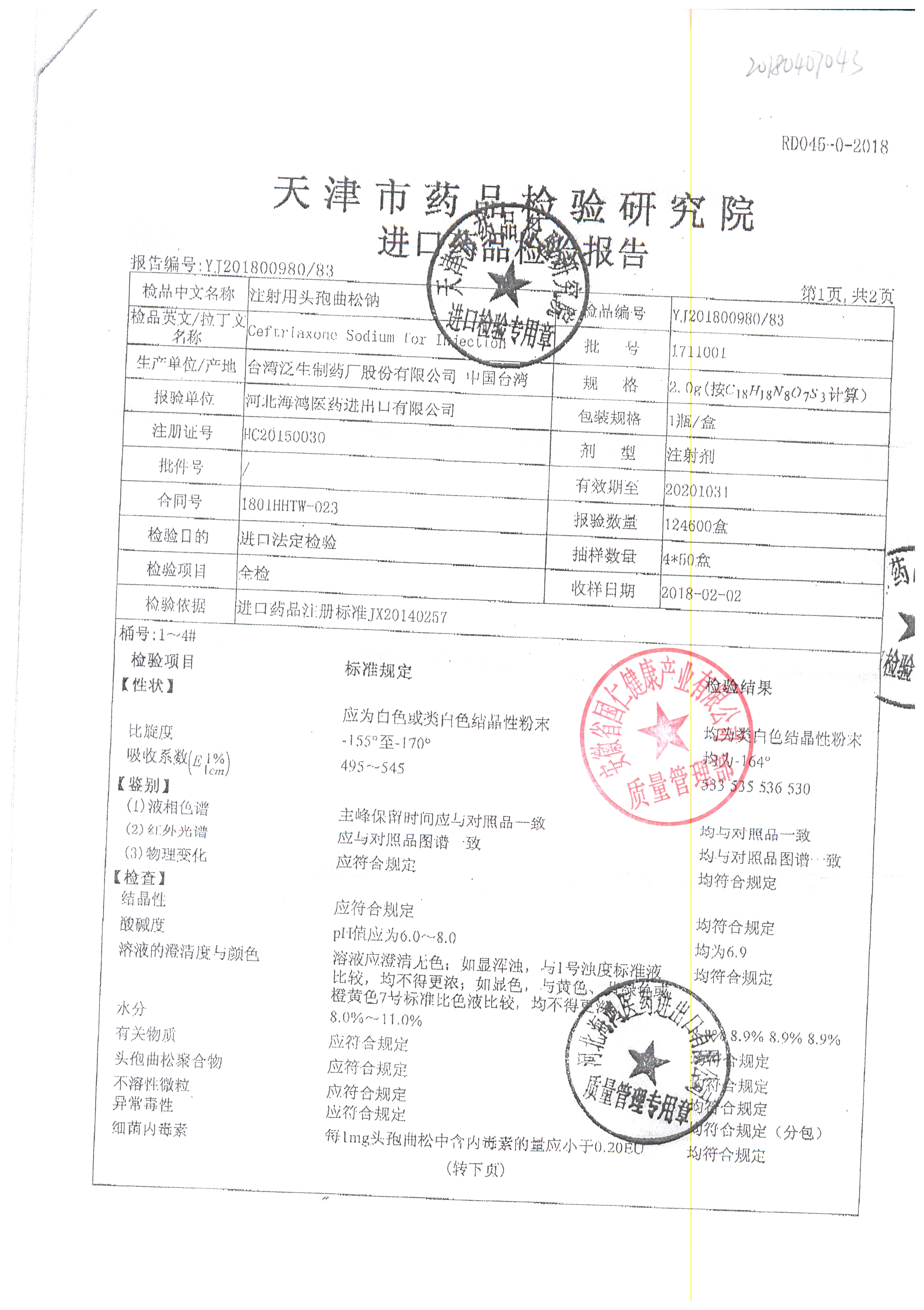 | 注射用頭孢曲松鈉 | 2.0g | 1903007(4/5) | 查看詳情 |