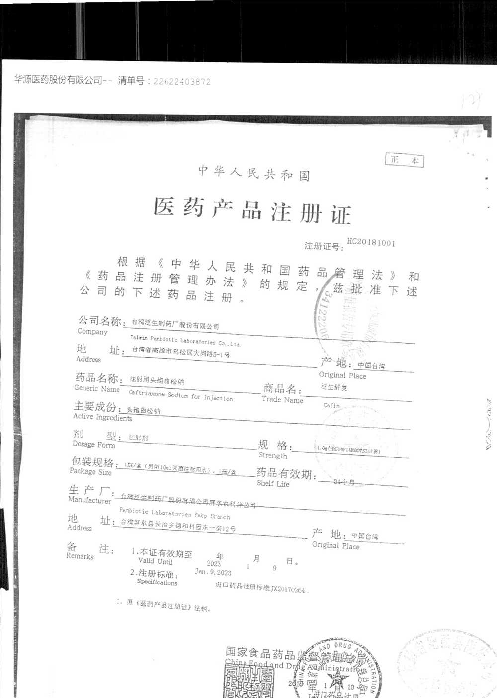 | 注射用頭孢曲松鈉 | 2.0g | 1801013(3/3) | 查看詳情 |