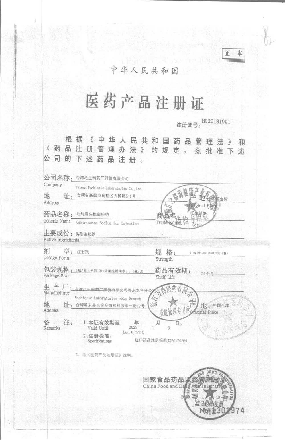 | 注射用頭孢曲松鈉 | 2.0g | 1801013(1/3) | 查看詳情 |