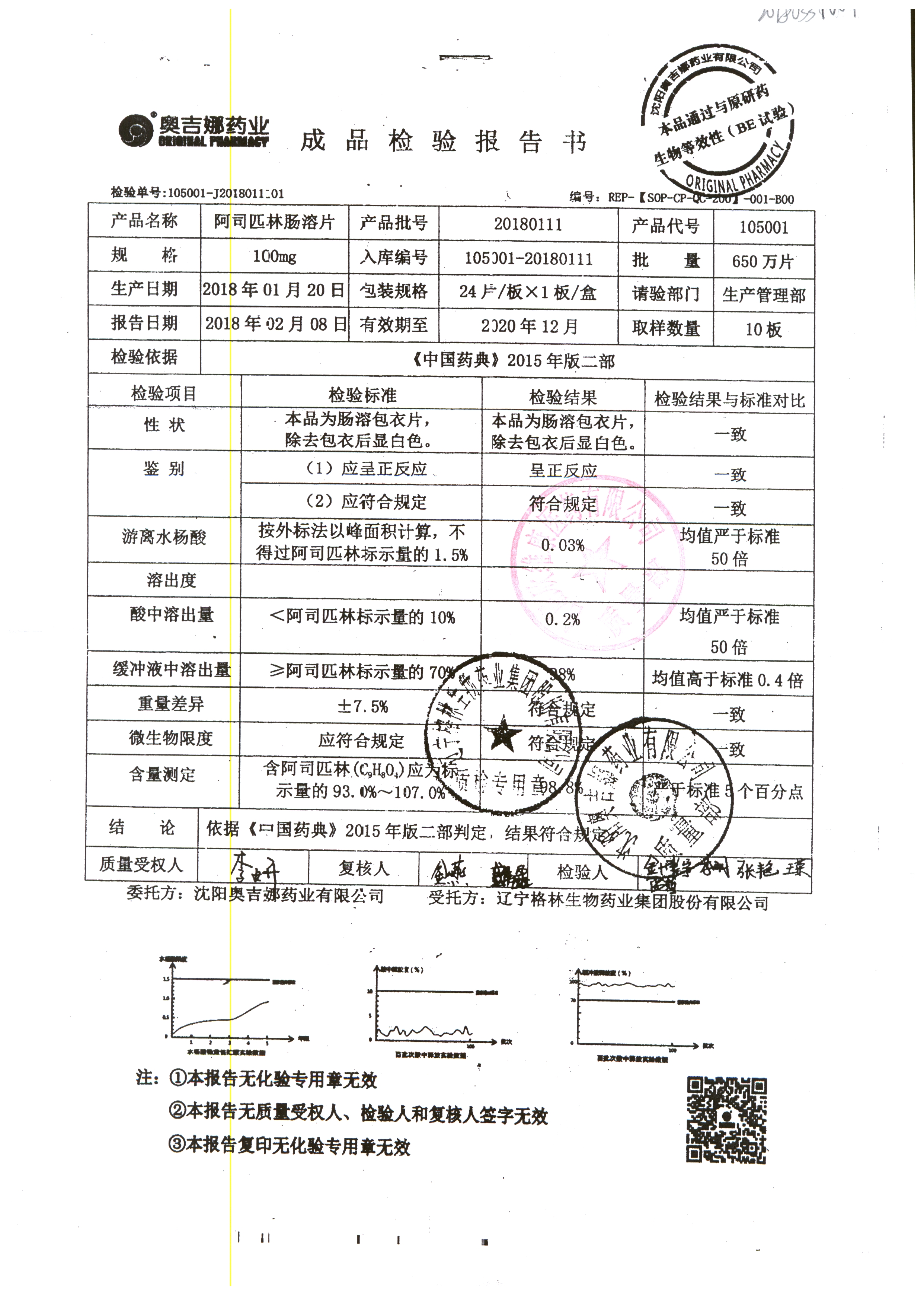 | 阿司匹林腸溶片 | 100mg*24s | 20180111 | 查看詳情 |