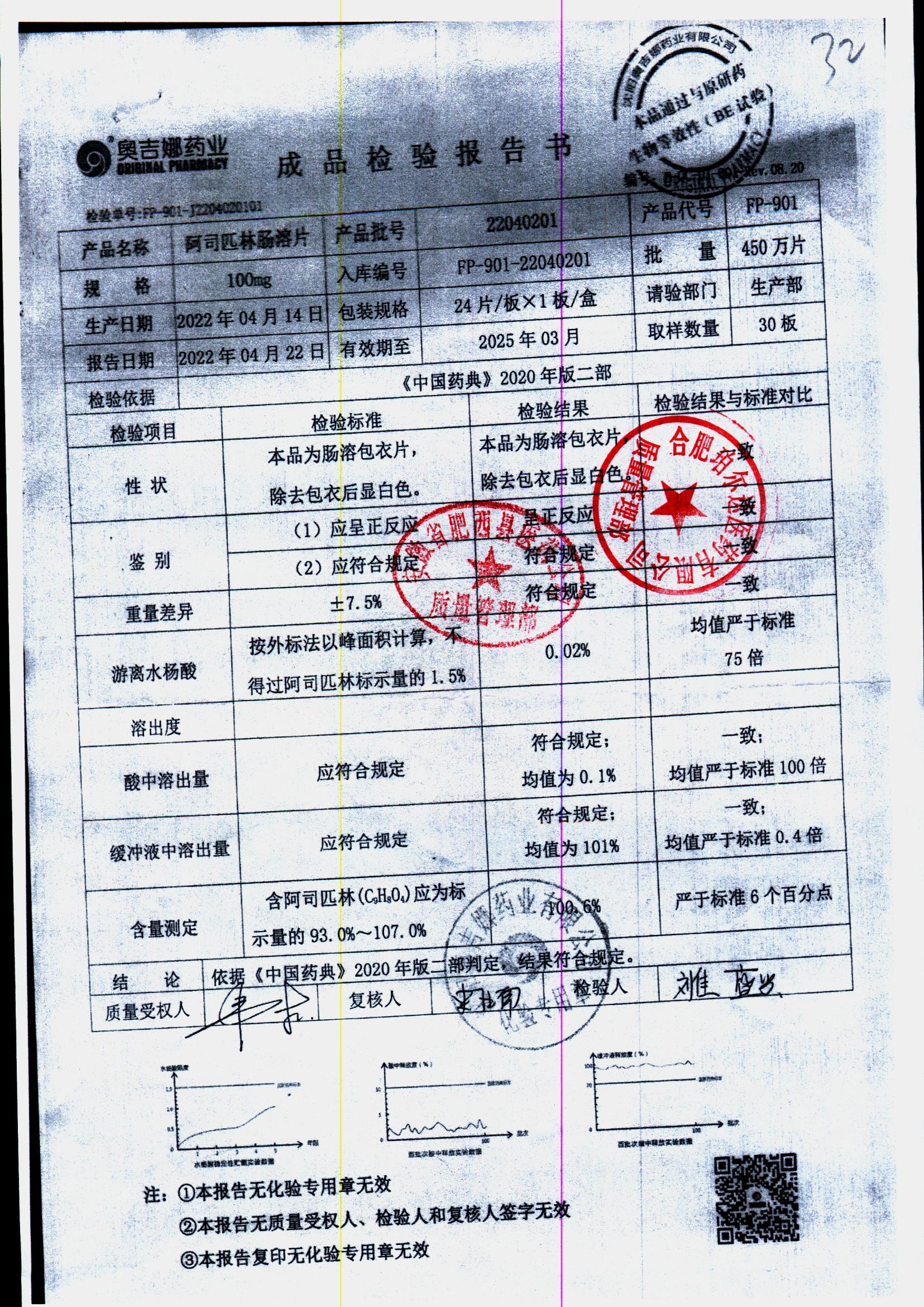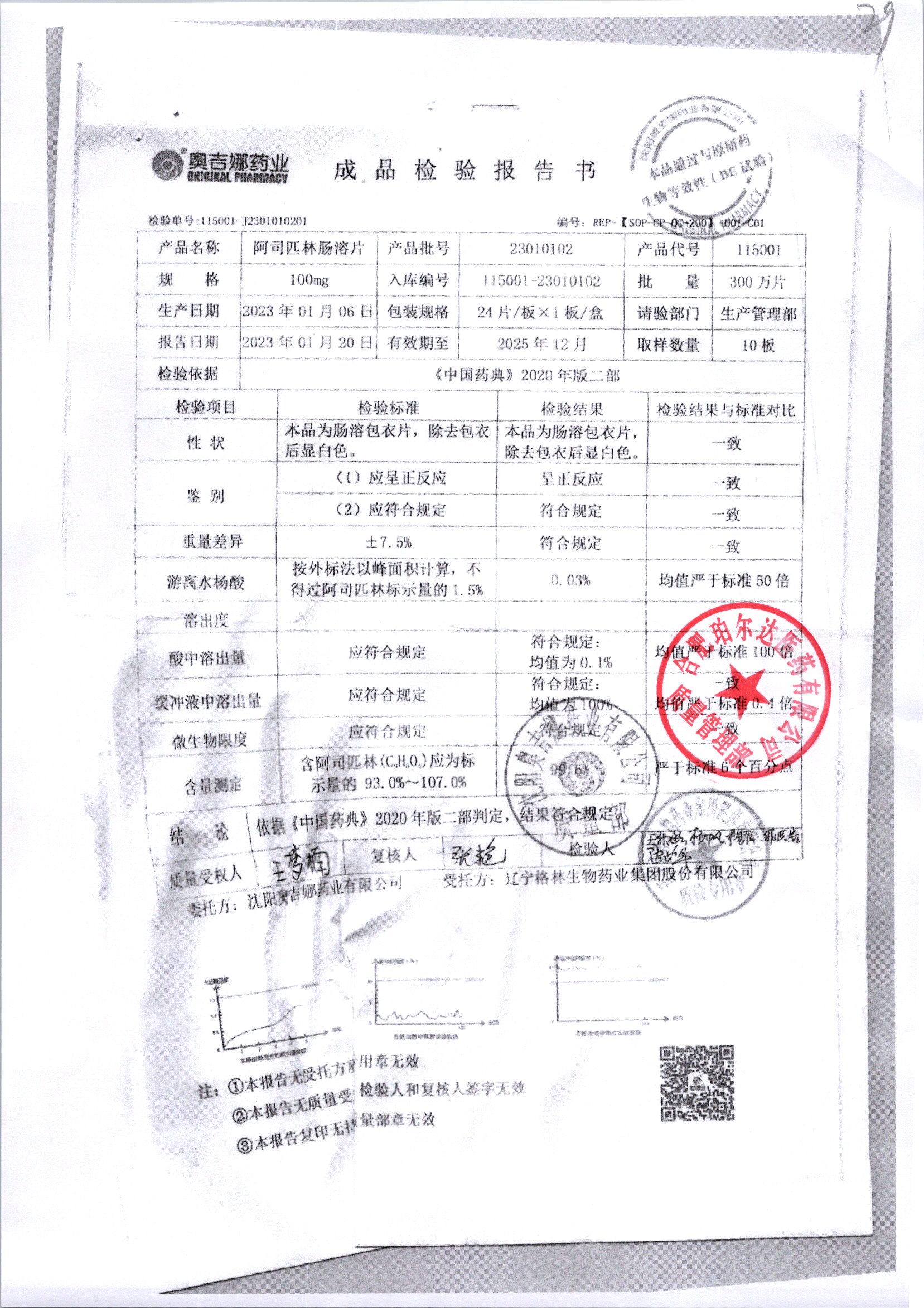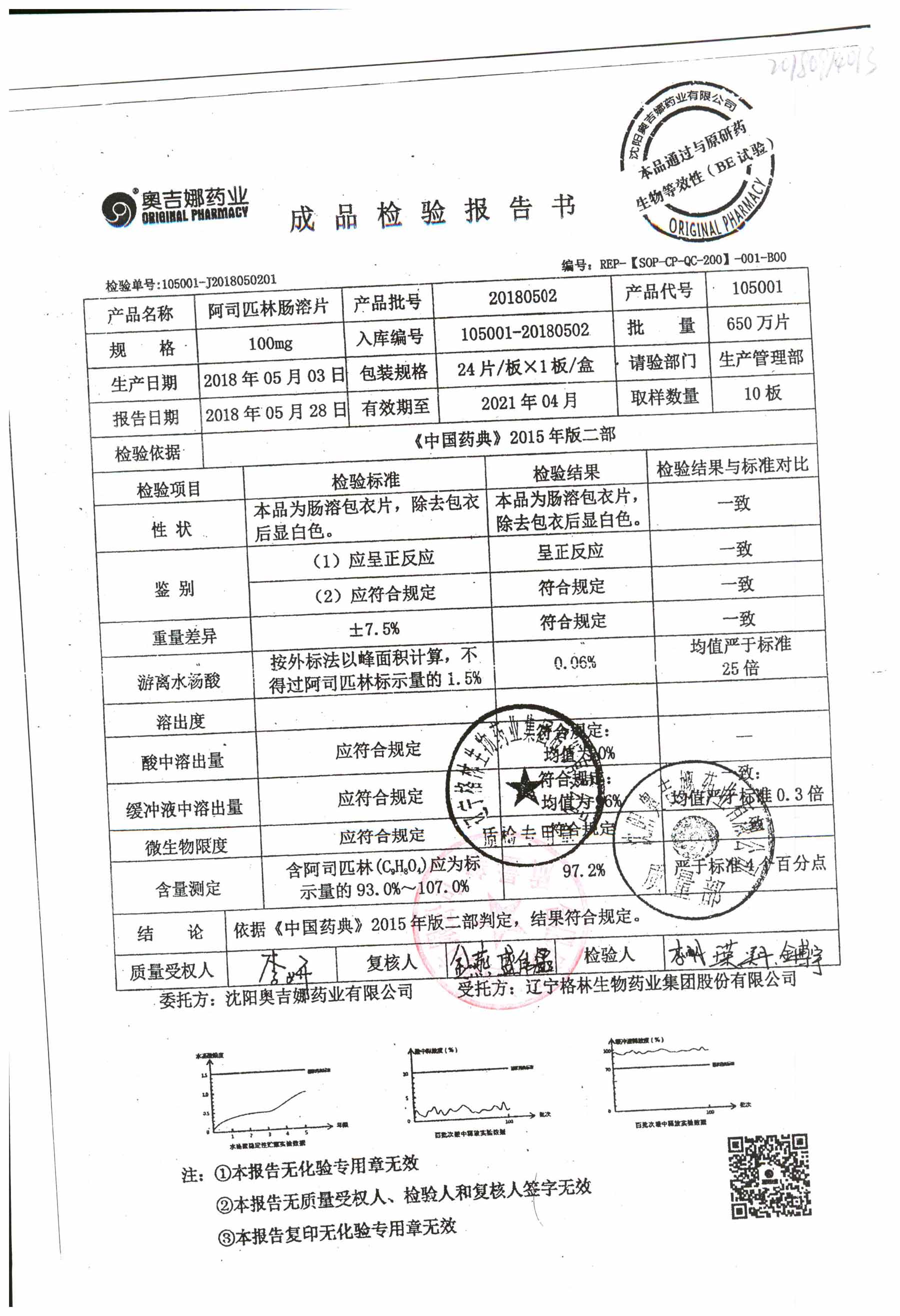 | 阿司匹林腸溶片 | 100mg*24s | 20180502 | 查看詳情 |