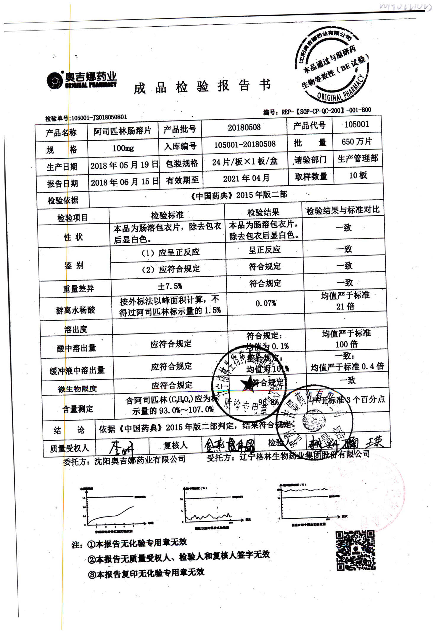 | 阿司匹林腸溶片 | 100mg*24s | 20180508 | 查看詳情 |