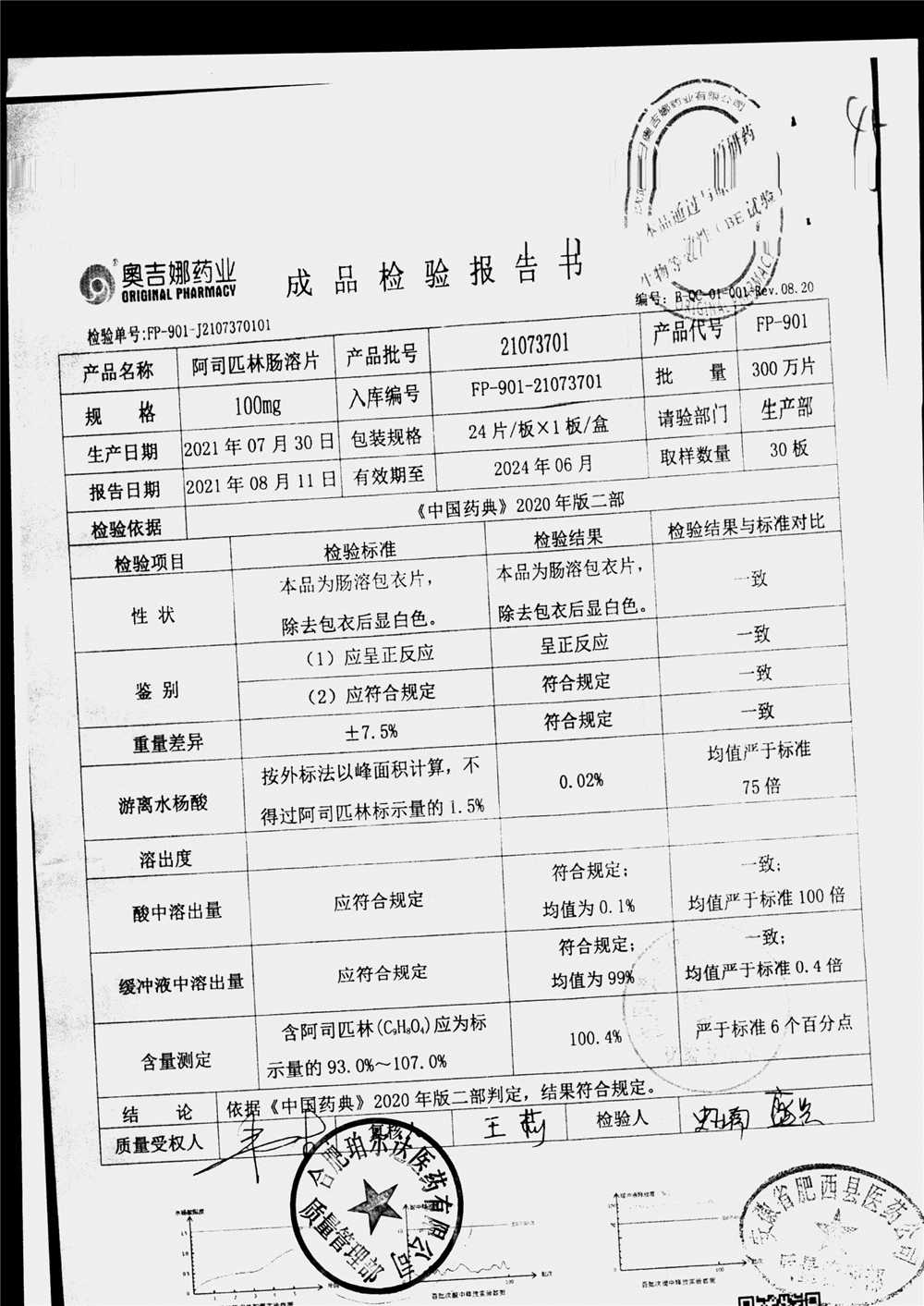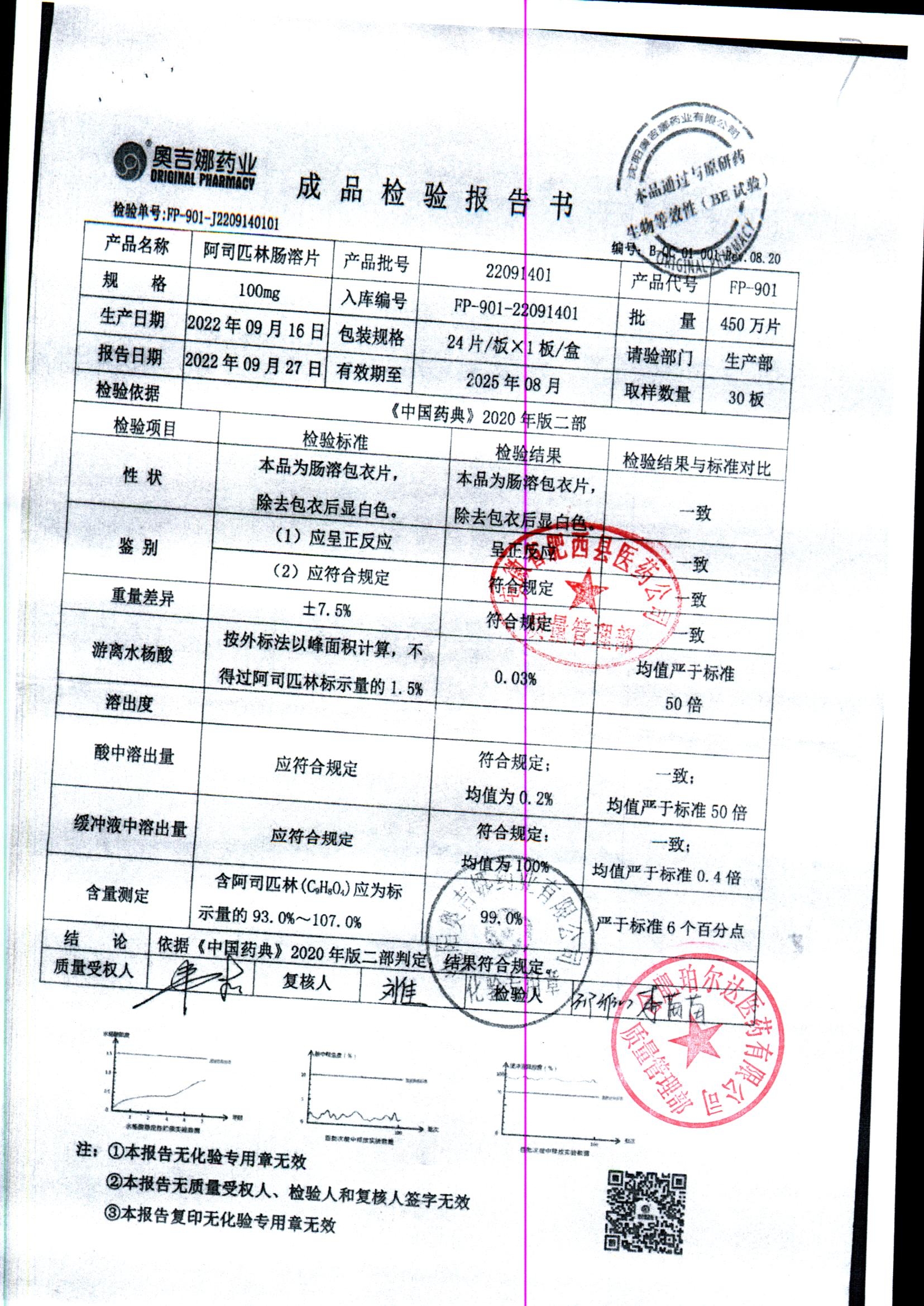 | 阿司匹林腸溶片 | 100mg*24s | 22091401 | 查看詳情 |