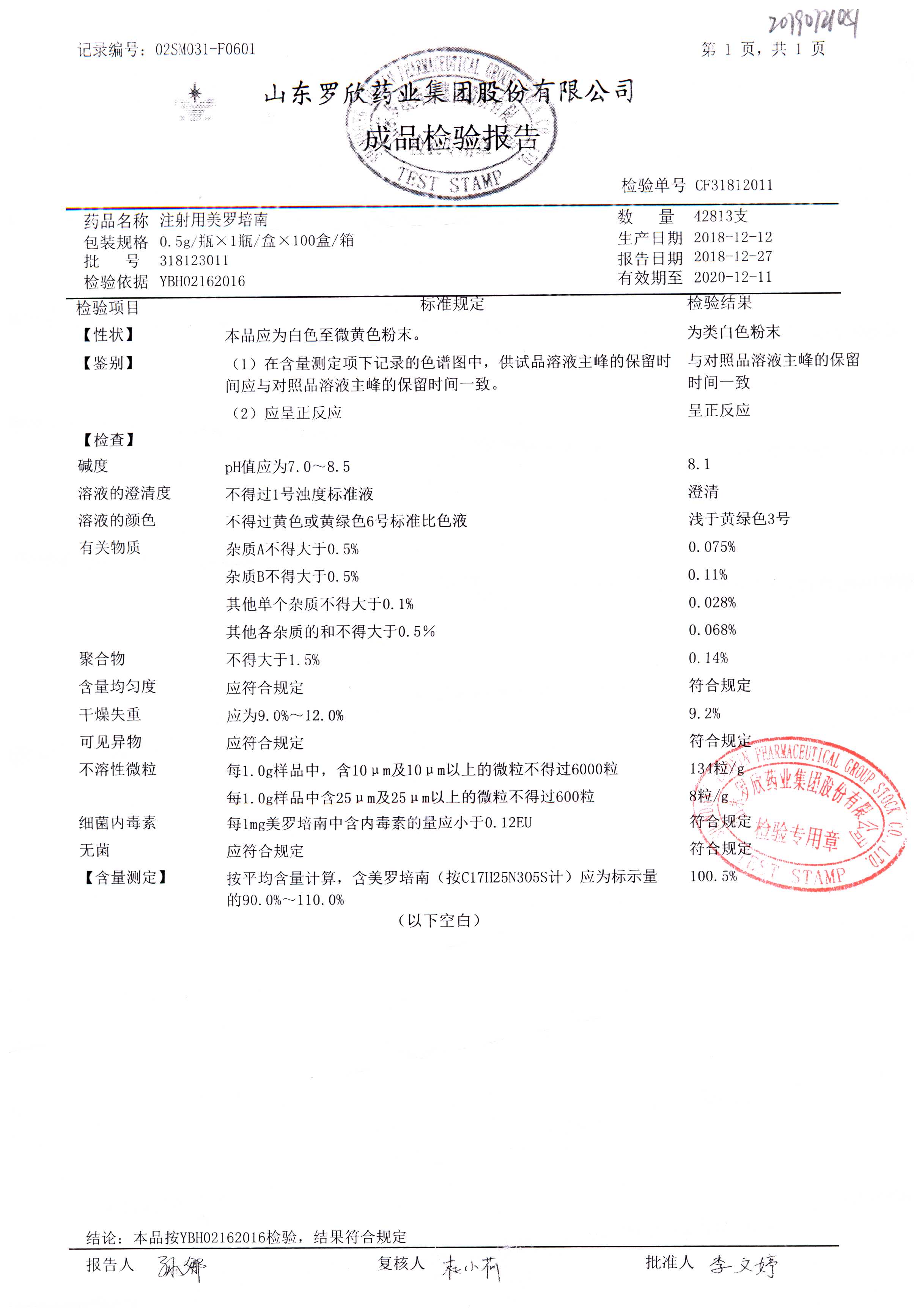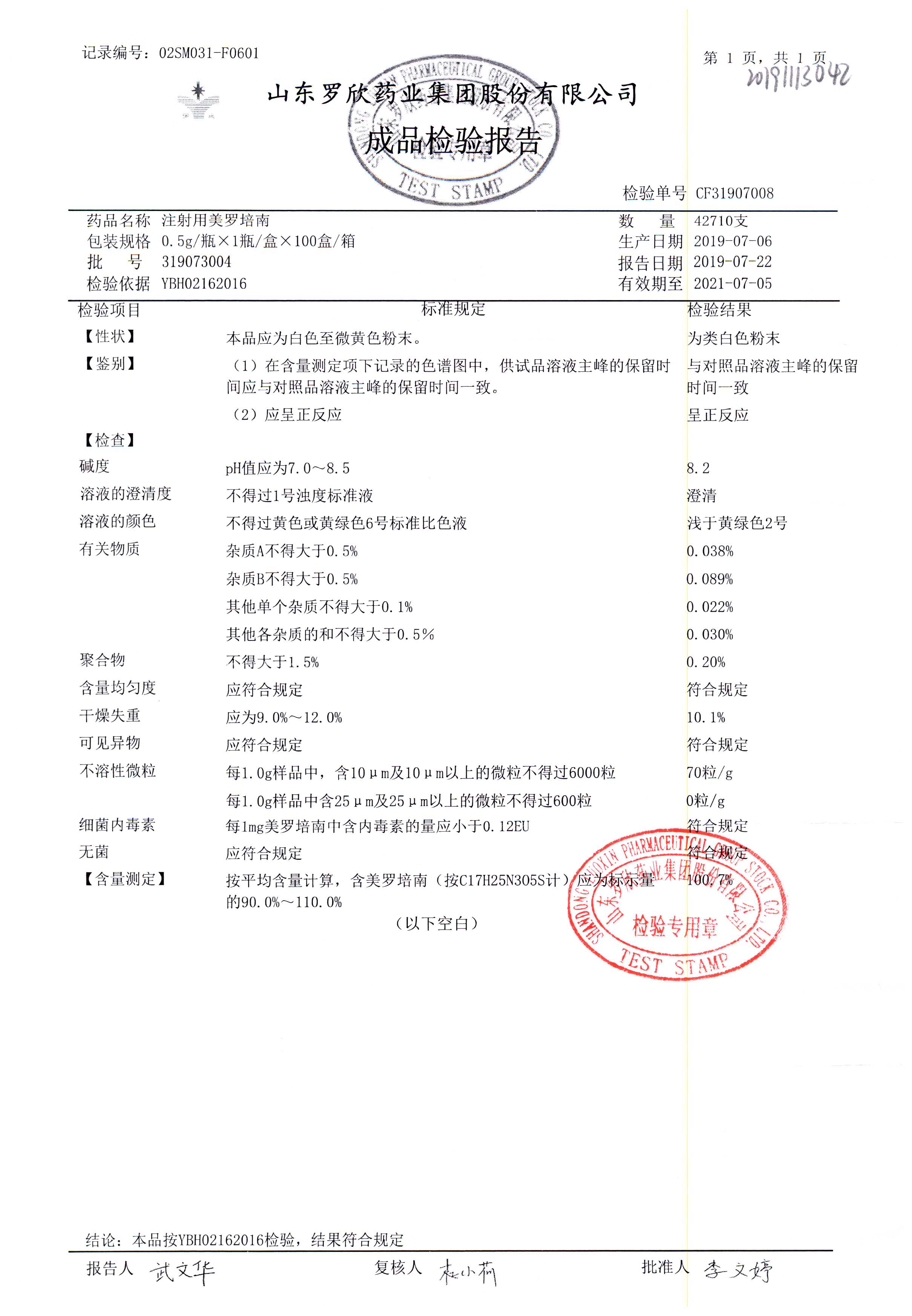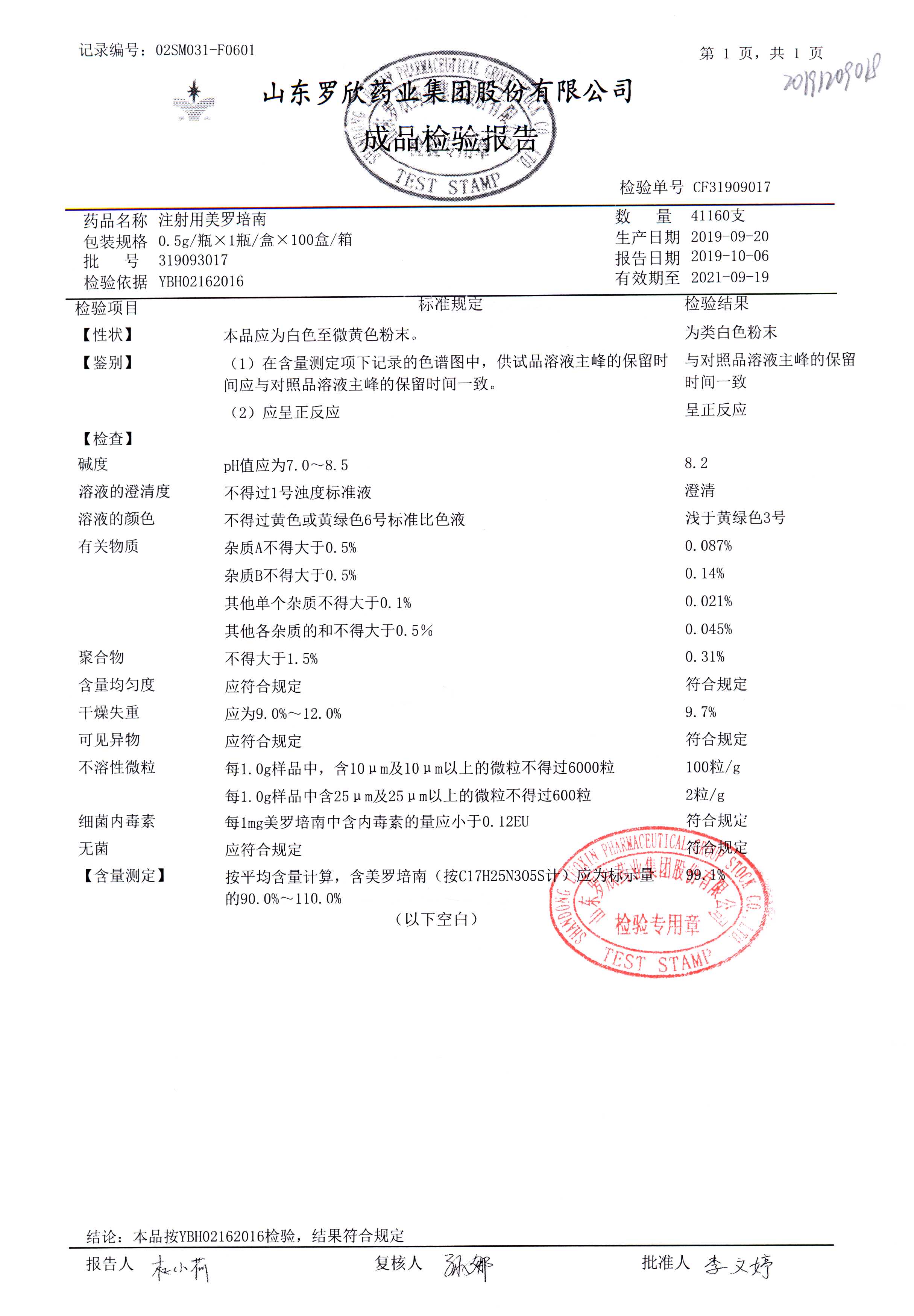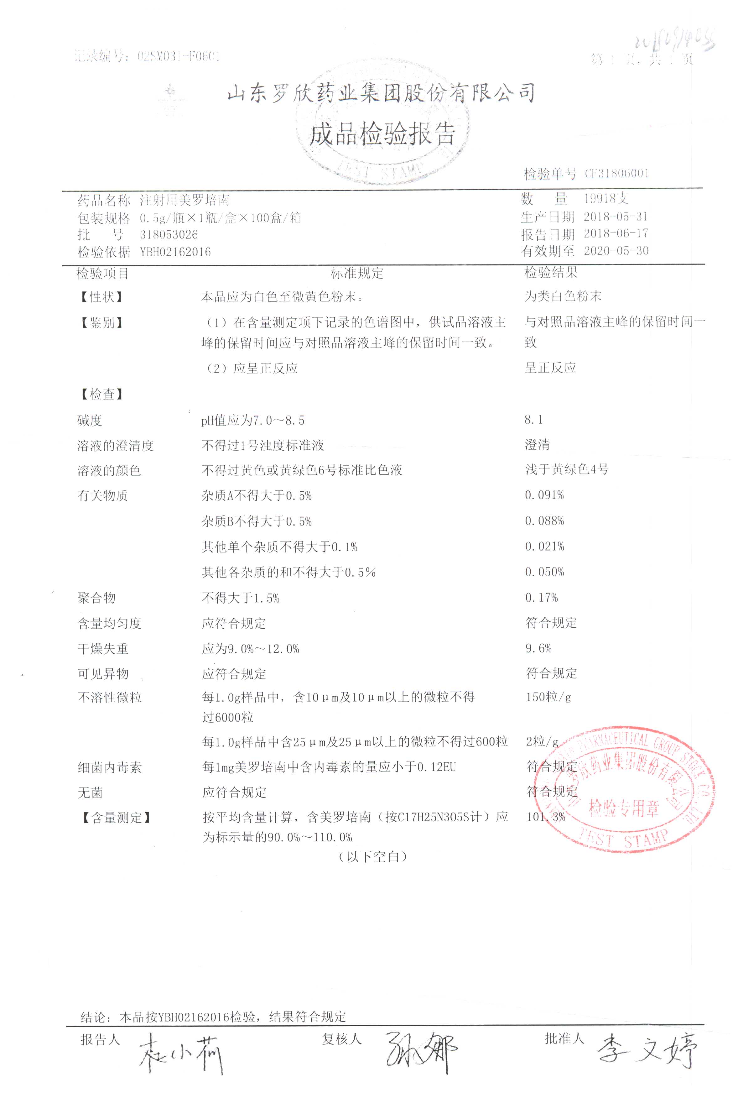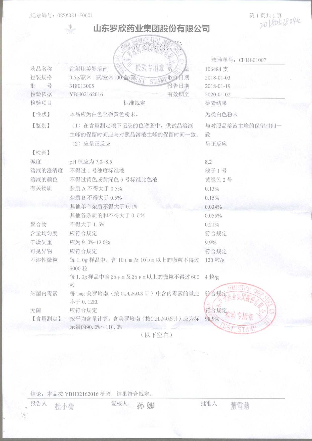 | 注射用美羅培南 | 0.5g | 318053026 | 查看詳情 |