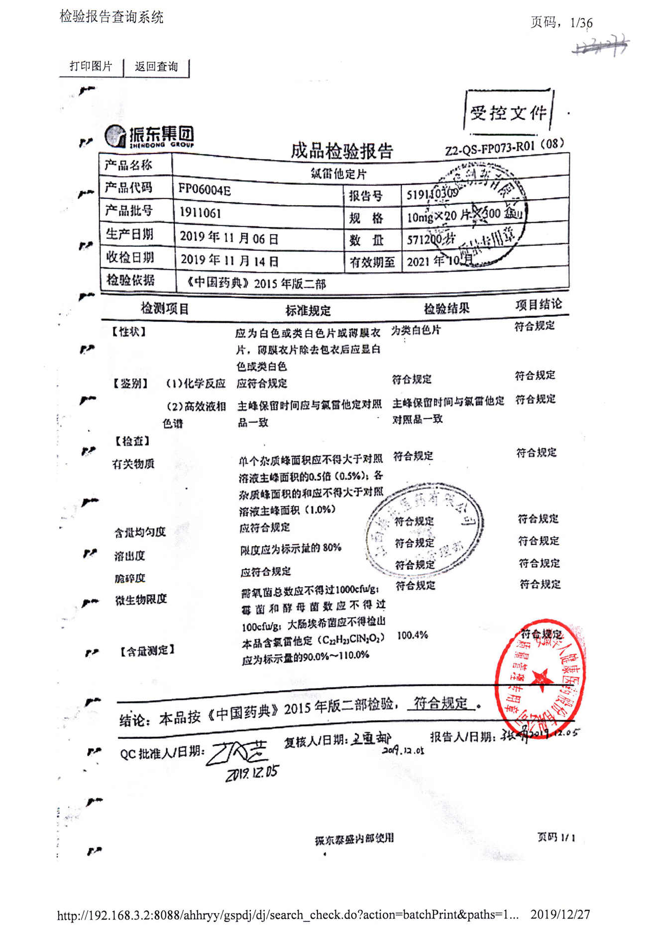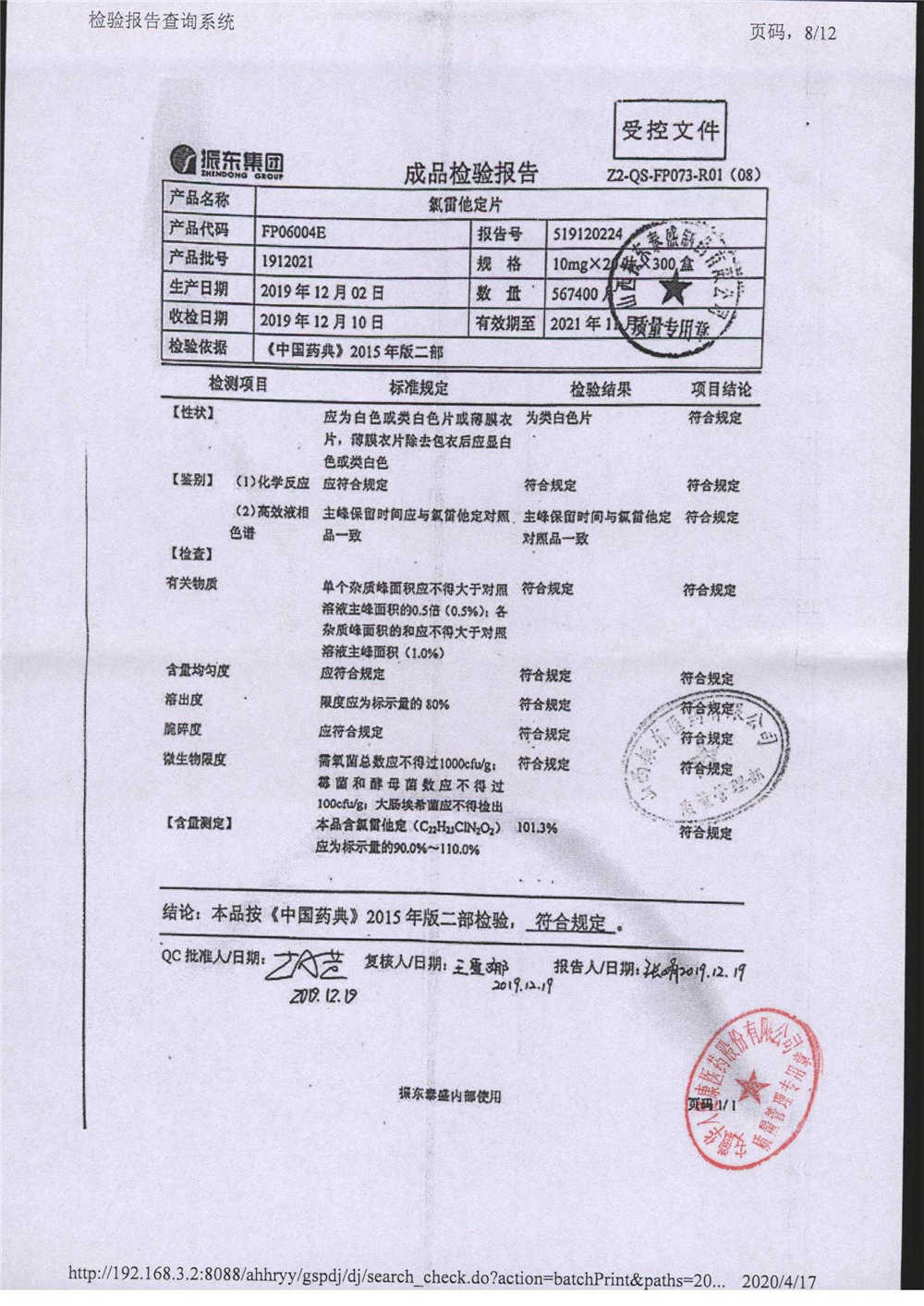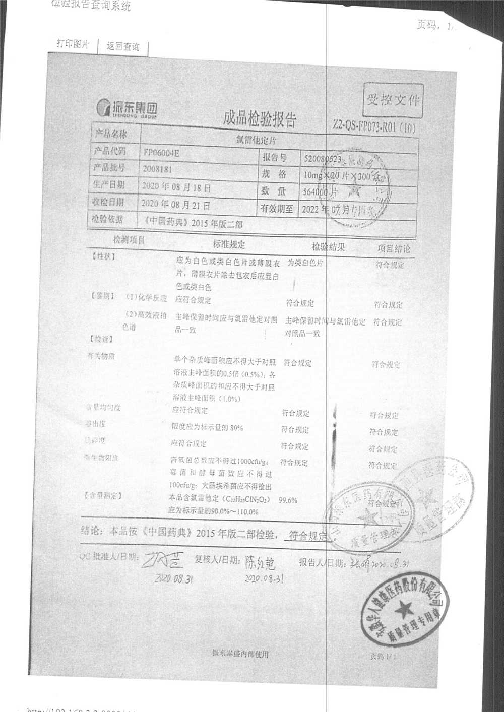 | 氯雷他定片 | 10mg*20s | 1908231(2/2) | 查看詳情 |