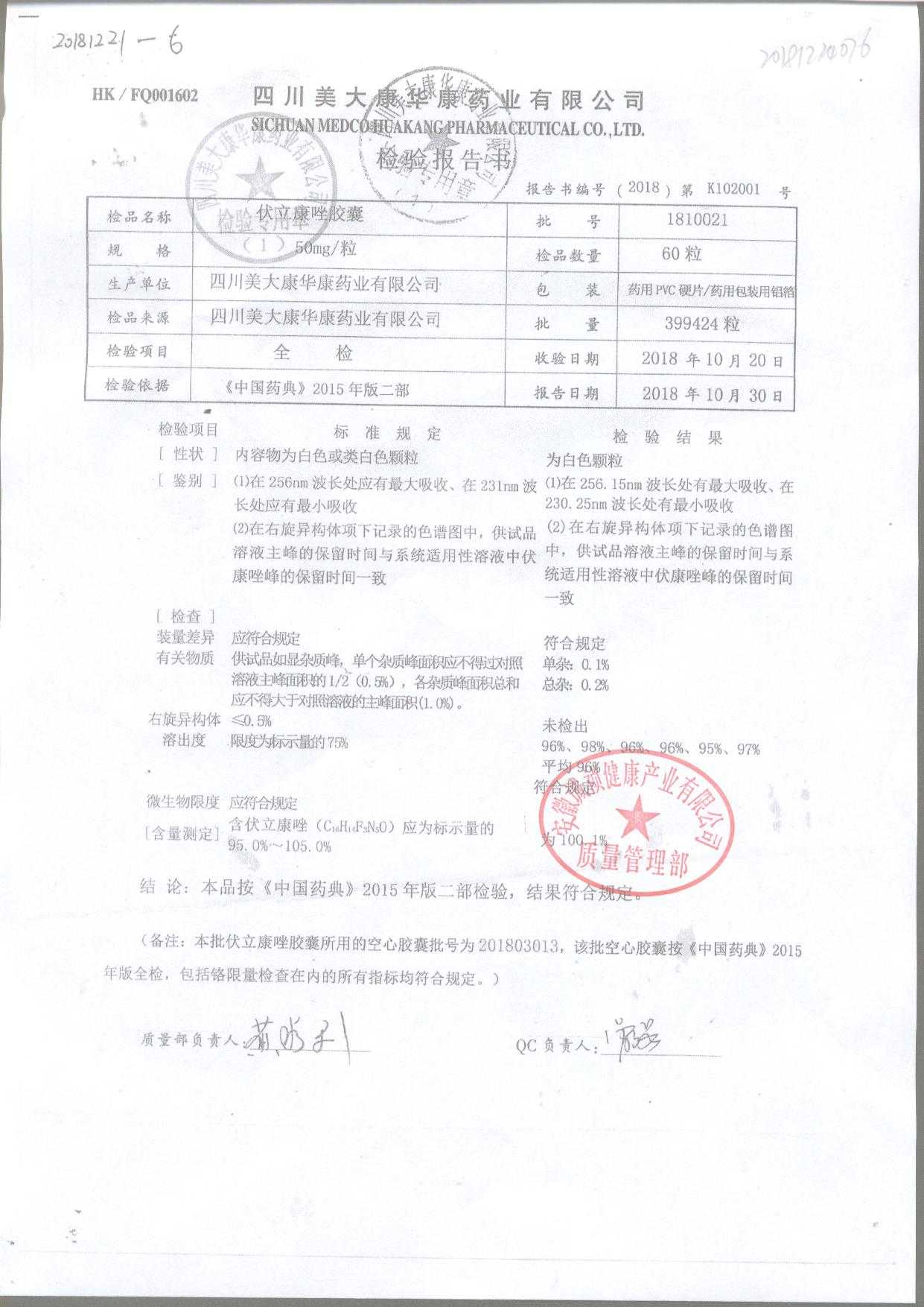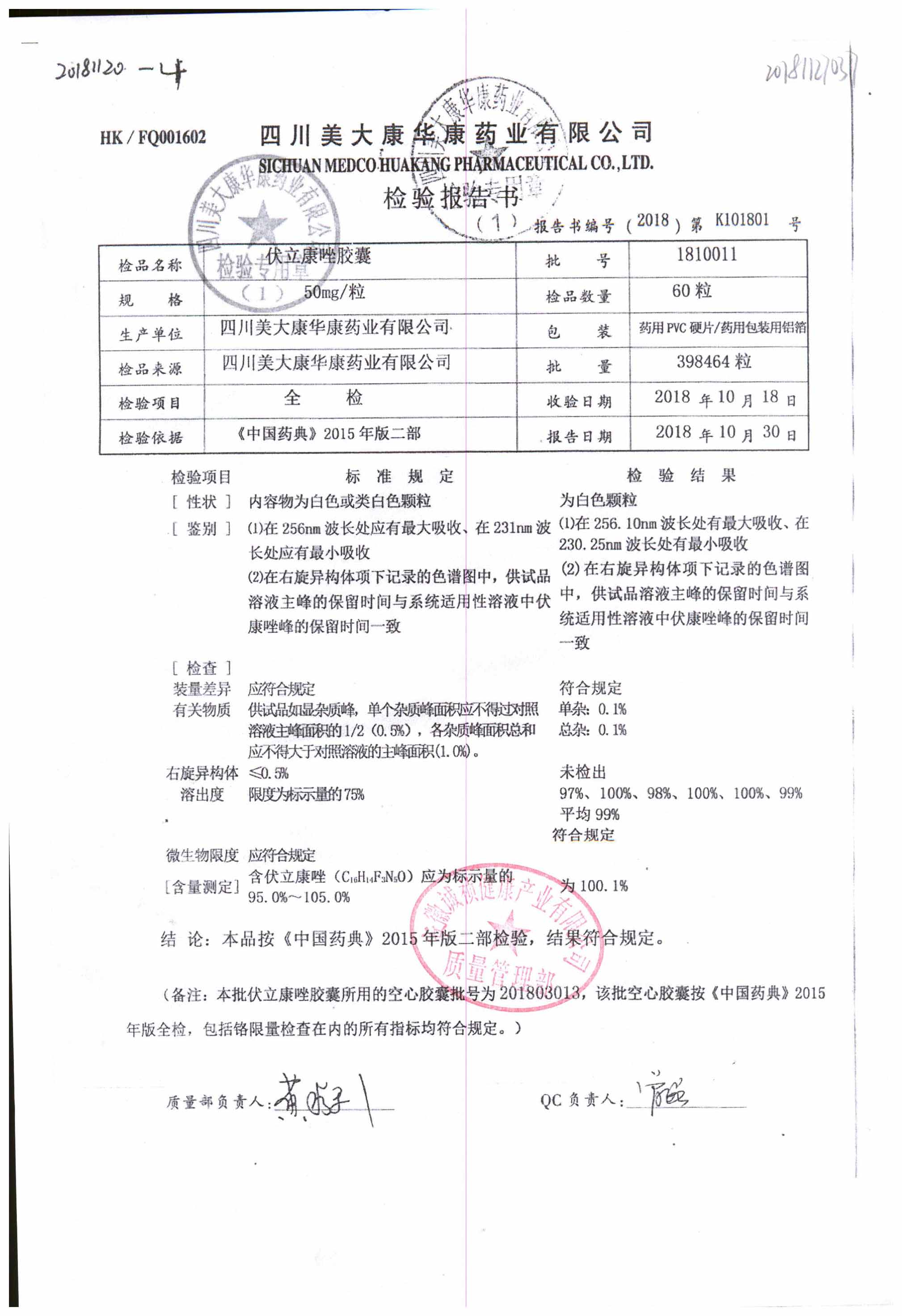 | 伏立康唑膠囊 | 50mg | 1812011 | 查看詳情 |