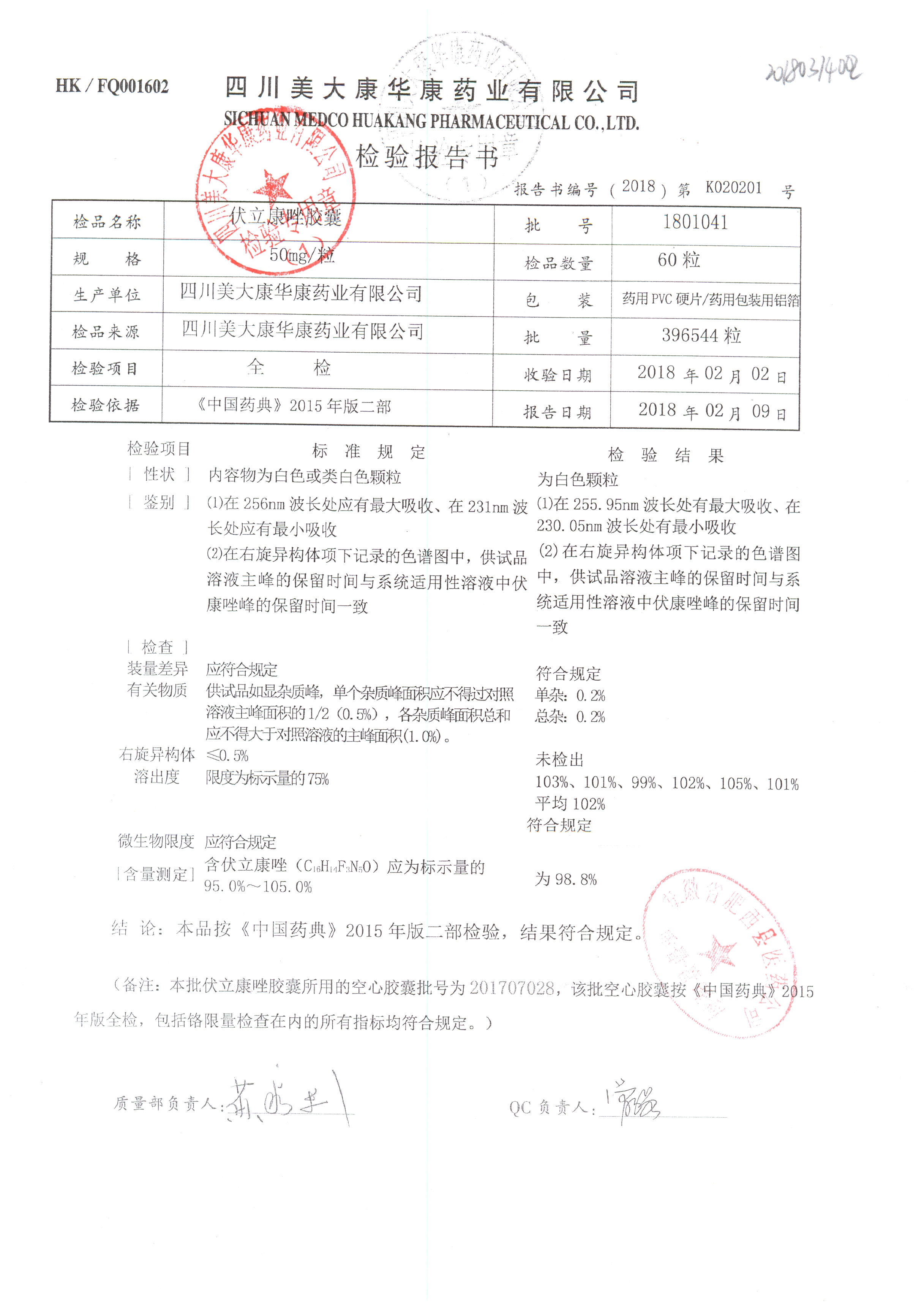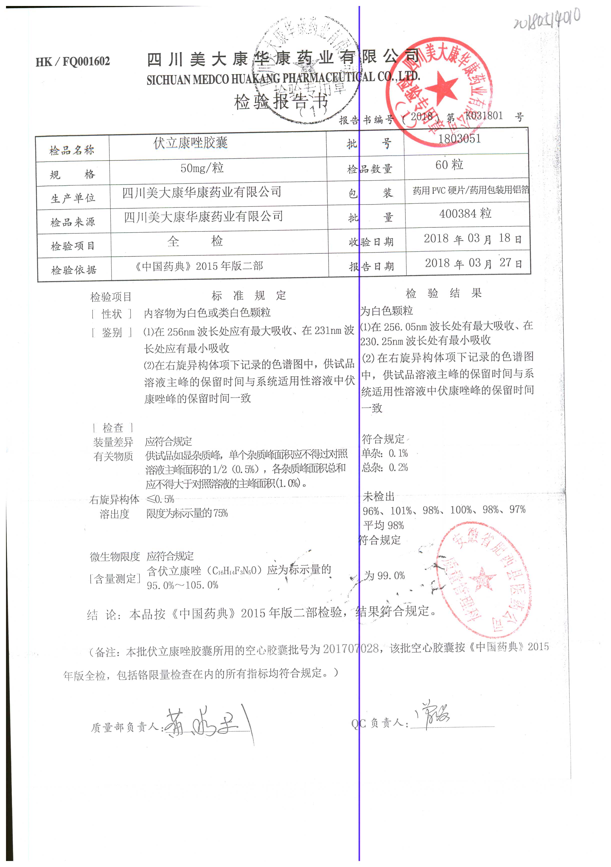 | 伏立康唑膠囊 | 50mg | 1803051 | 查看詳情 |
