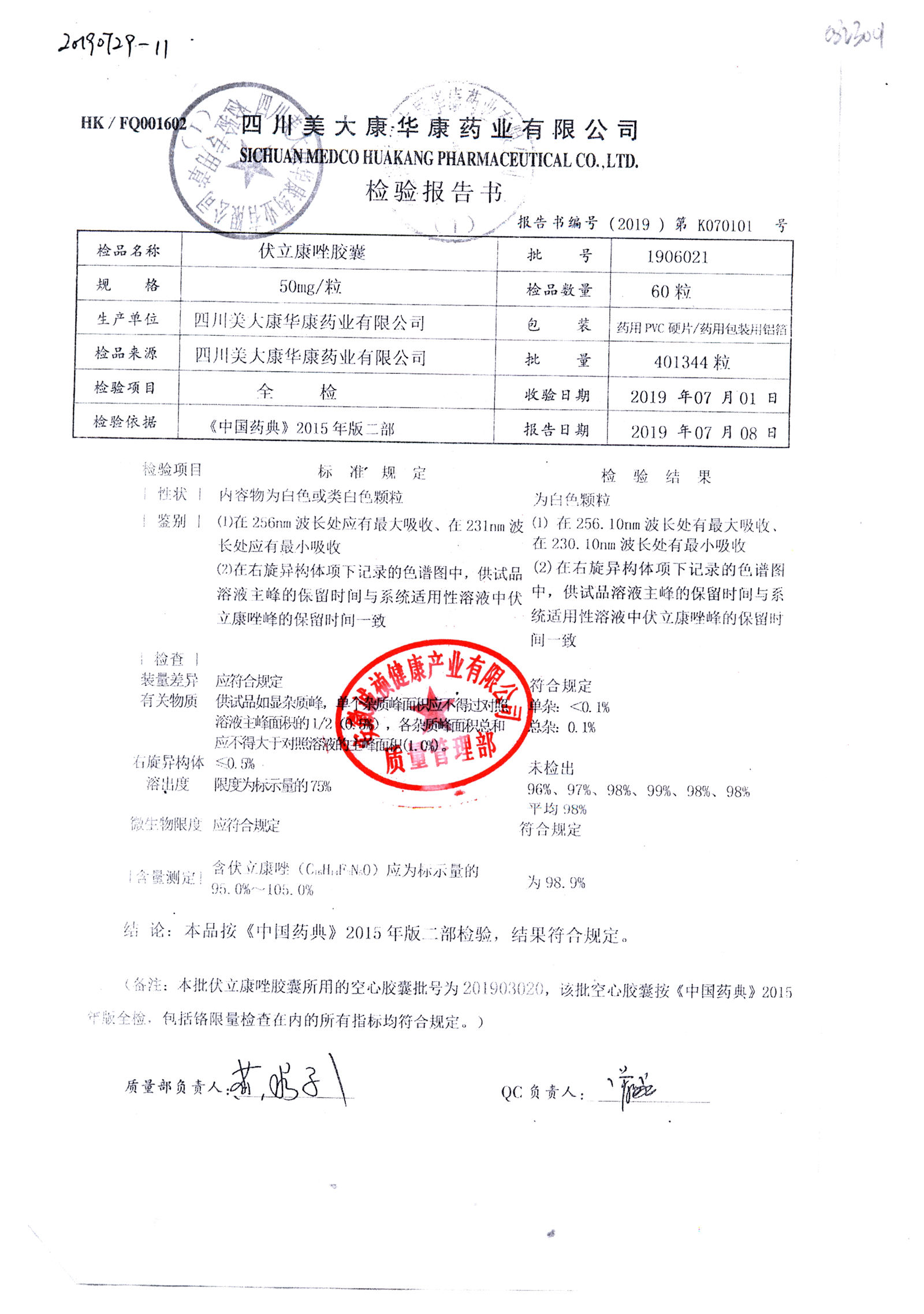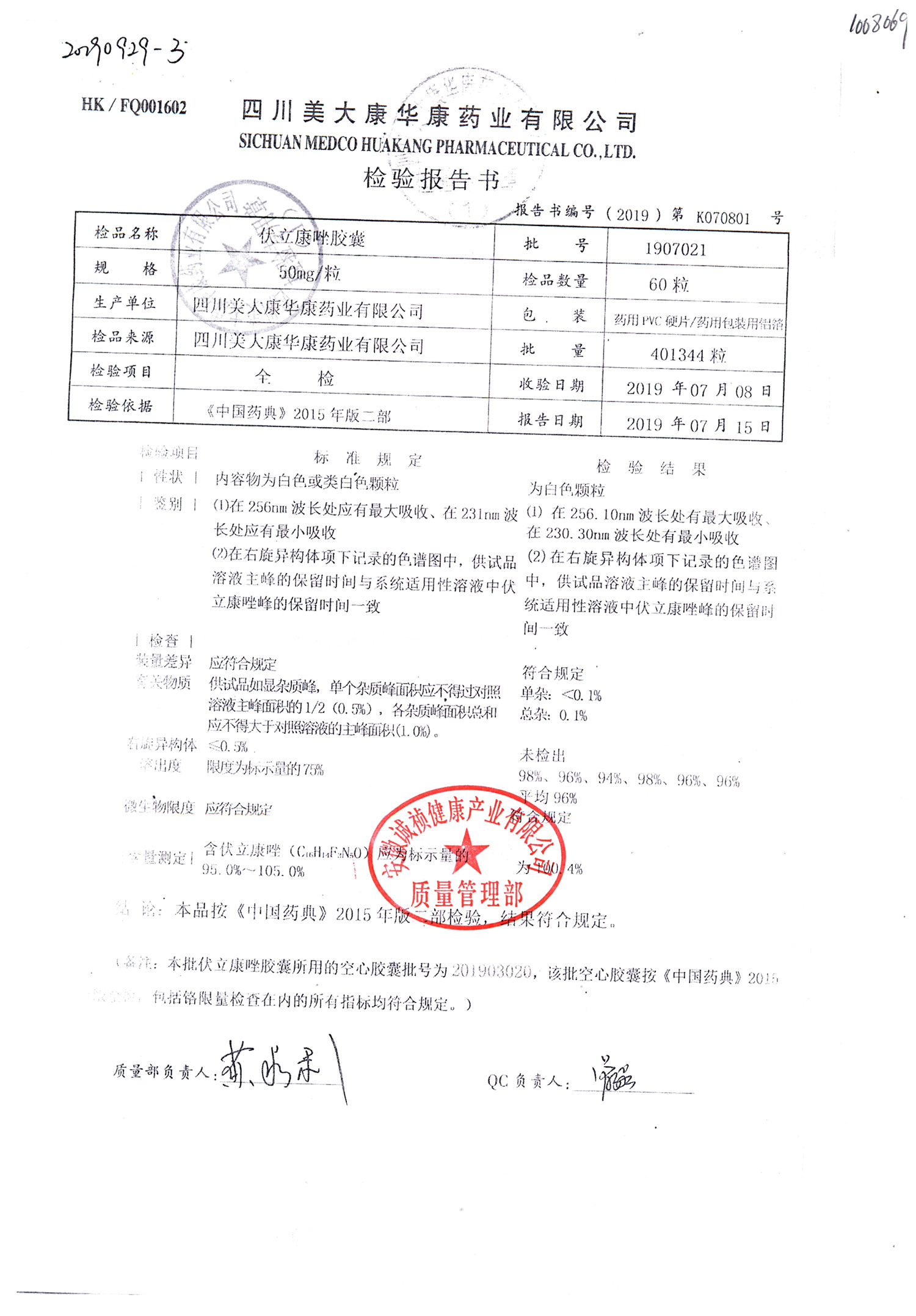 | 伏立康唑膠囊 | 50mg | 1906021 | 查看詳情 |