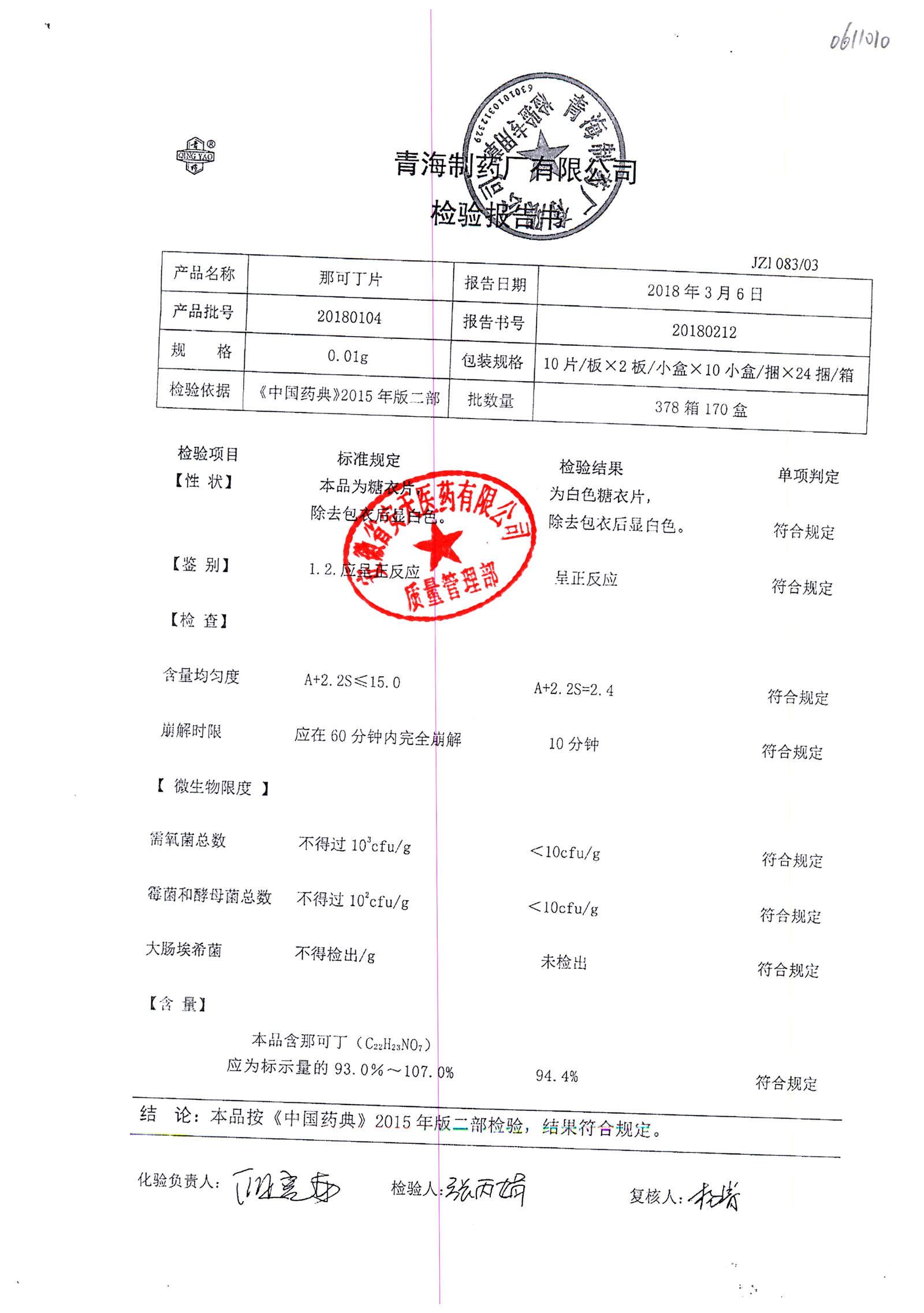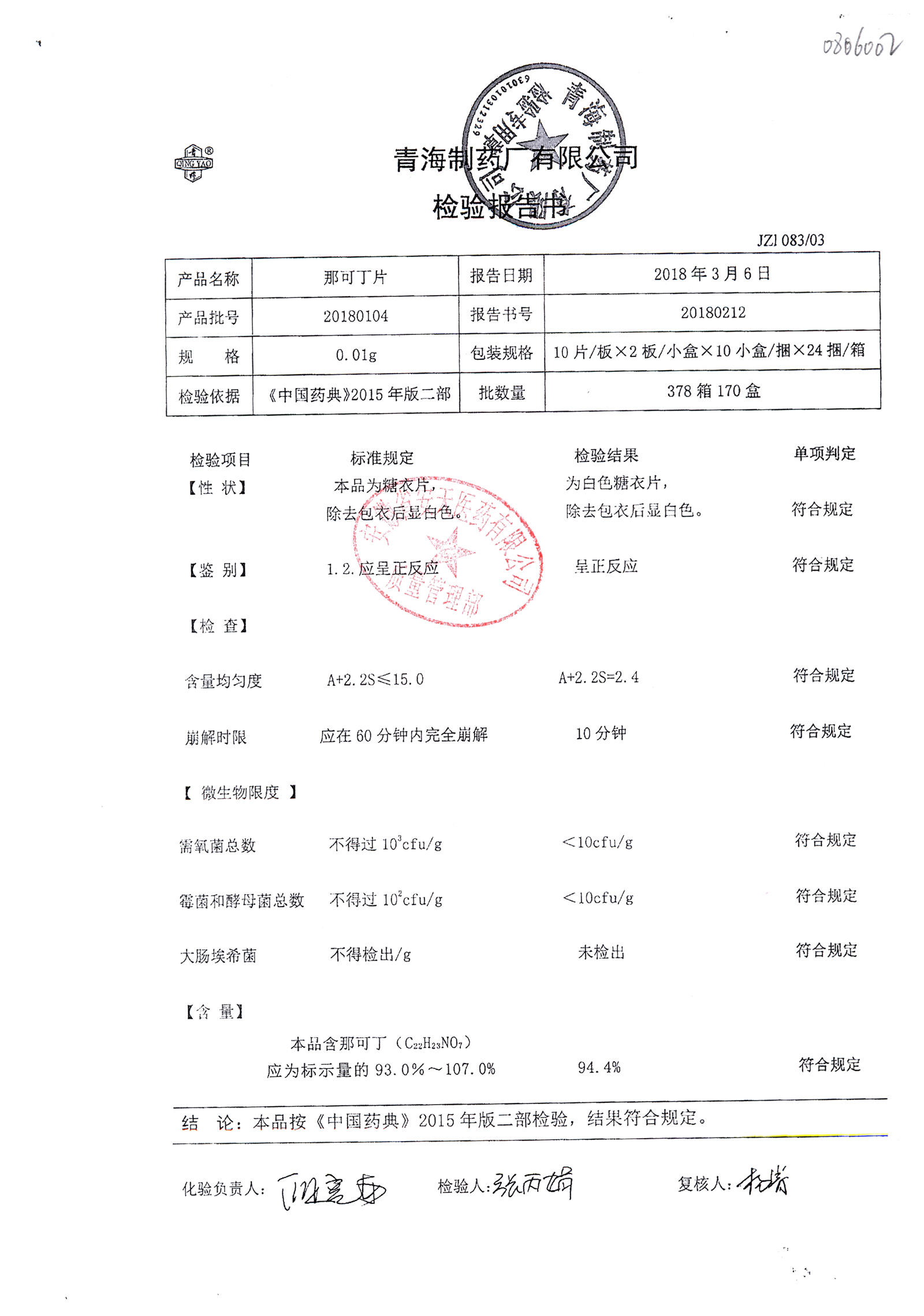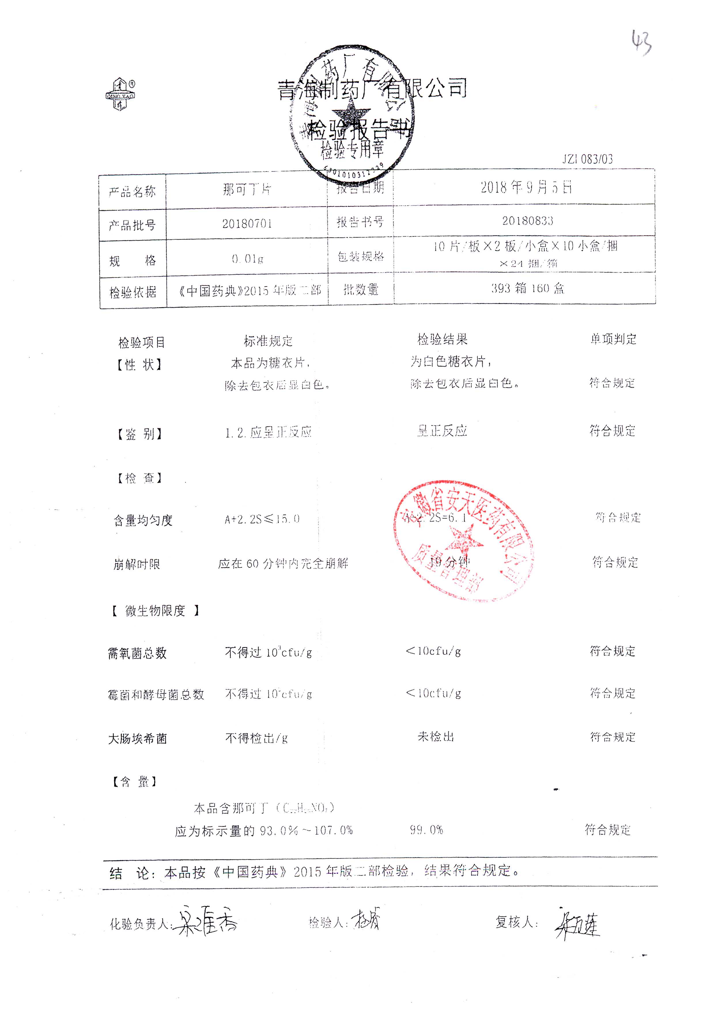 | 那可丁片 | 0.01g | 20180212 | 查看詳情 |