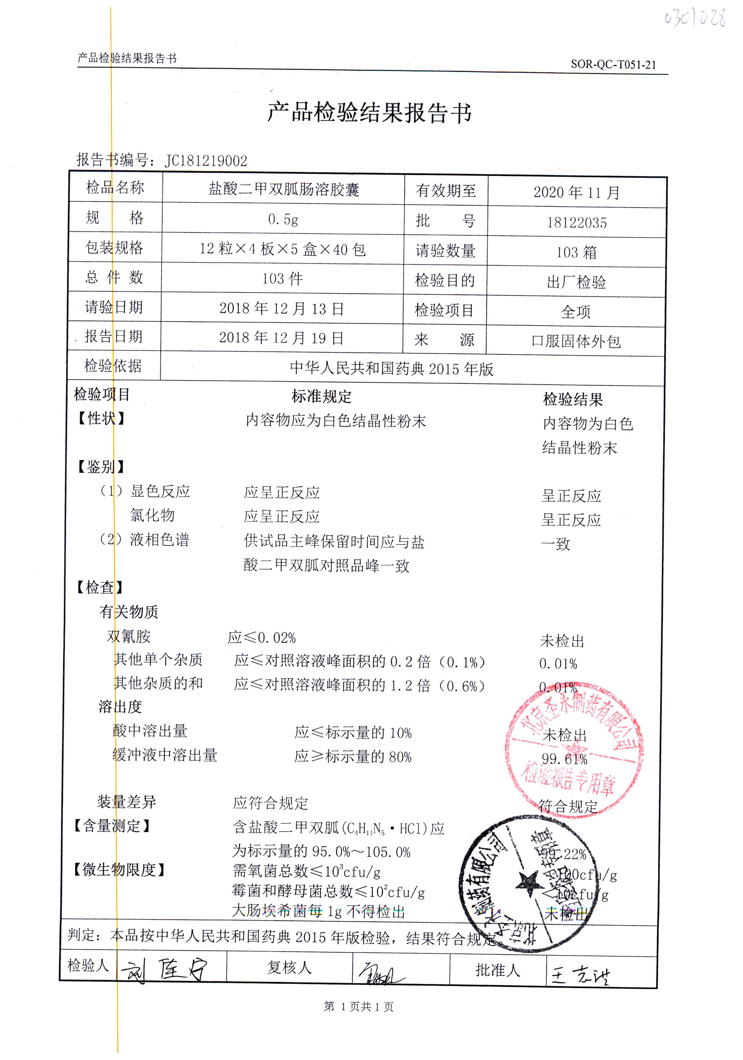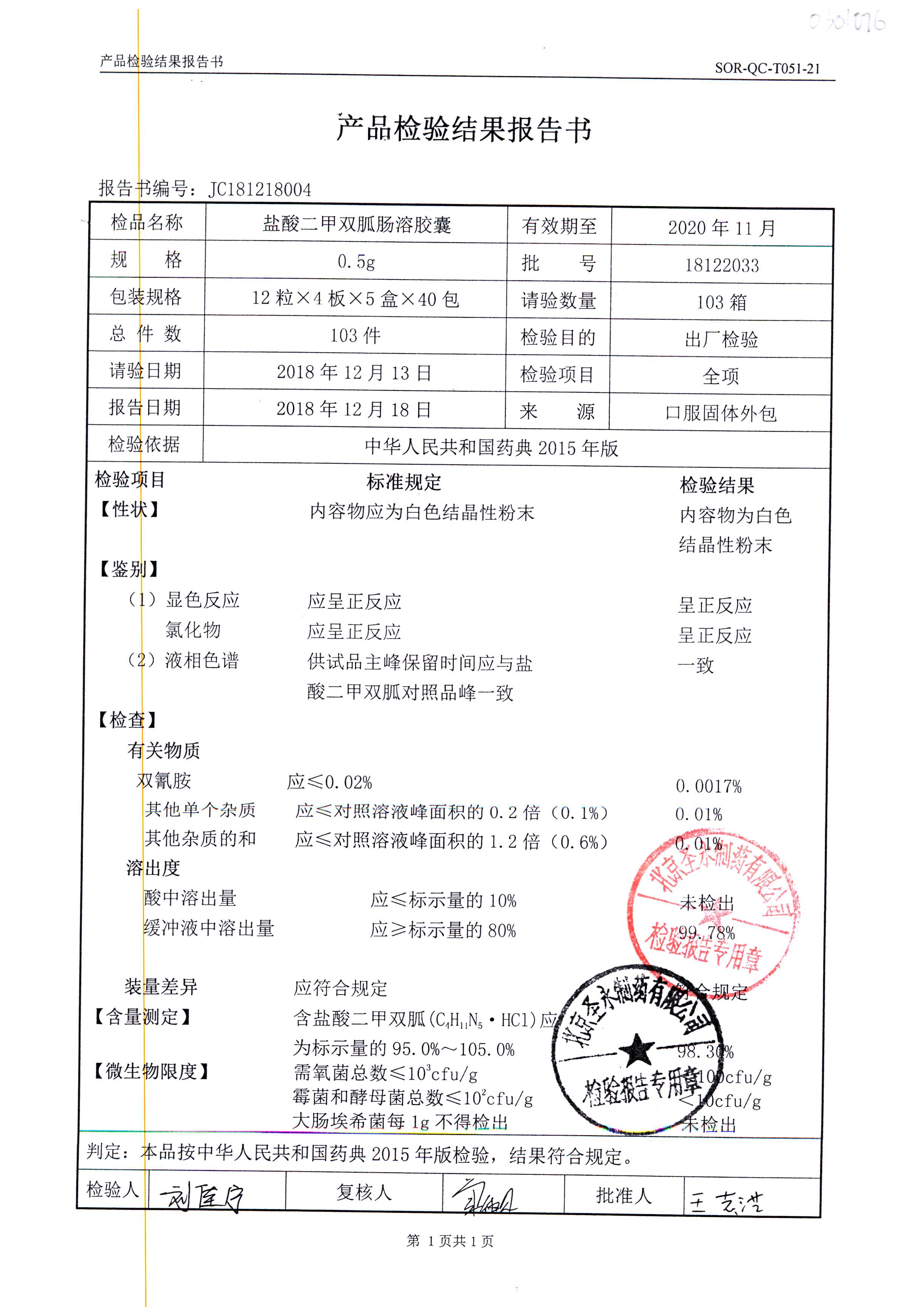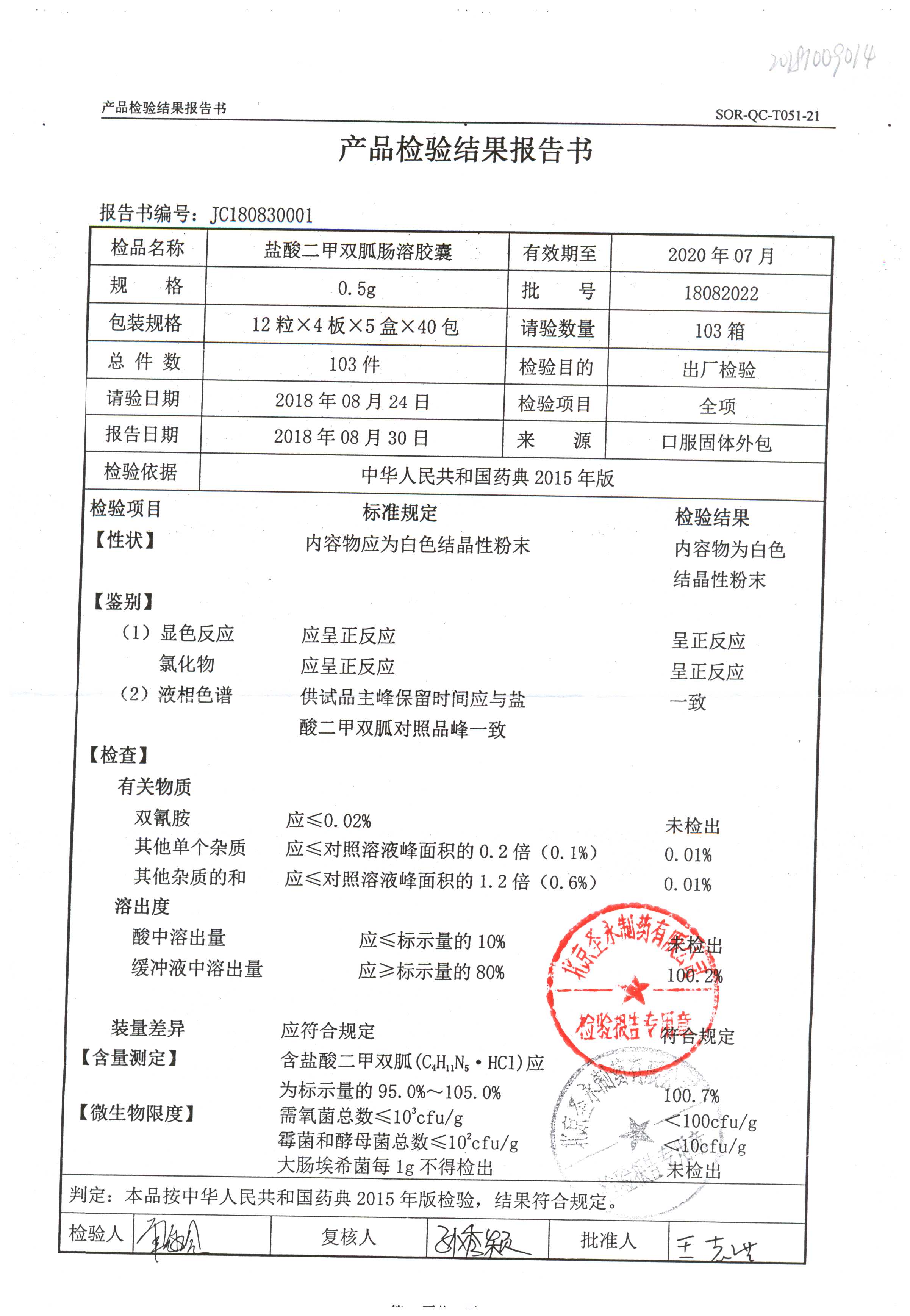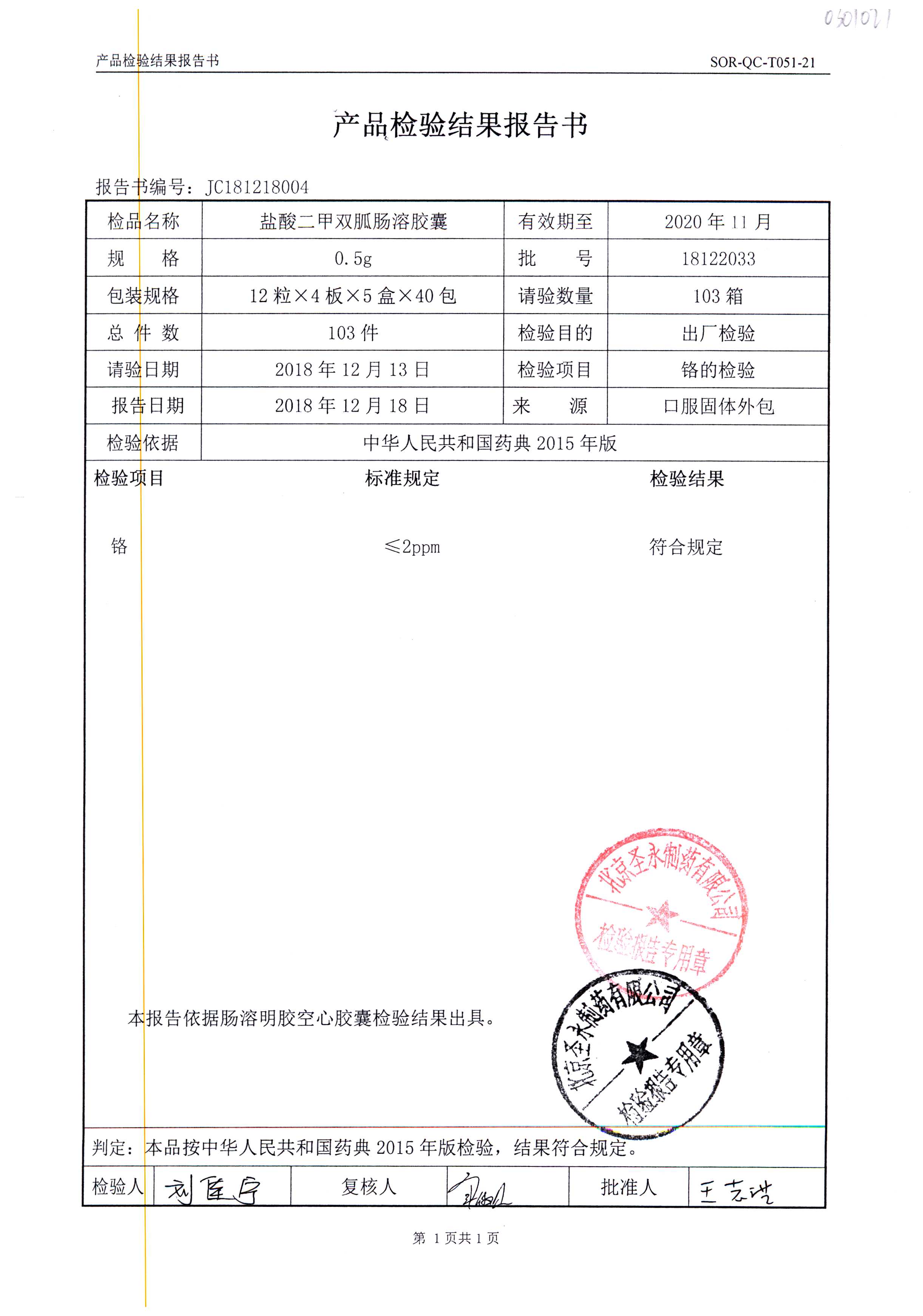 | 鹽酸二甲雙胍腸溶膠囊 | 0.5g*48s | 18092031(1/2) | 查看詳情 |