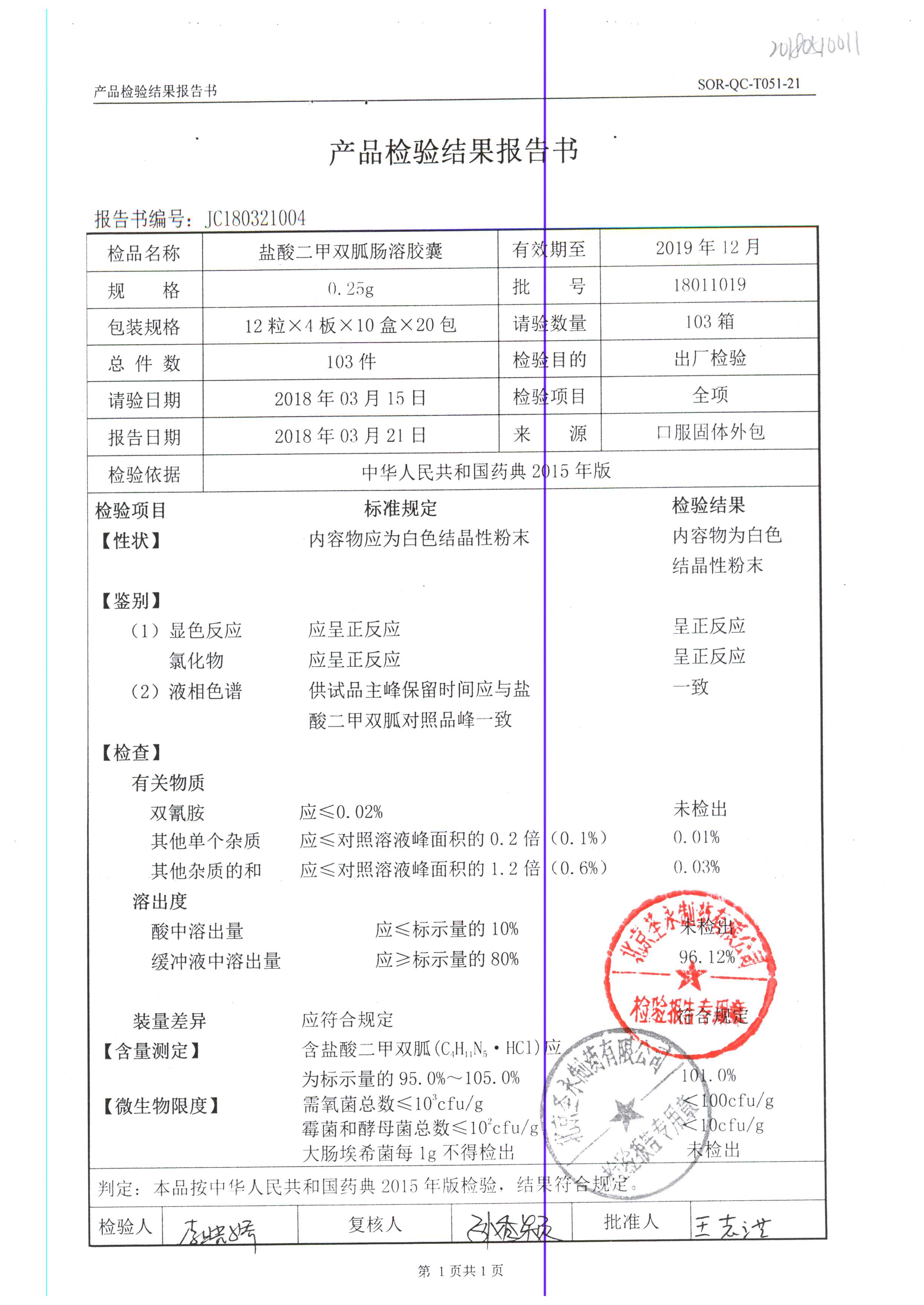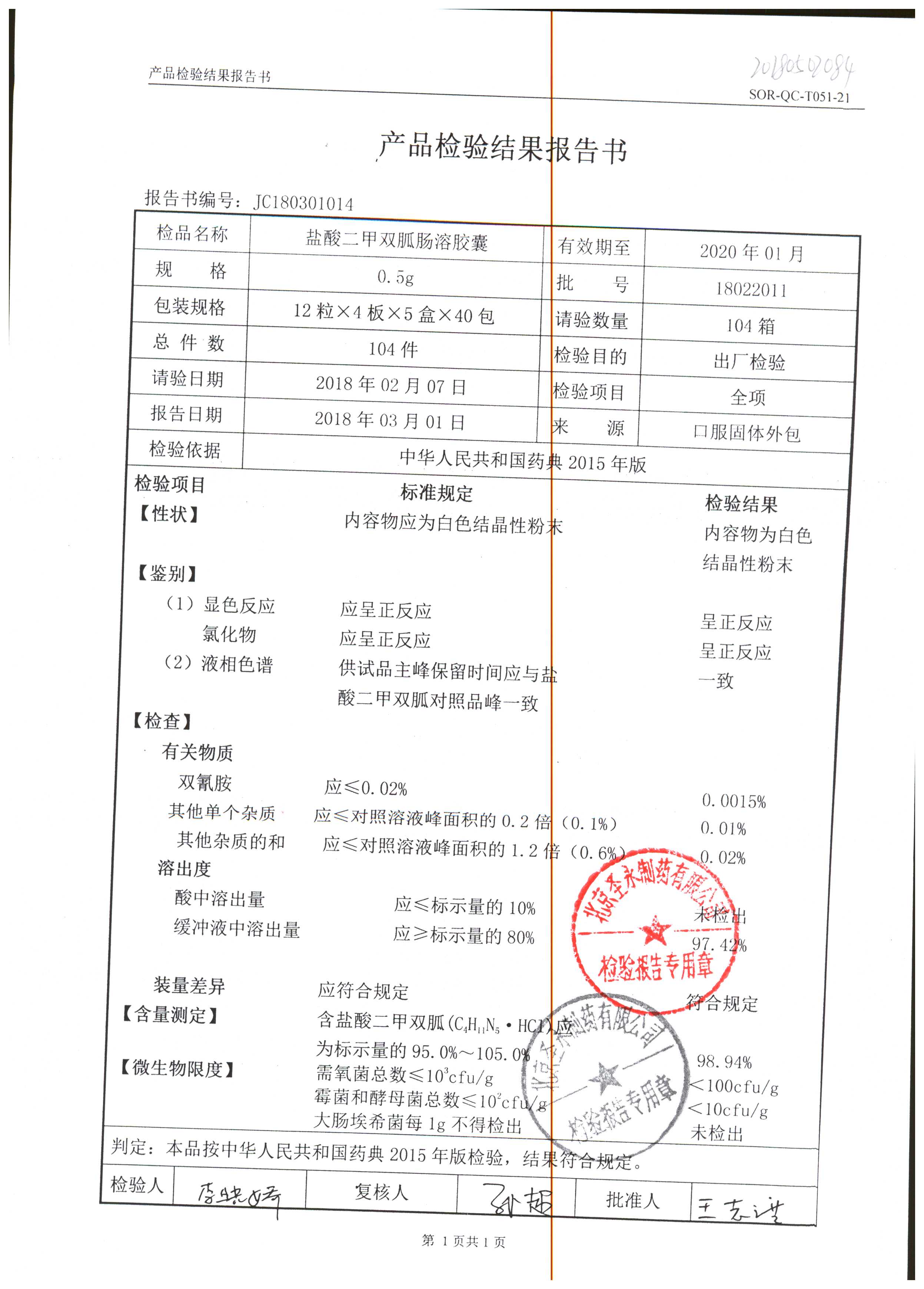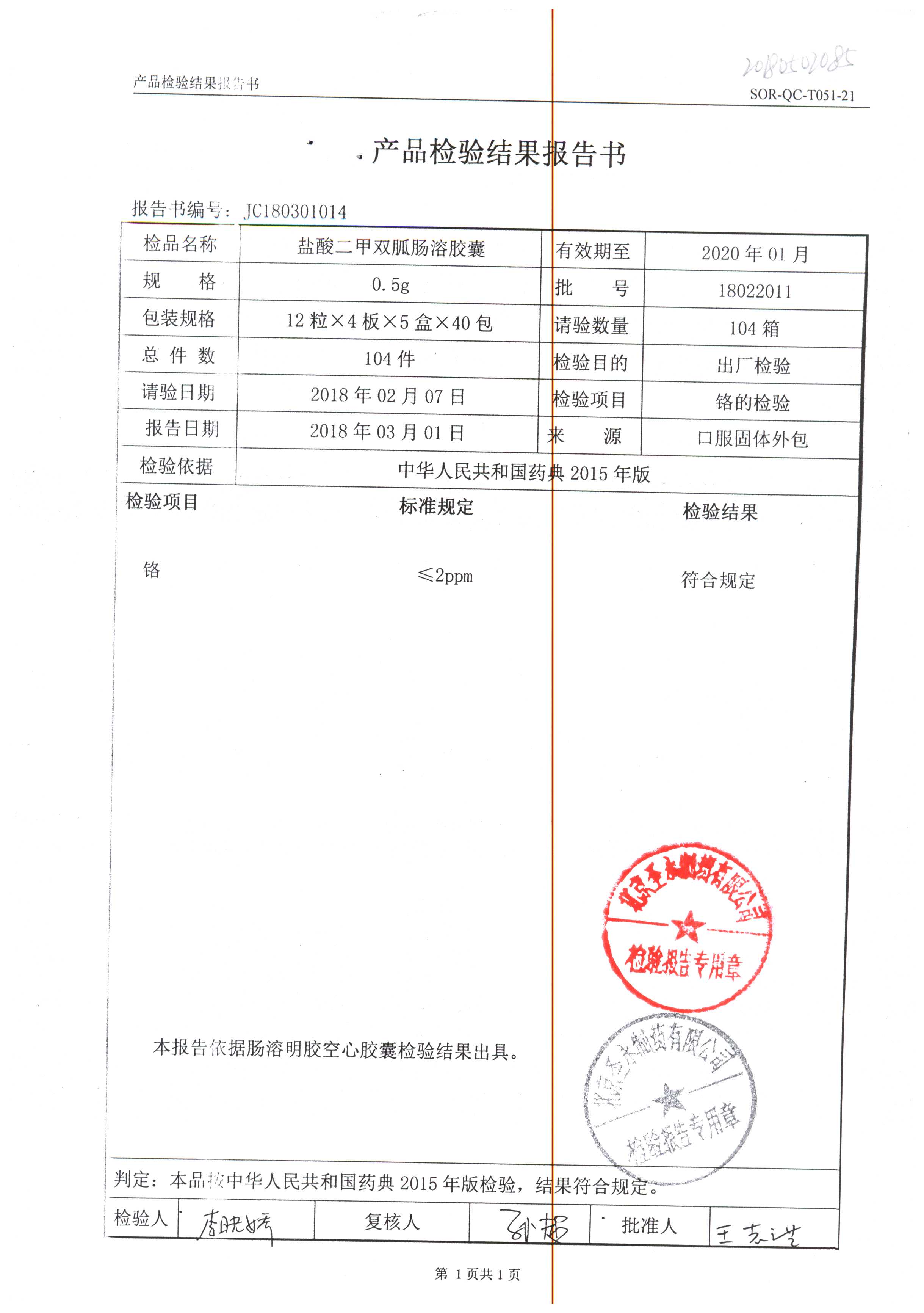 | 鹽酸二甲雙胍腸溶膠囊 | 0.5g*48s | 18011019(2/2) | 查看詳情 |