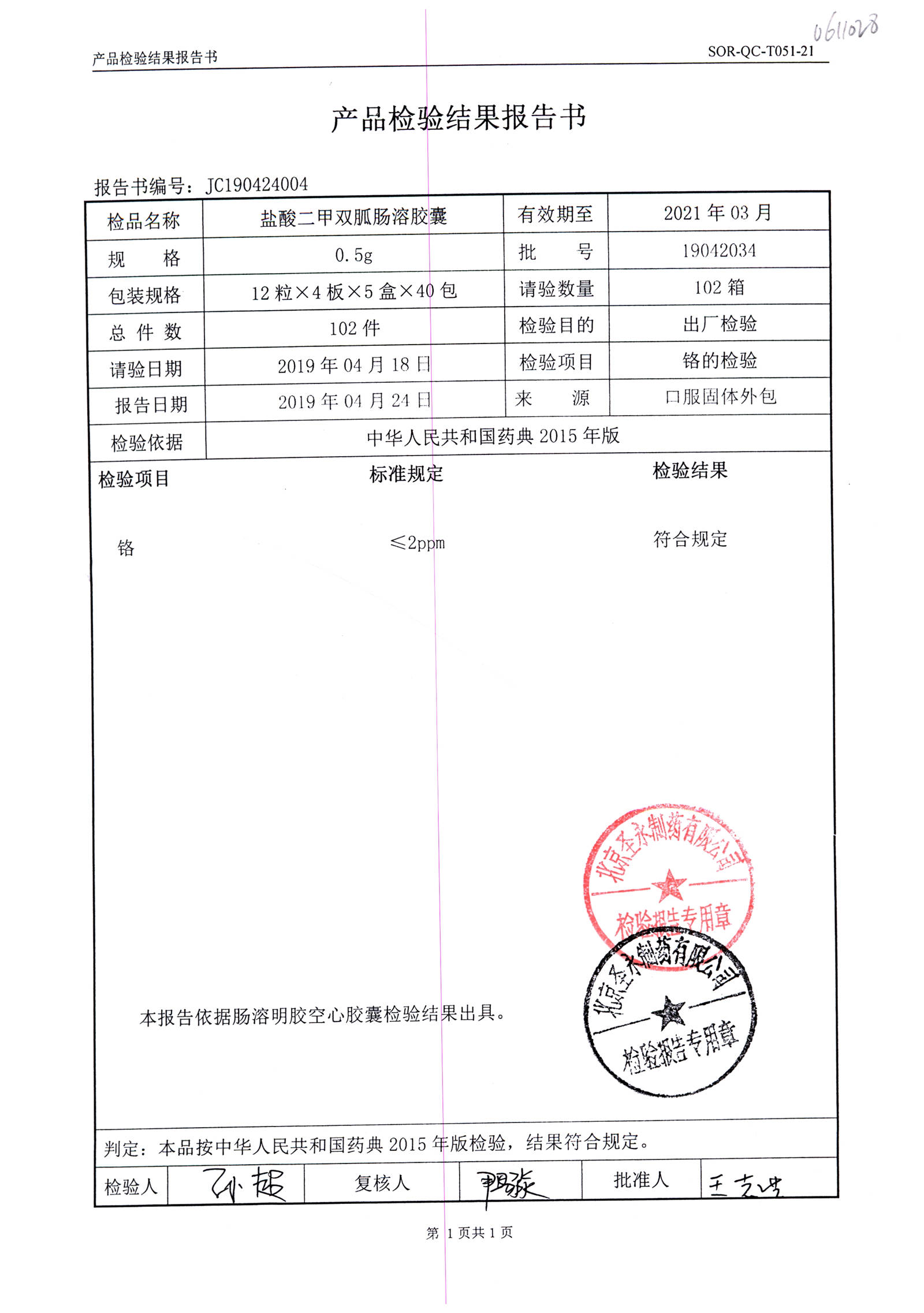 | 鹽酸二甲雙胍腸溶膠囊 | 0.5g*48s | 19062011(2/2) | 查看詳情 |