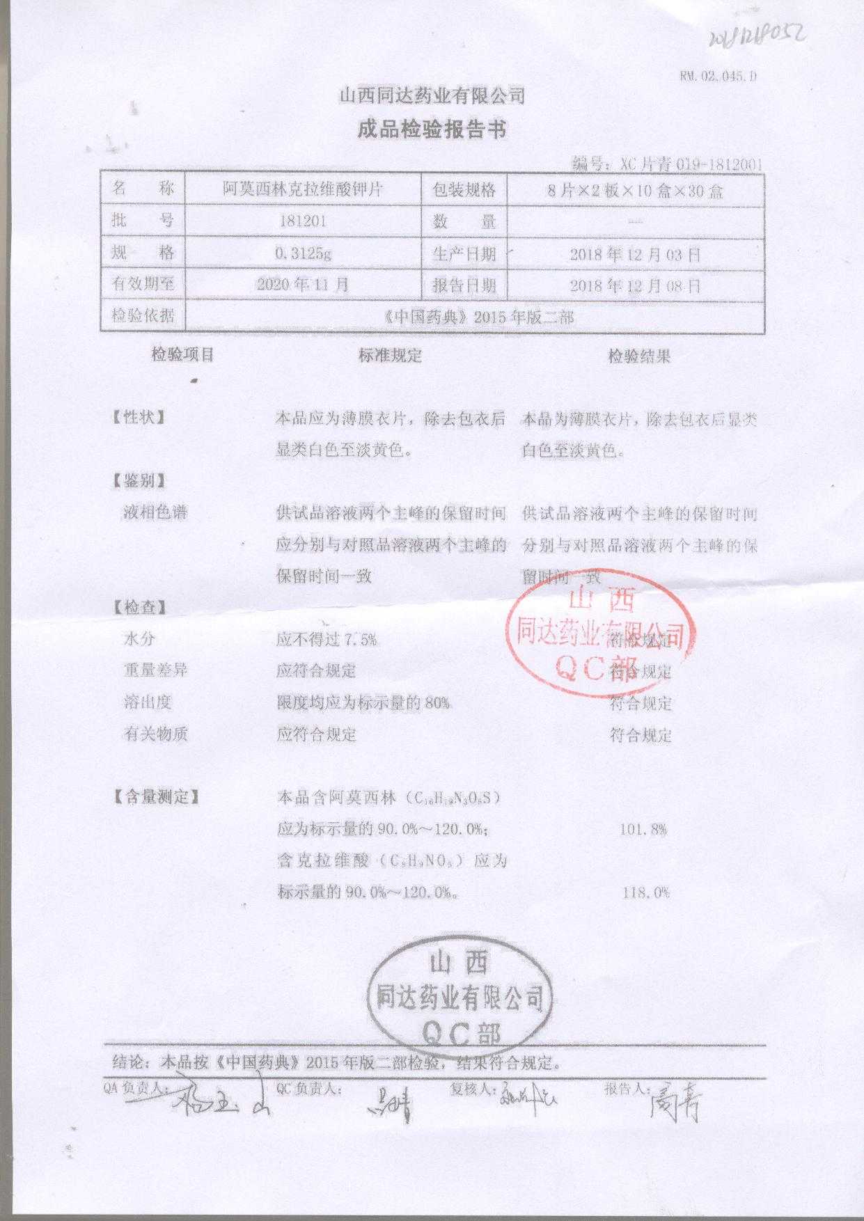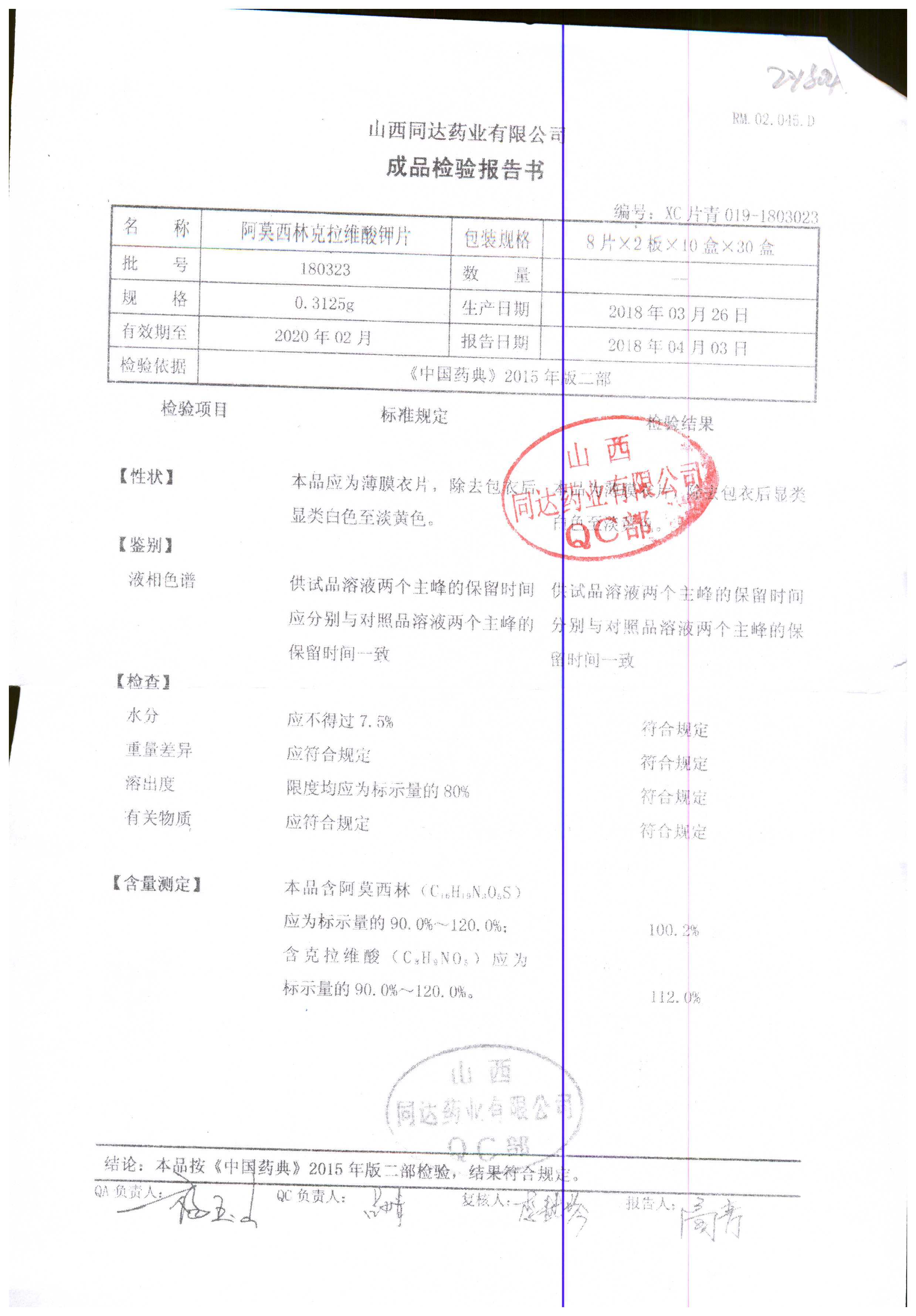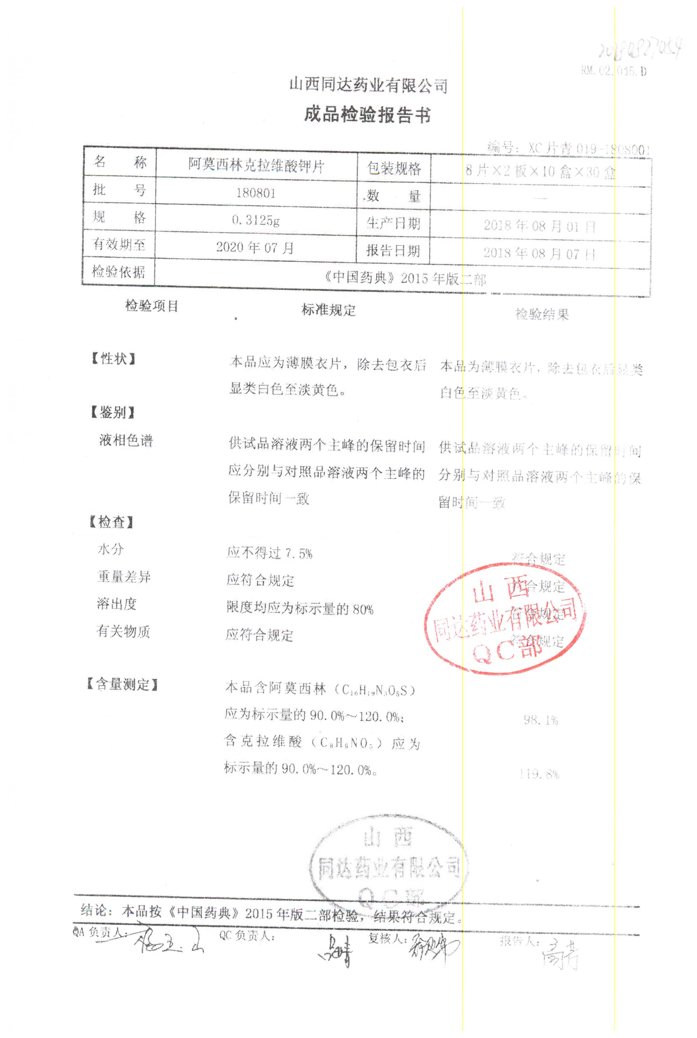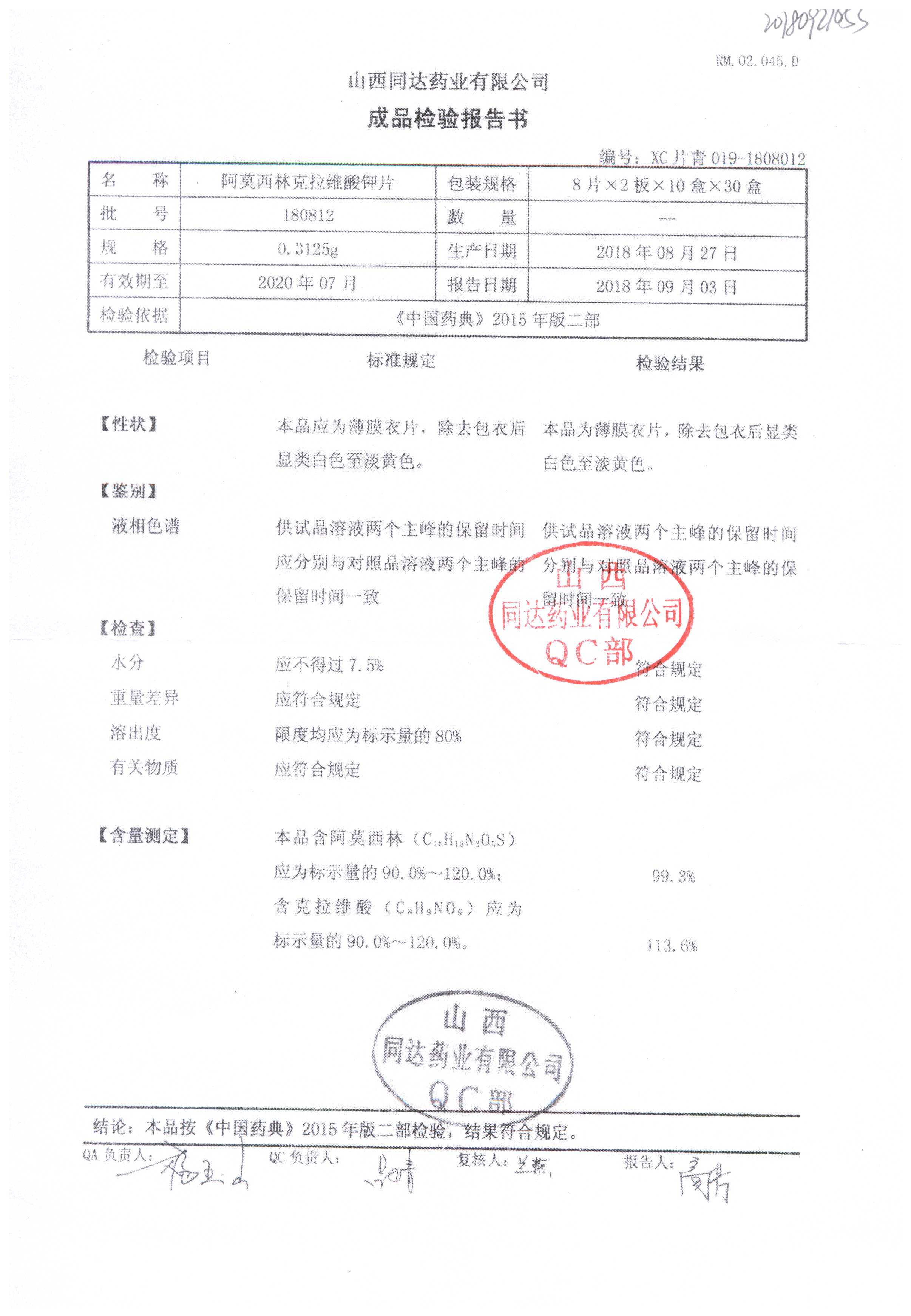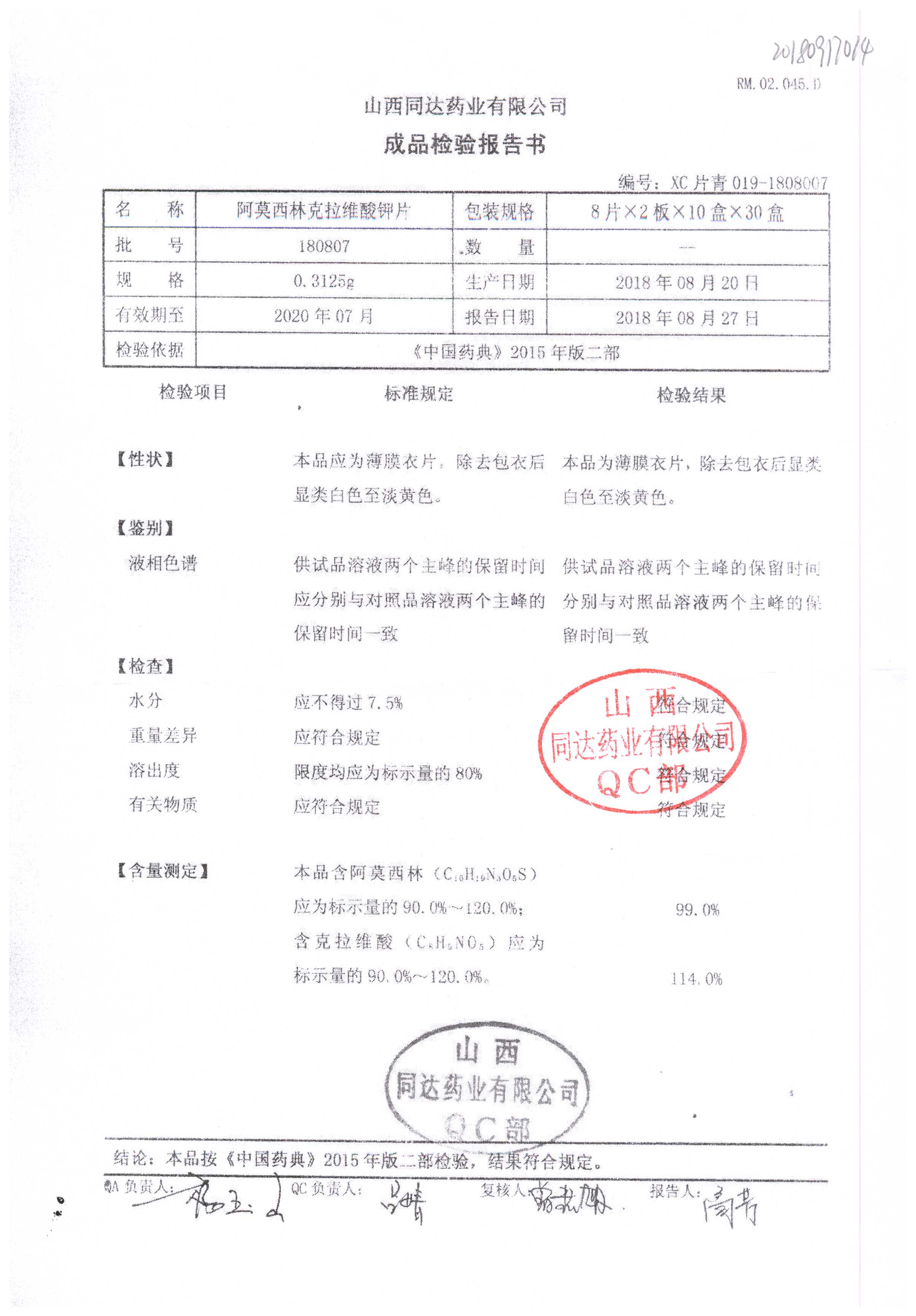 | 阿莫西林克拉維酸鉀片 | 0.3125g*16s | 180807 | 查看詳情 |