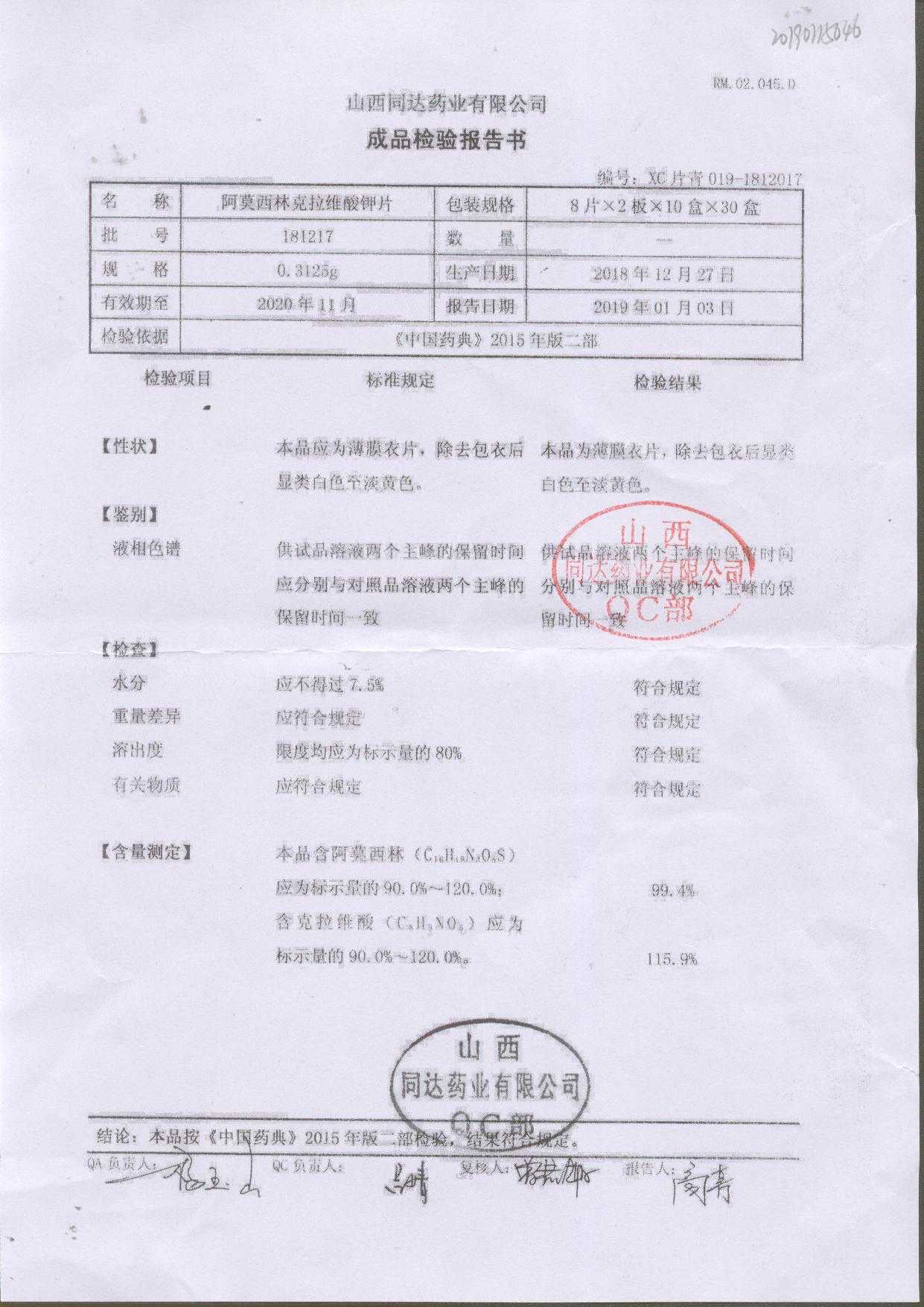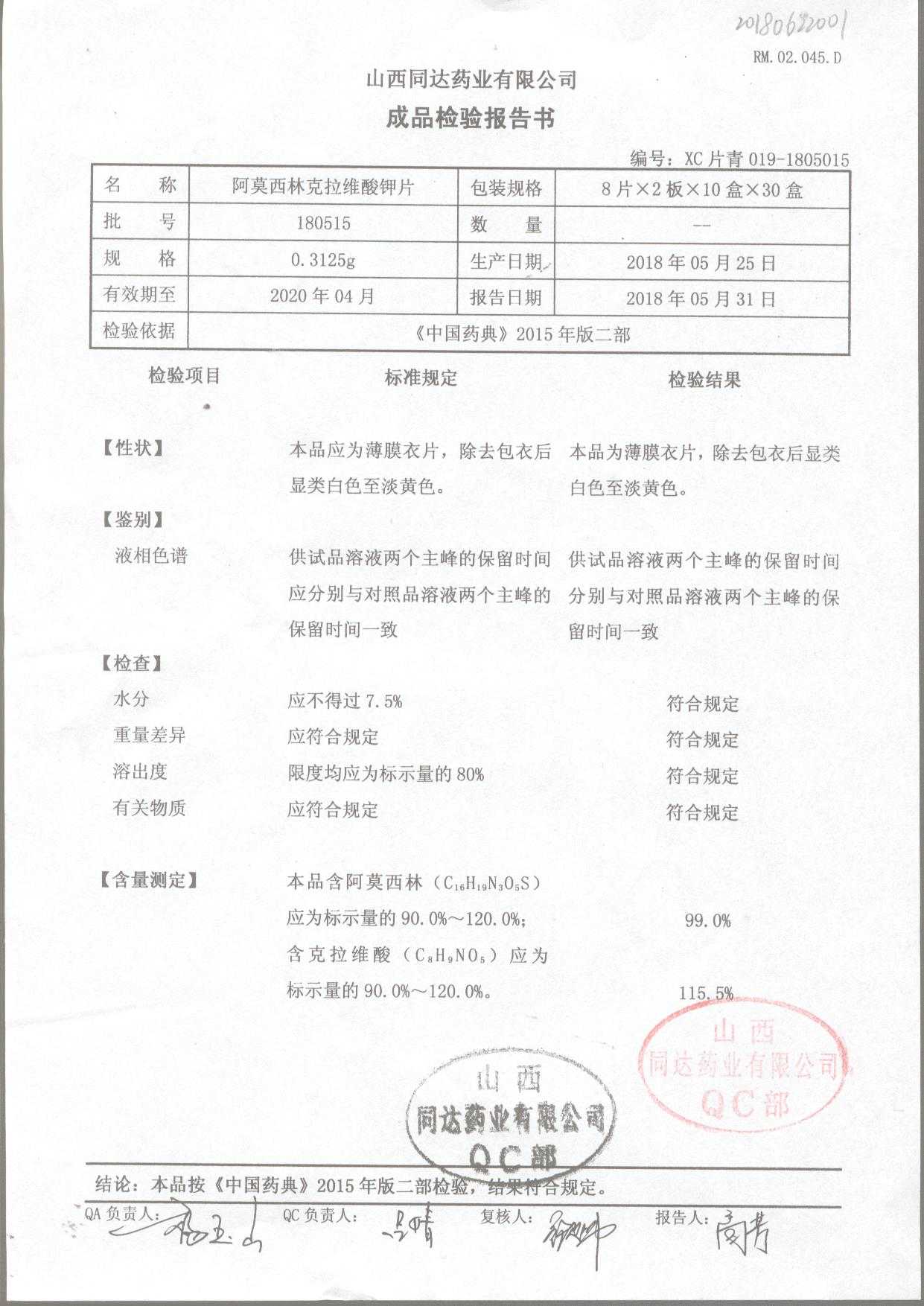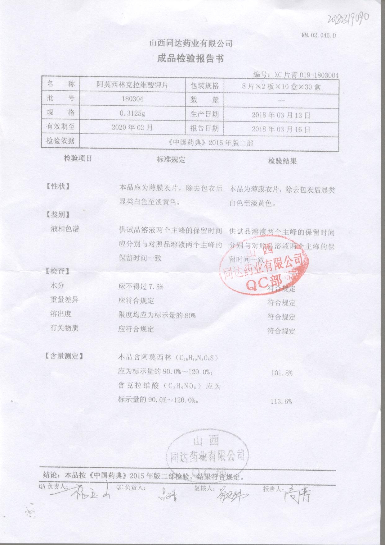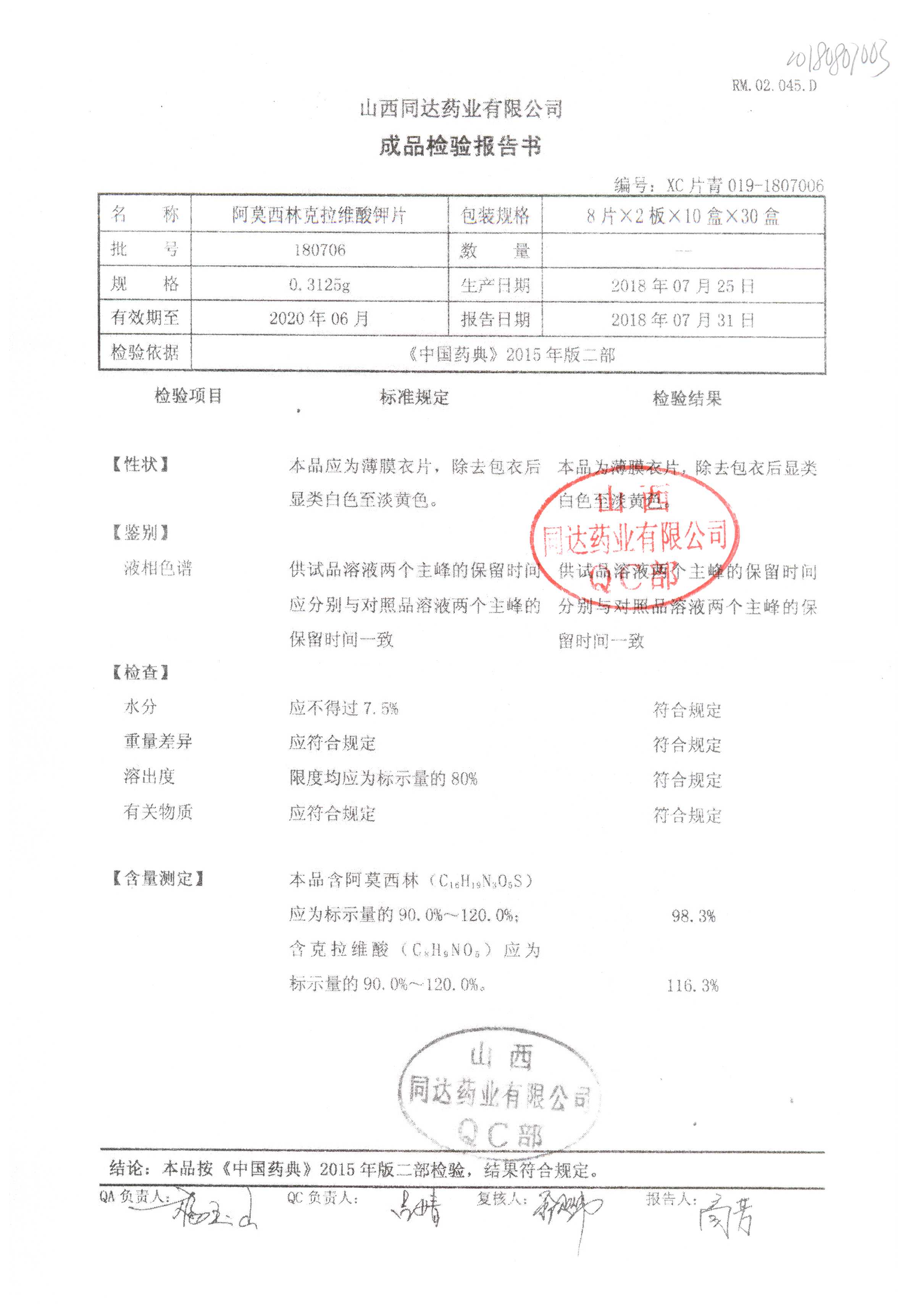 | 阿莫西林克拉維酸鉀片 | 0.3125g*16s | 180807 | 查看詳情 |