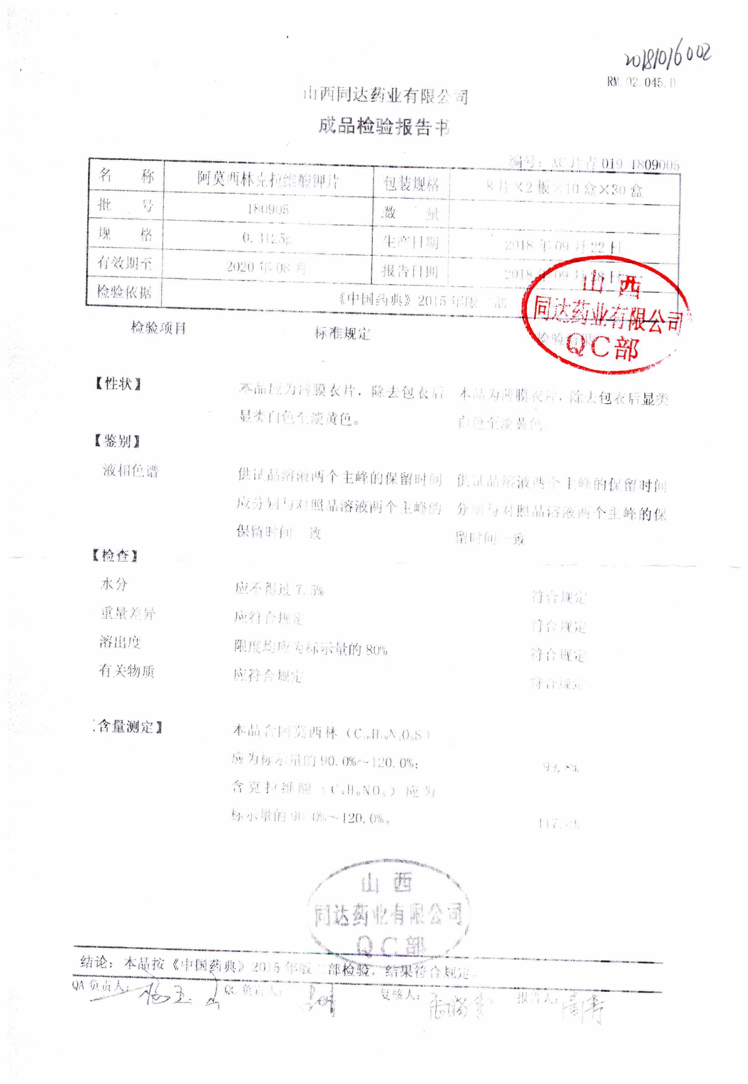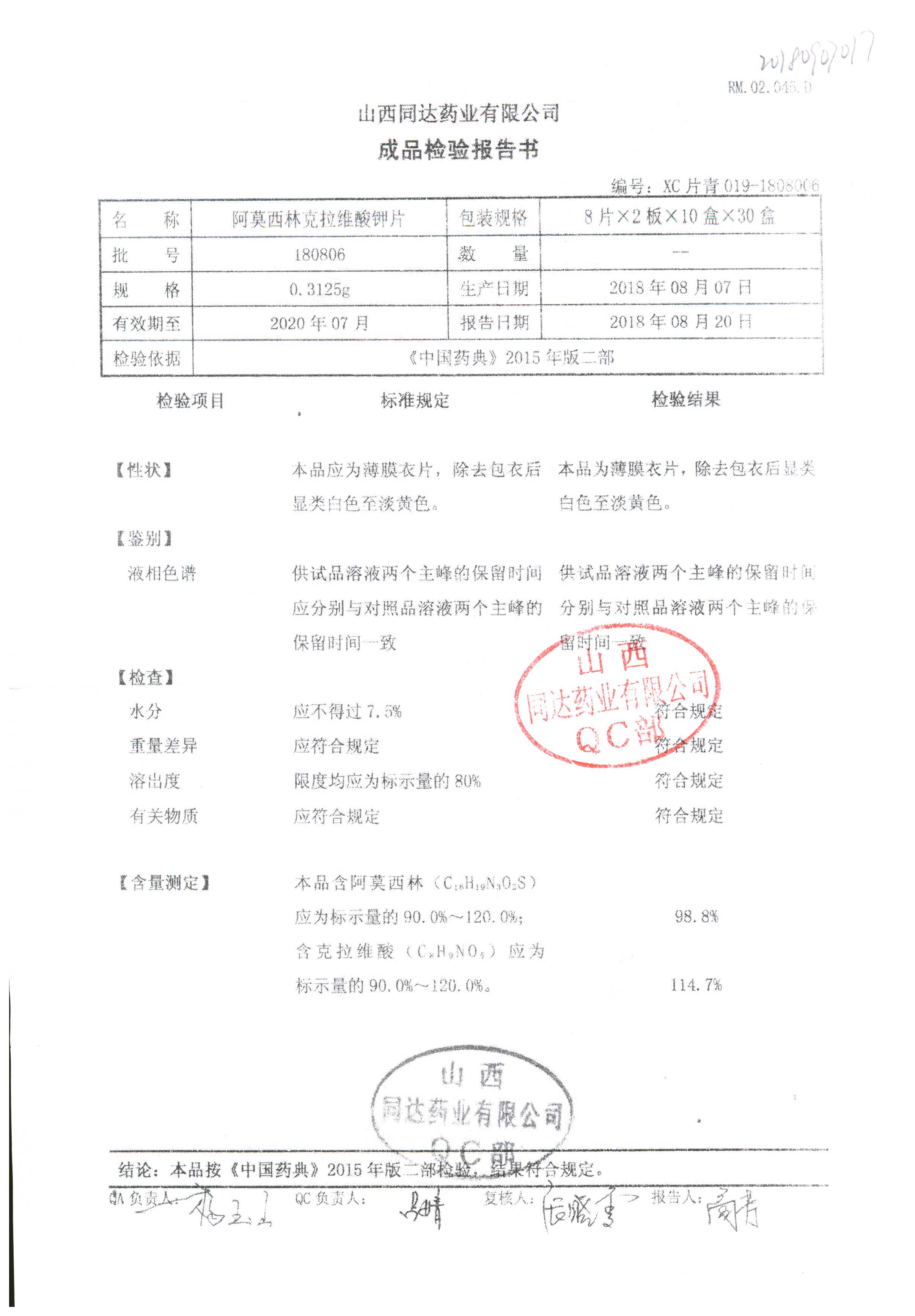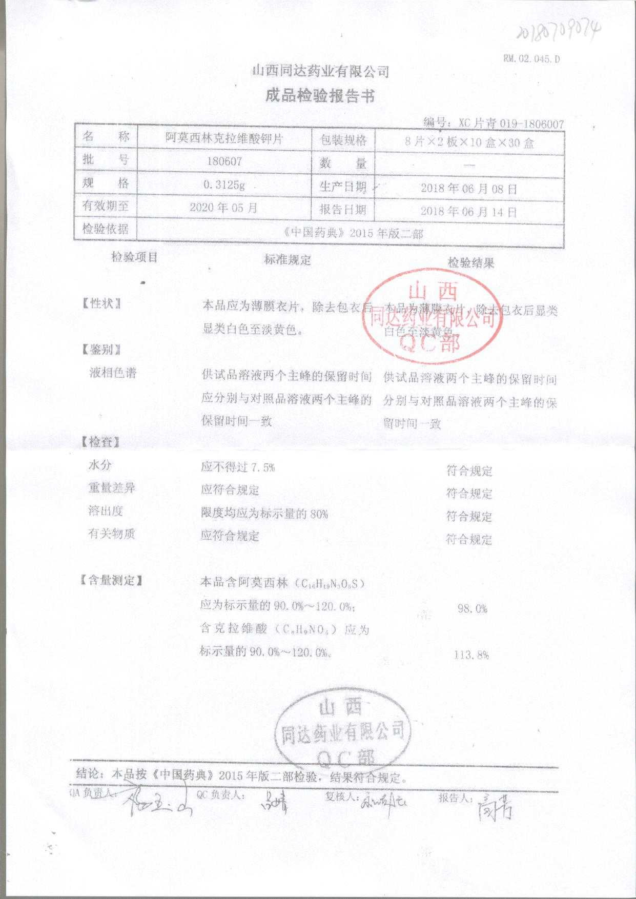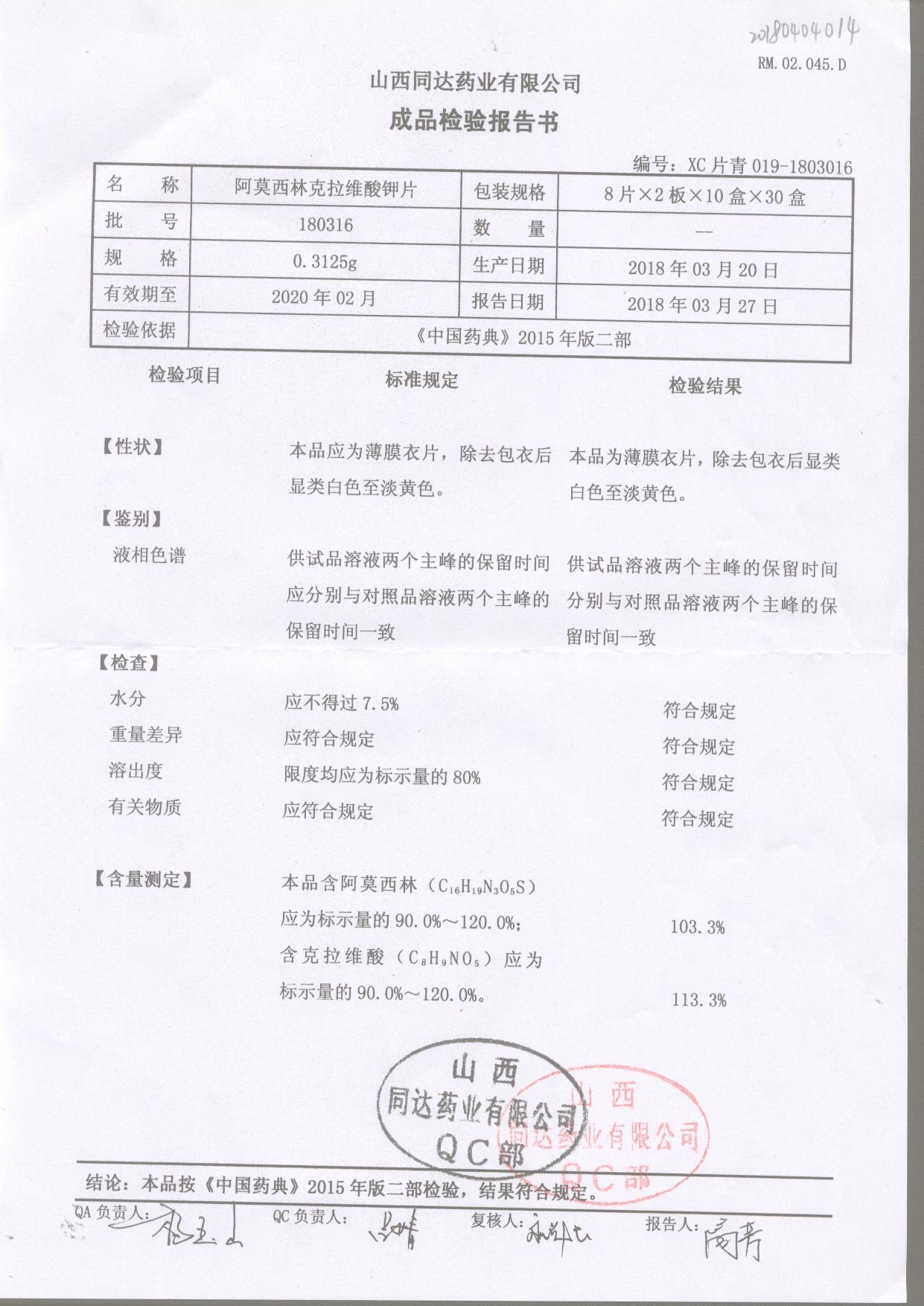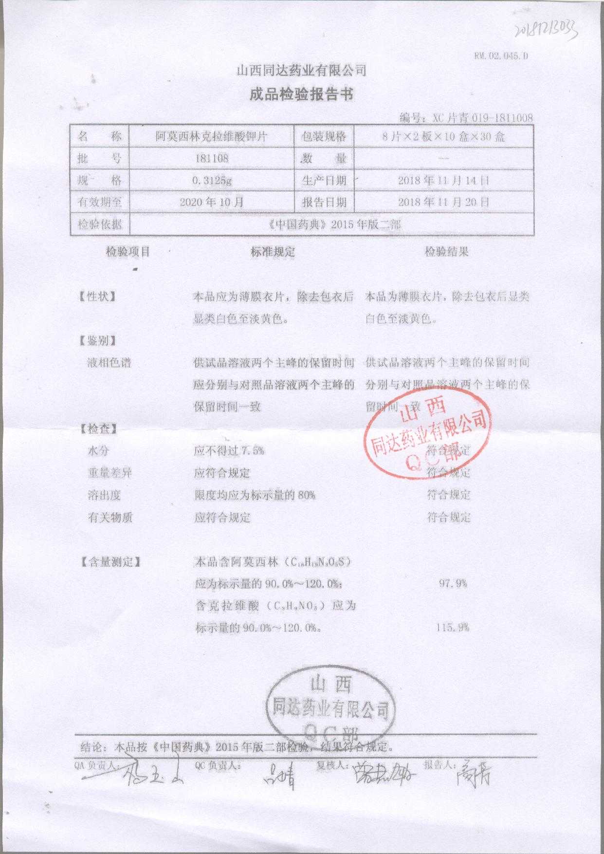 | 阿莫西林克拉維酸鉀片 | 0.3125g*16s | 180807 | 查看詳情 |