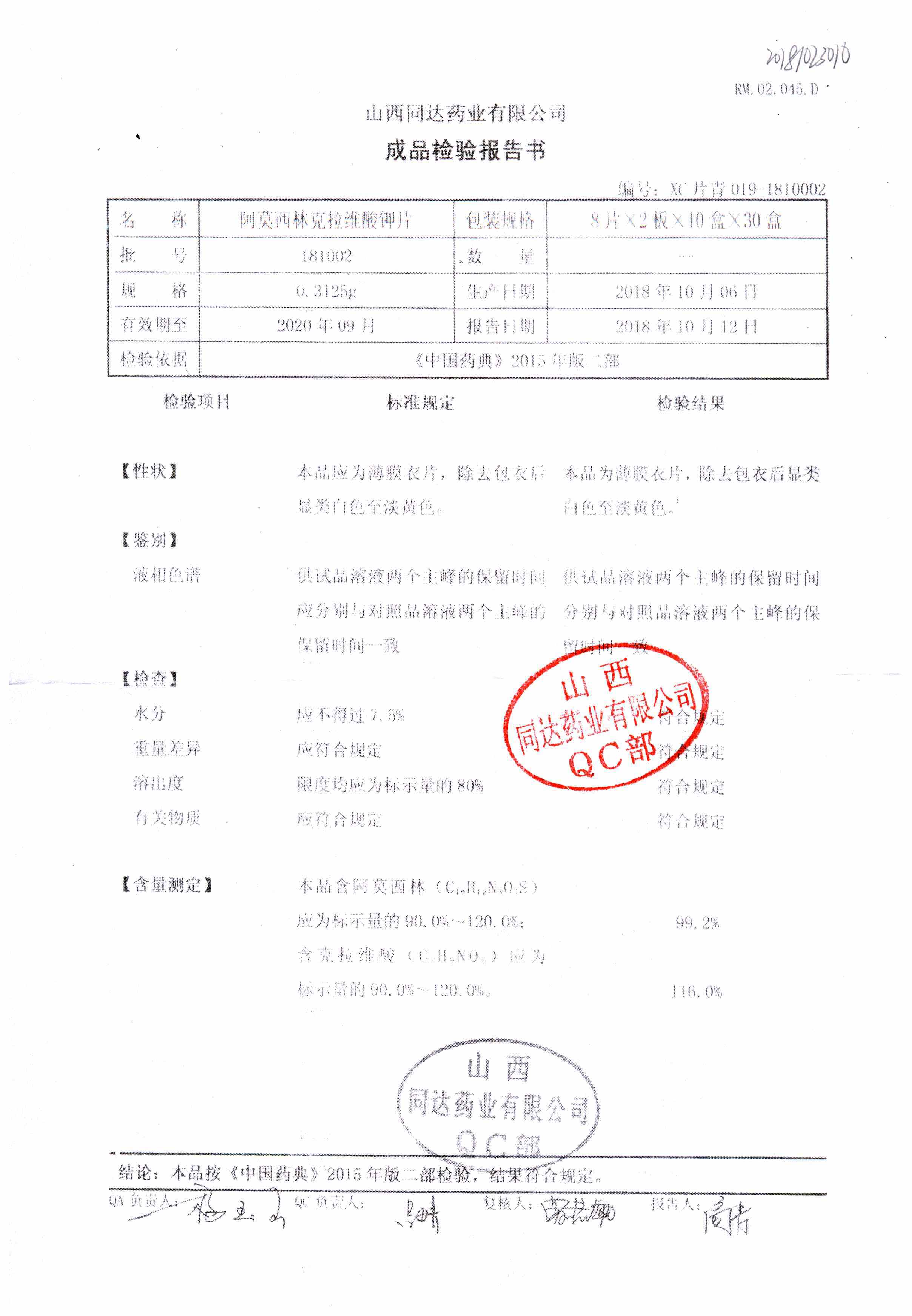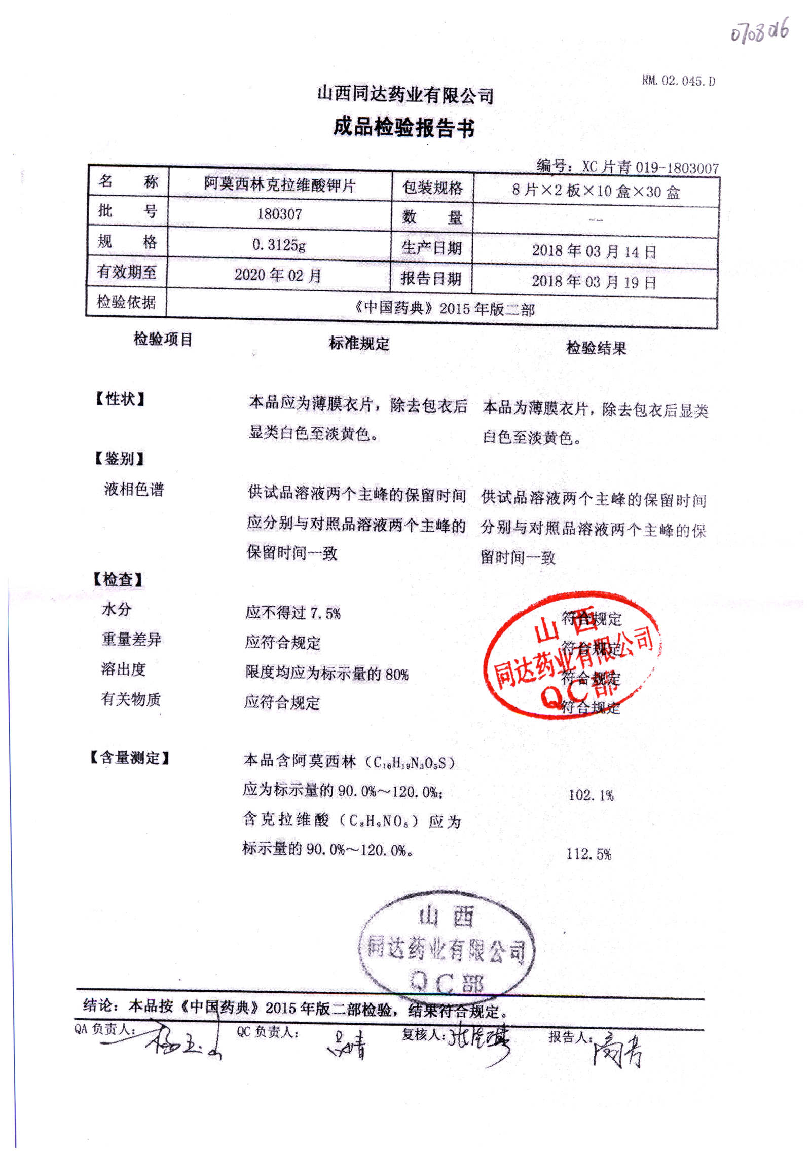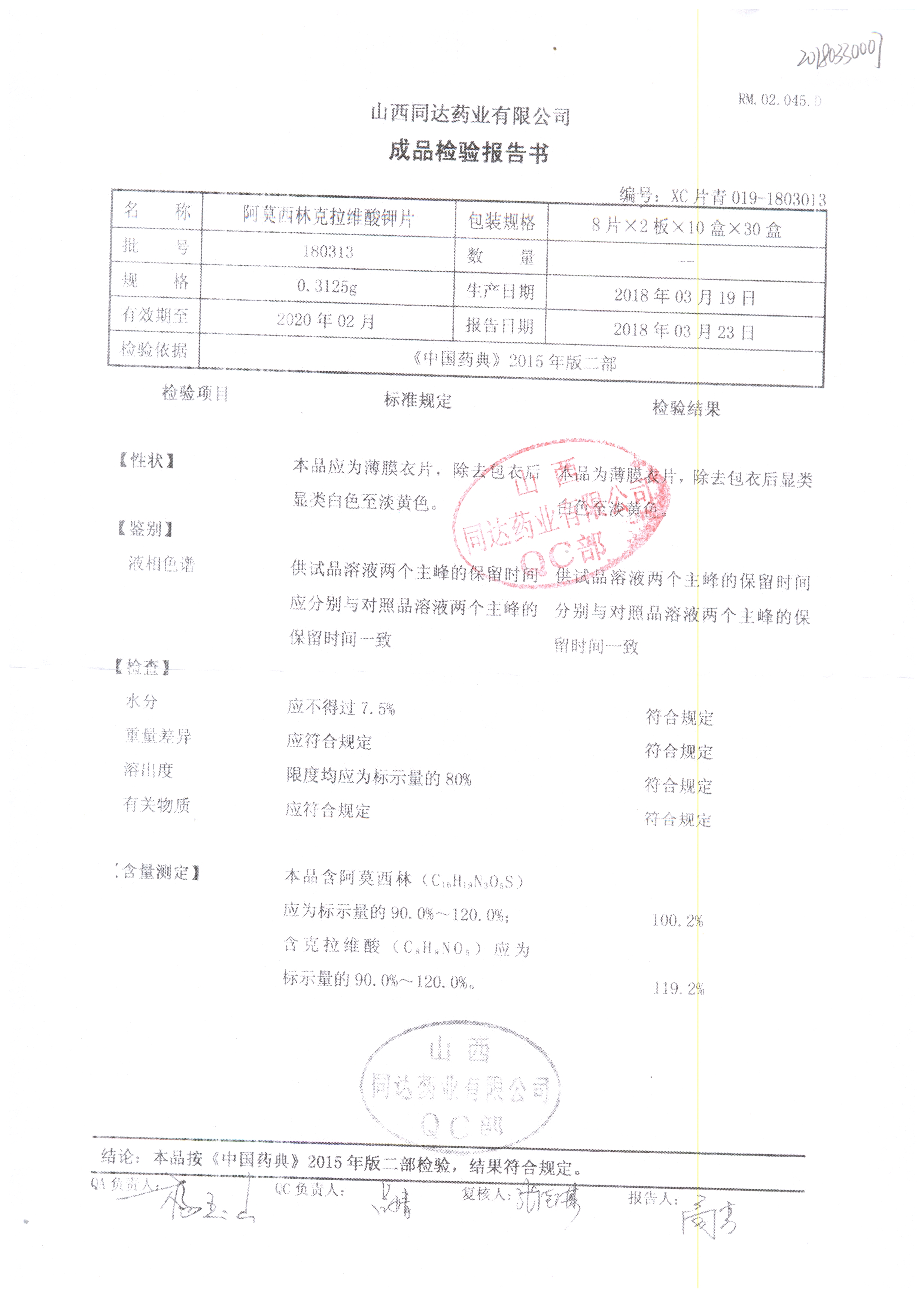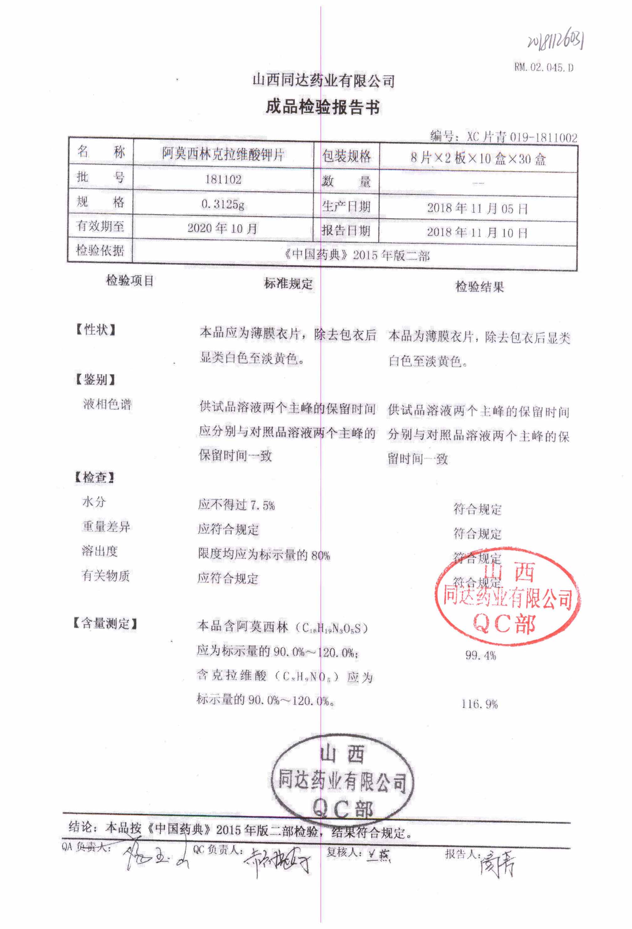 | 阿莫西林克拉維酸鉀片 | 0.3125g*16s | 180807 | 查看詳情 |