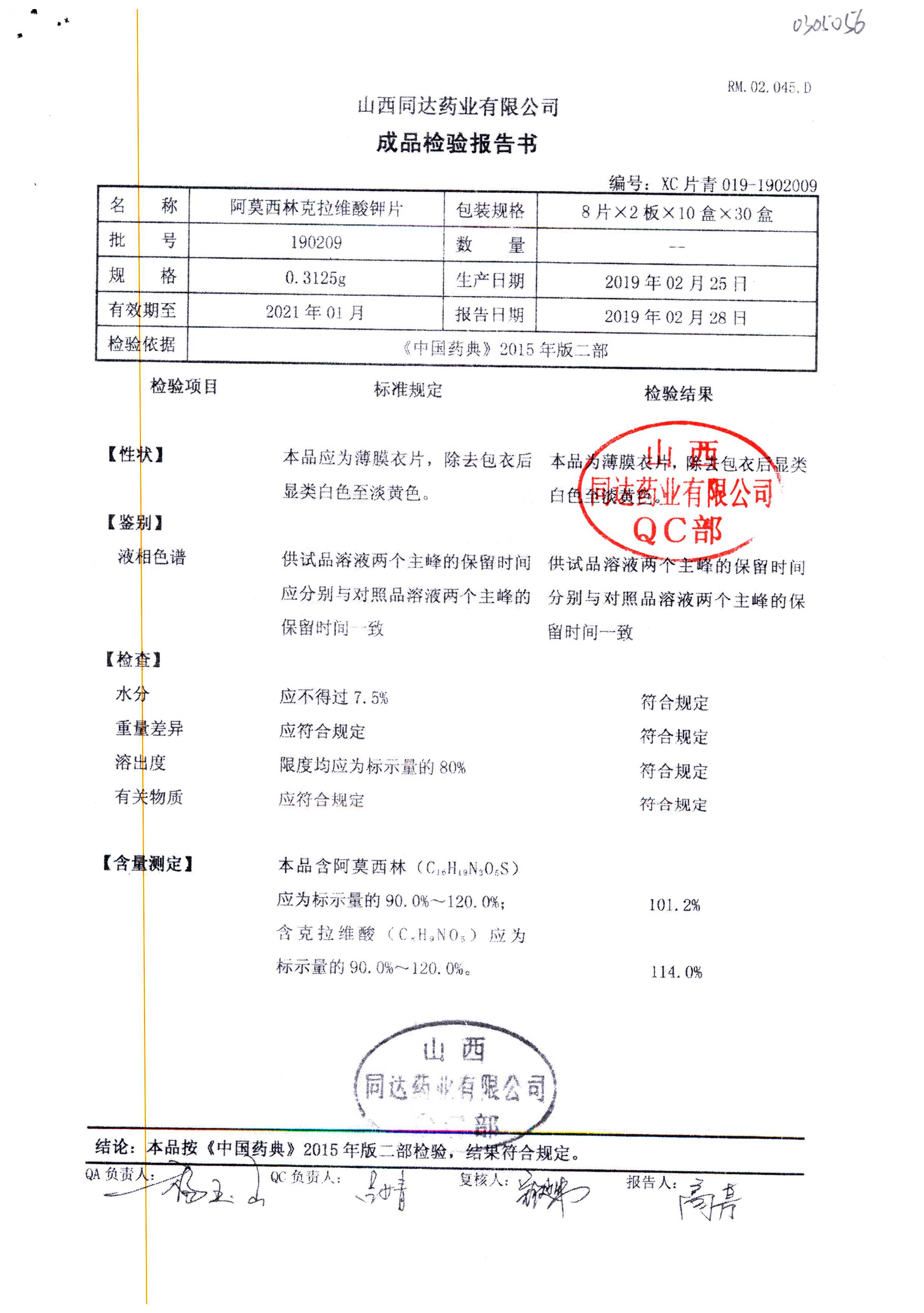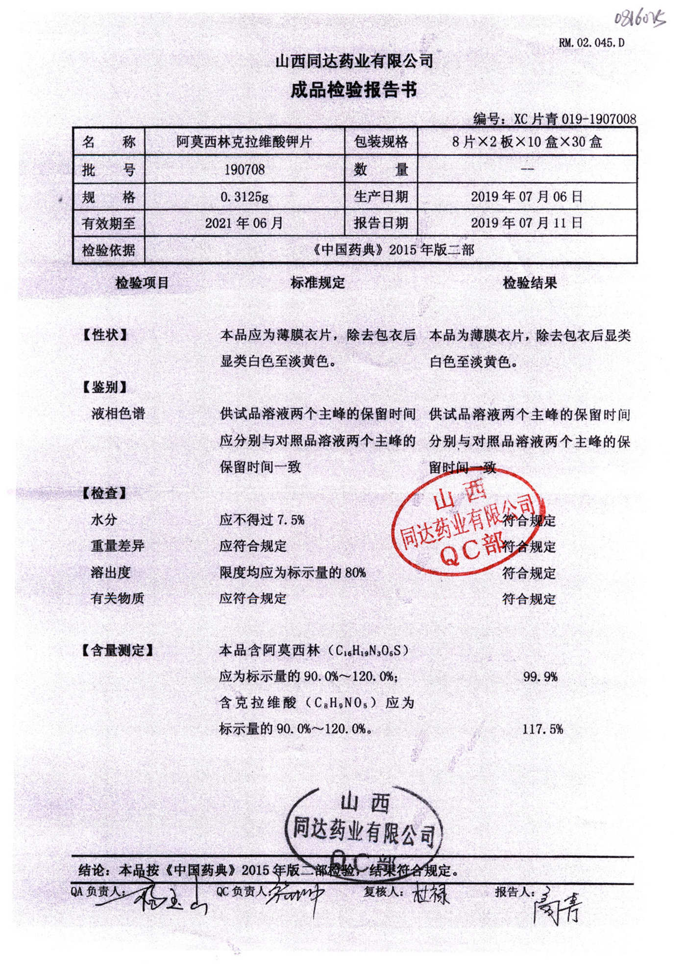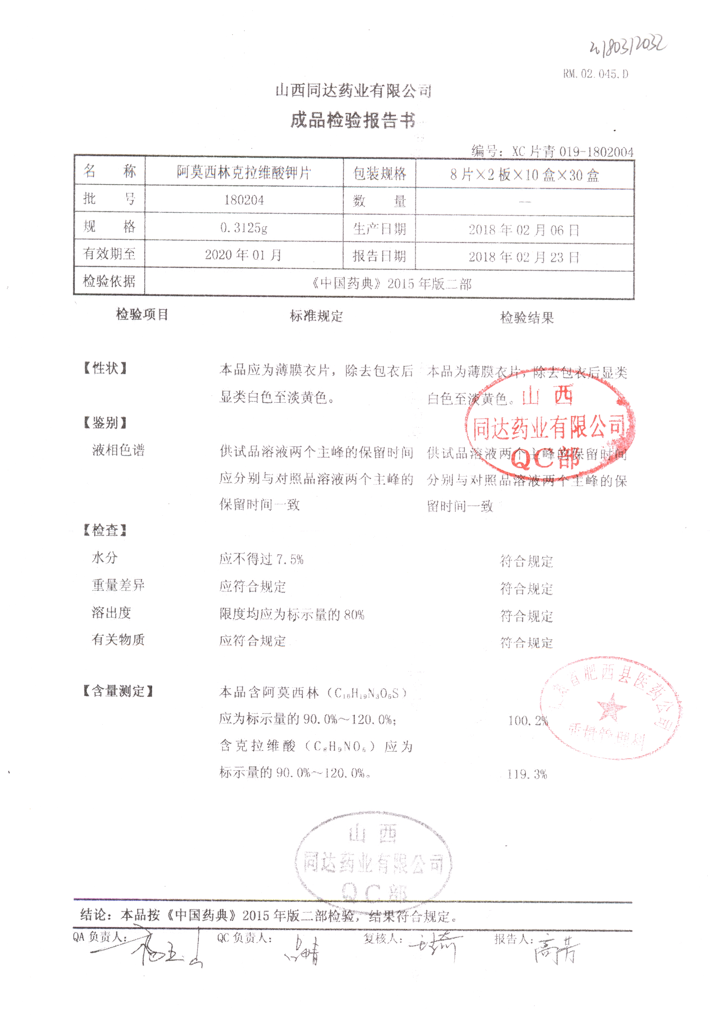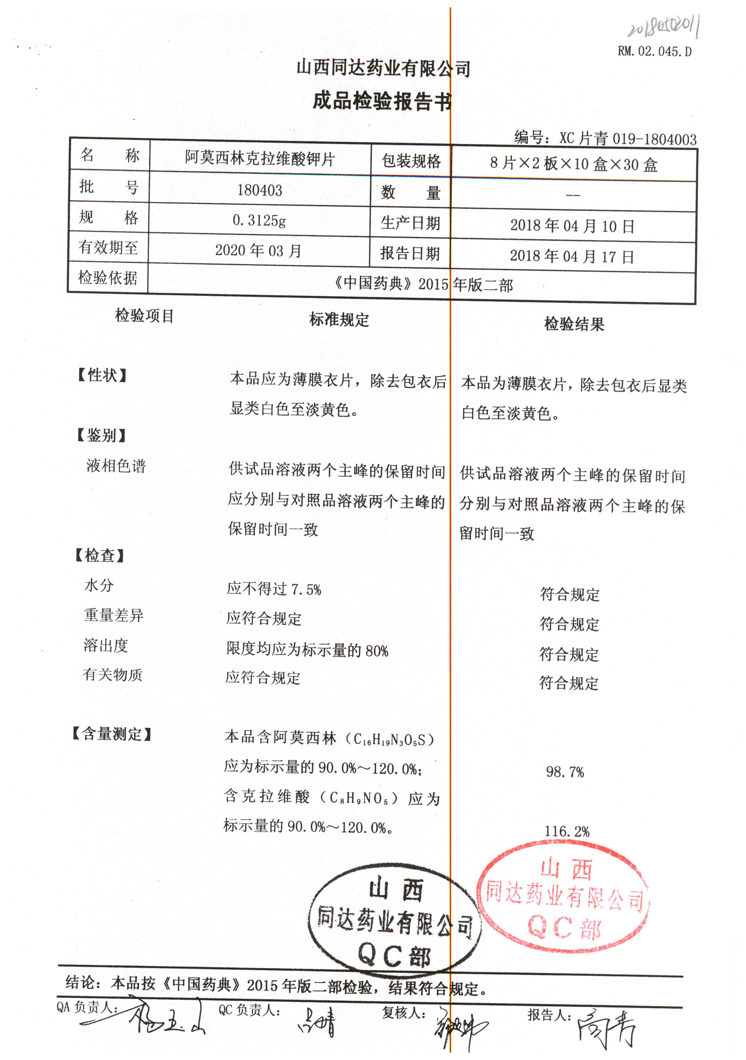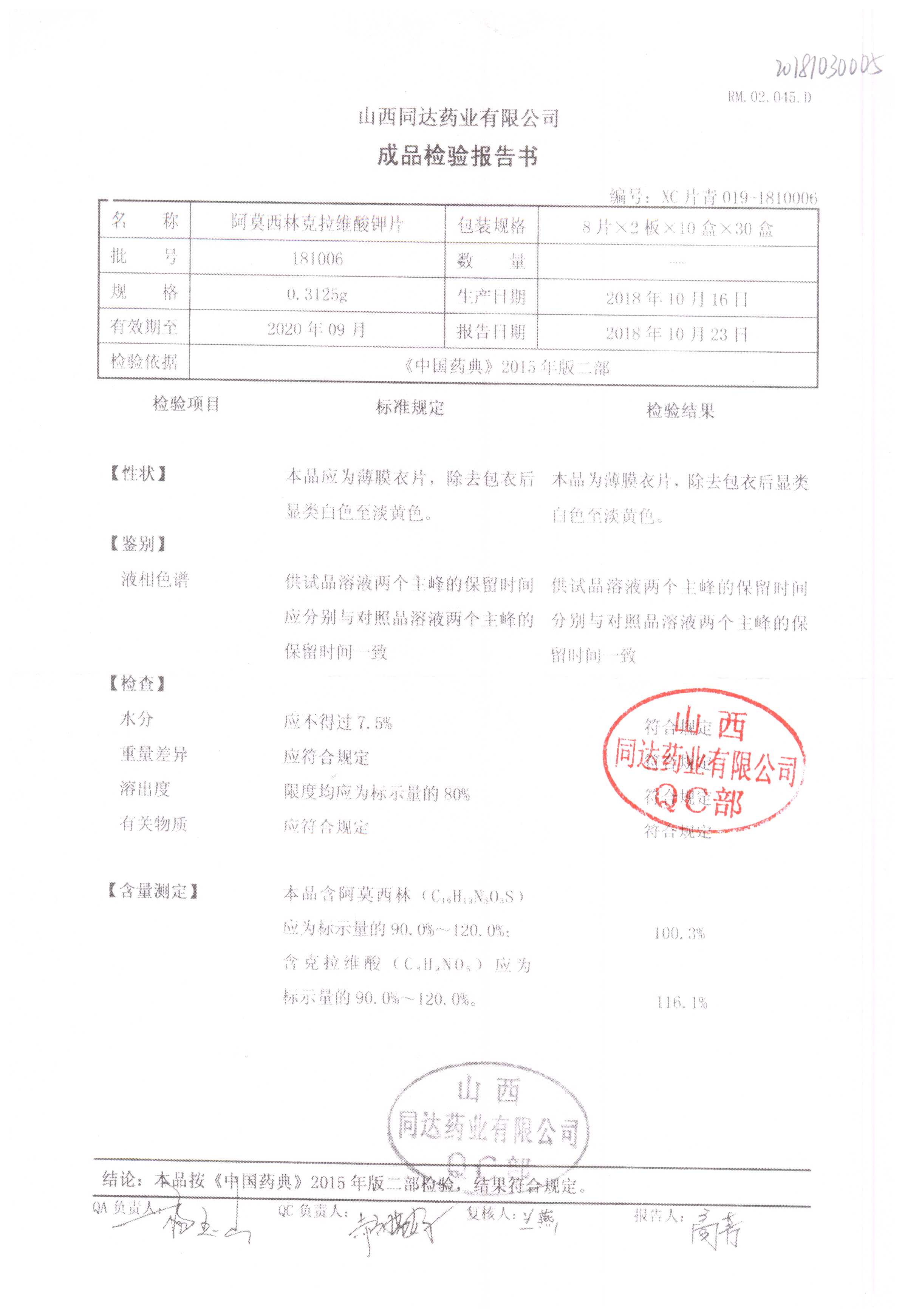 | 阿莫西林克拉維酸鉀片 | 0.3125g*16s | 180807 | 查看詳情 |