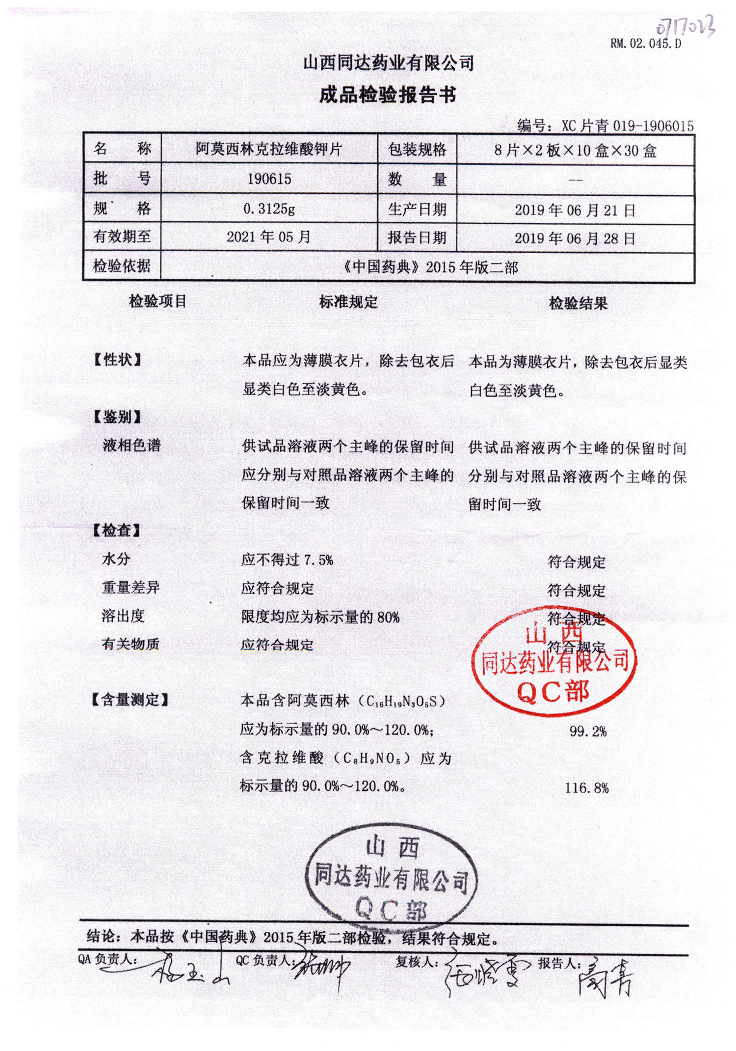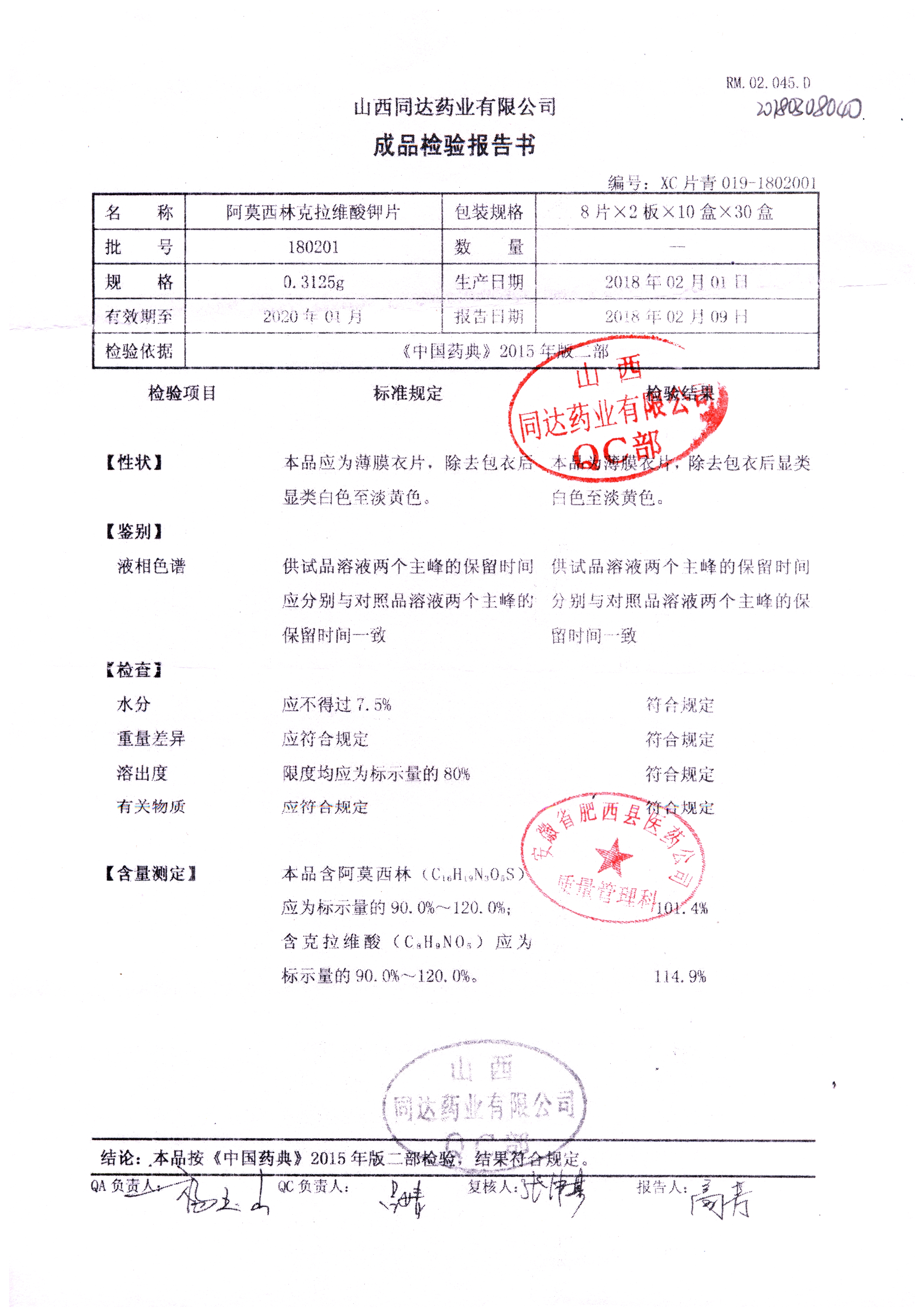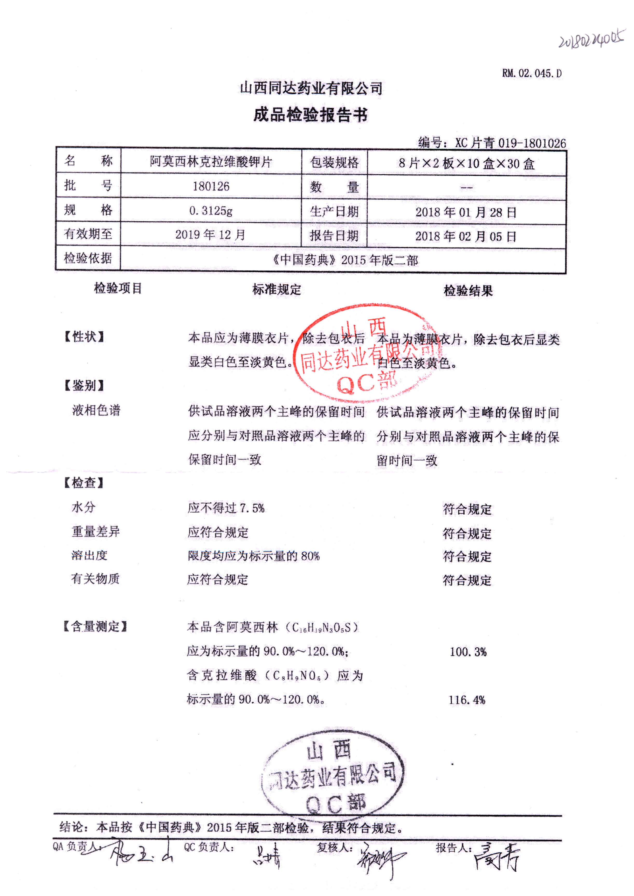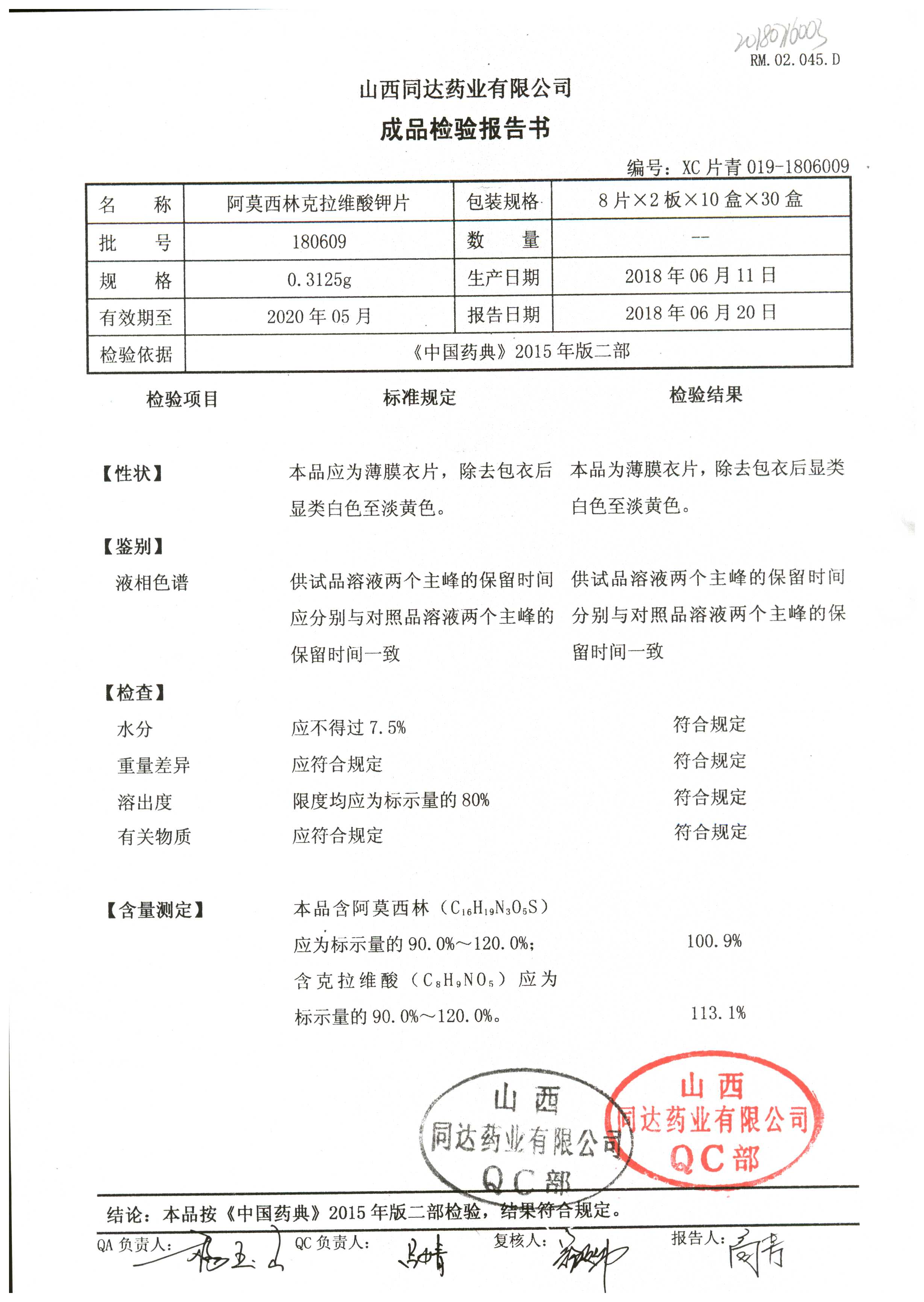 | 阿莫西林克拉維酸鉀片 | 0.3125g*16s | 180807 | 查看詳情 |