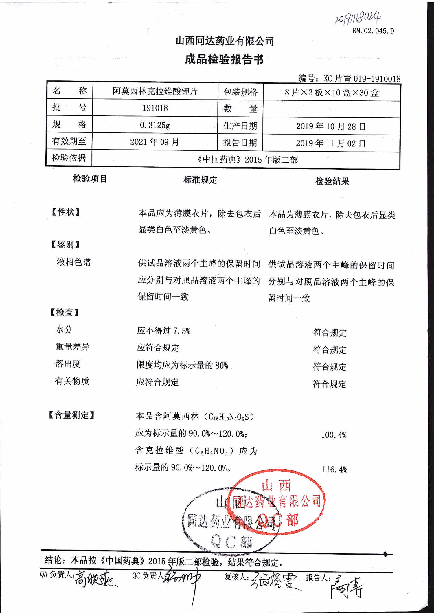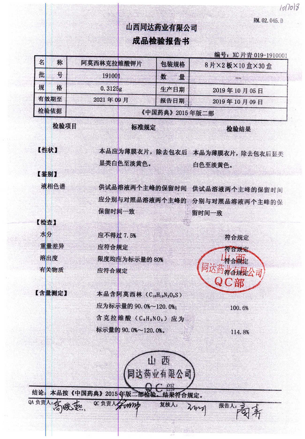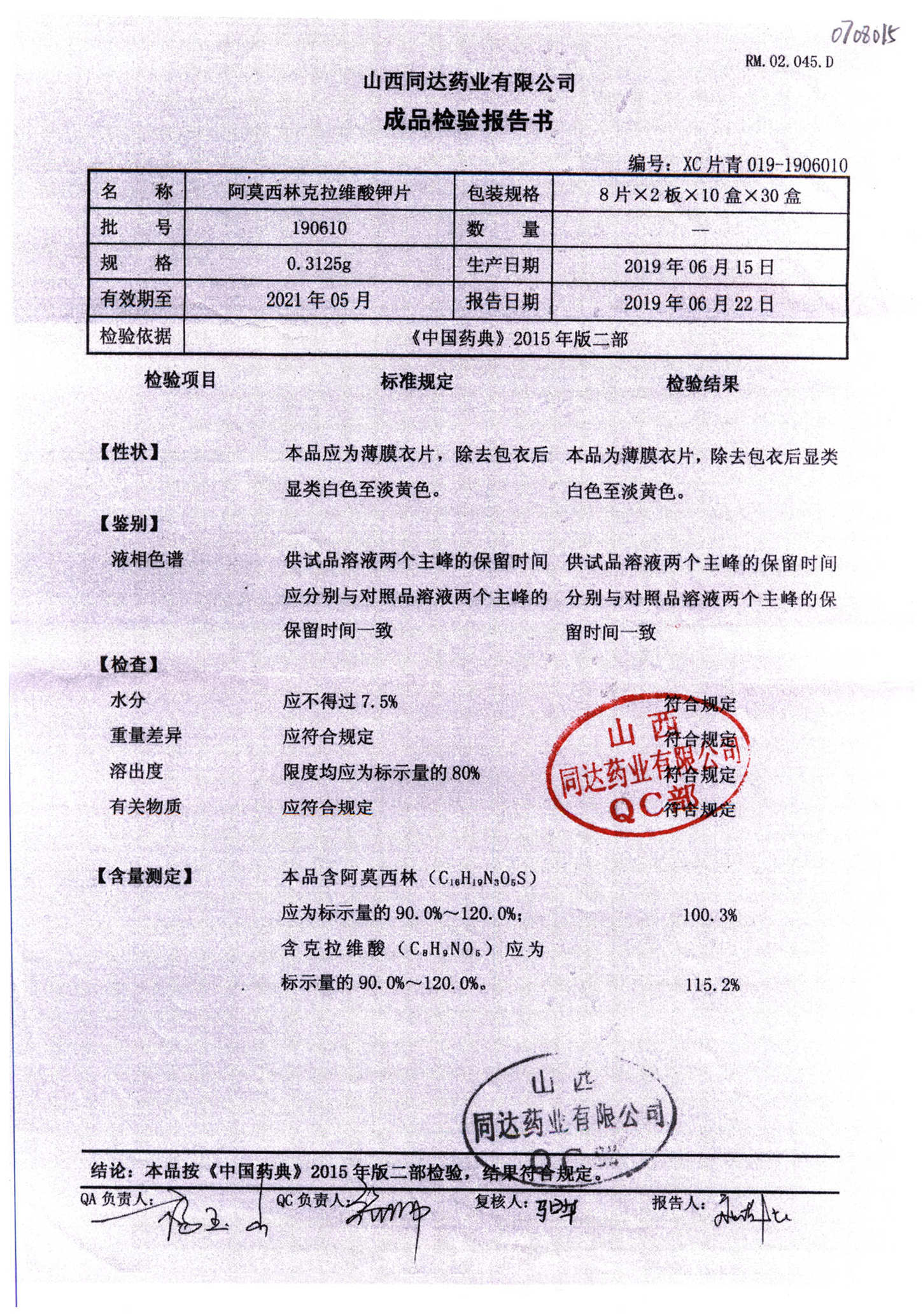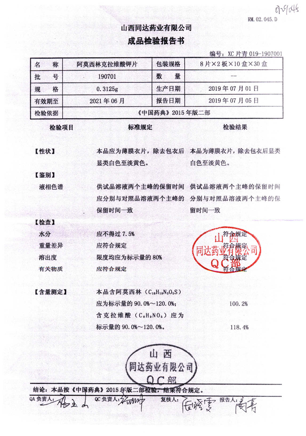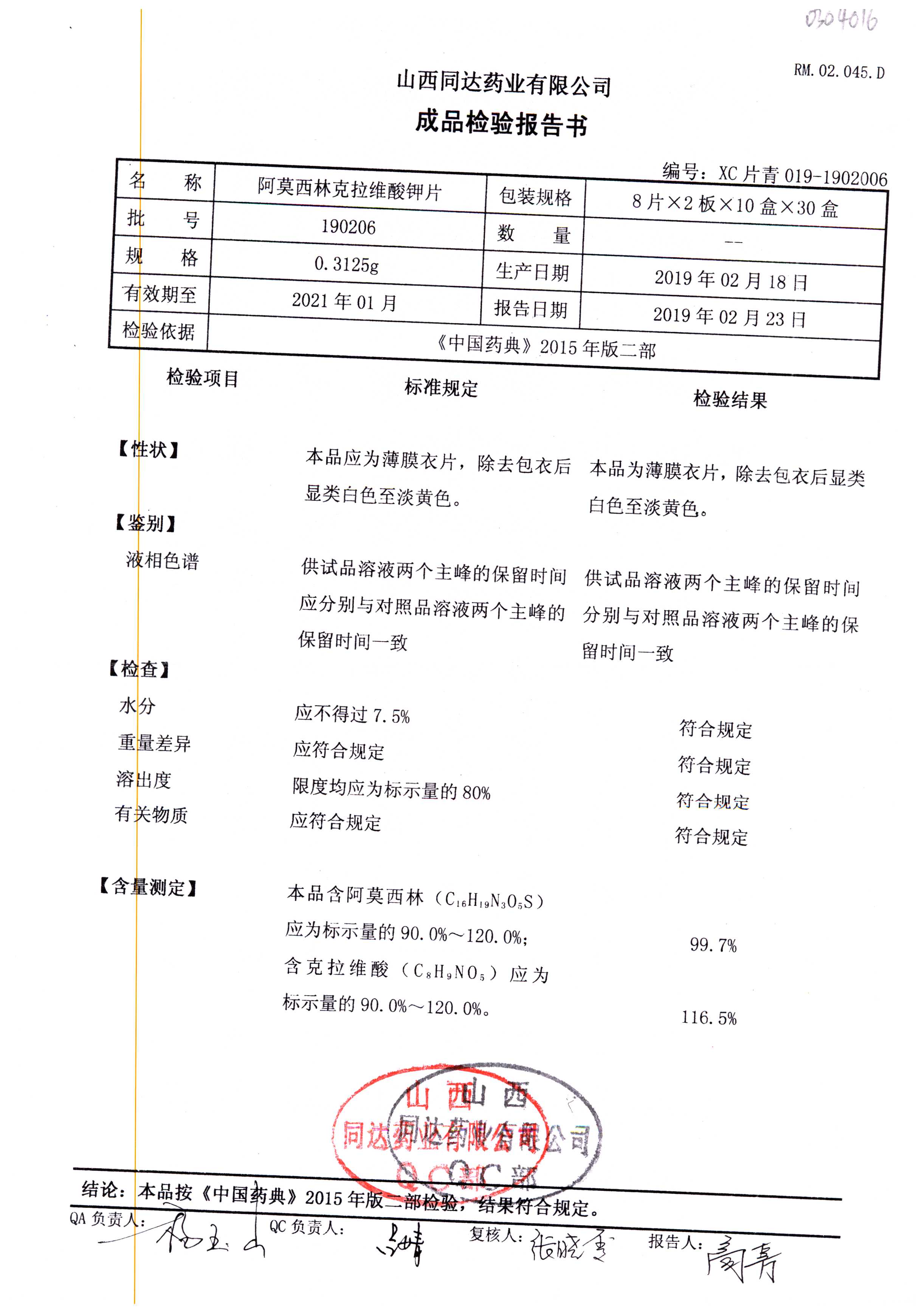 | 阿莫西林克拉維酸鉀片 | 0.3125g*16s | 180807 | 查看詳情 |