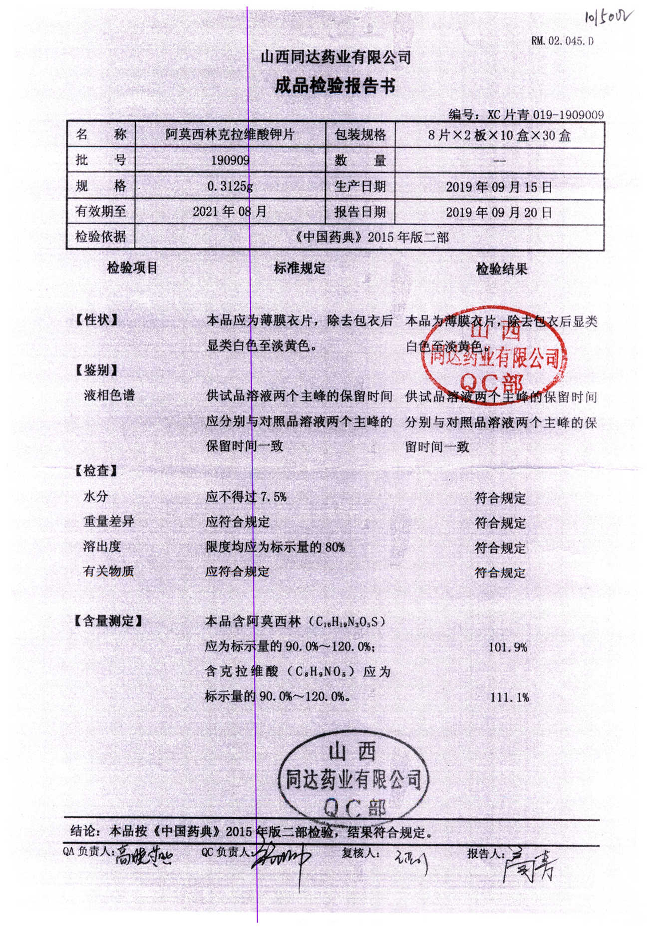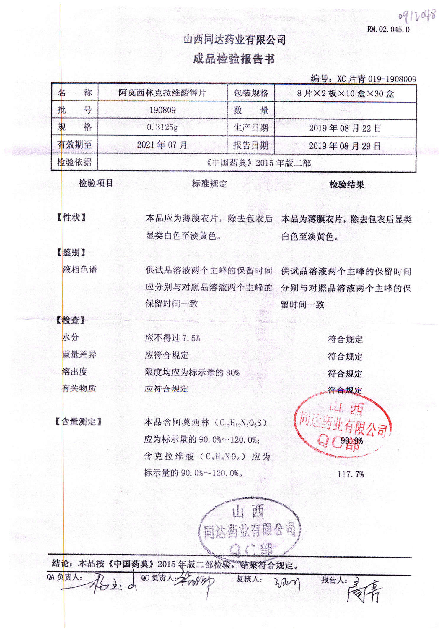 | 阿莫西林克拉維酸鉀片 | 0.3125g*16s | 190809 | 查看詳情 |