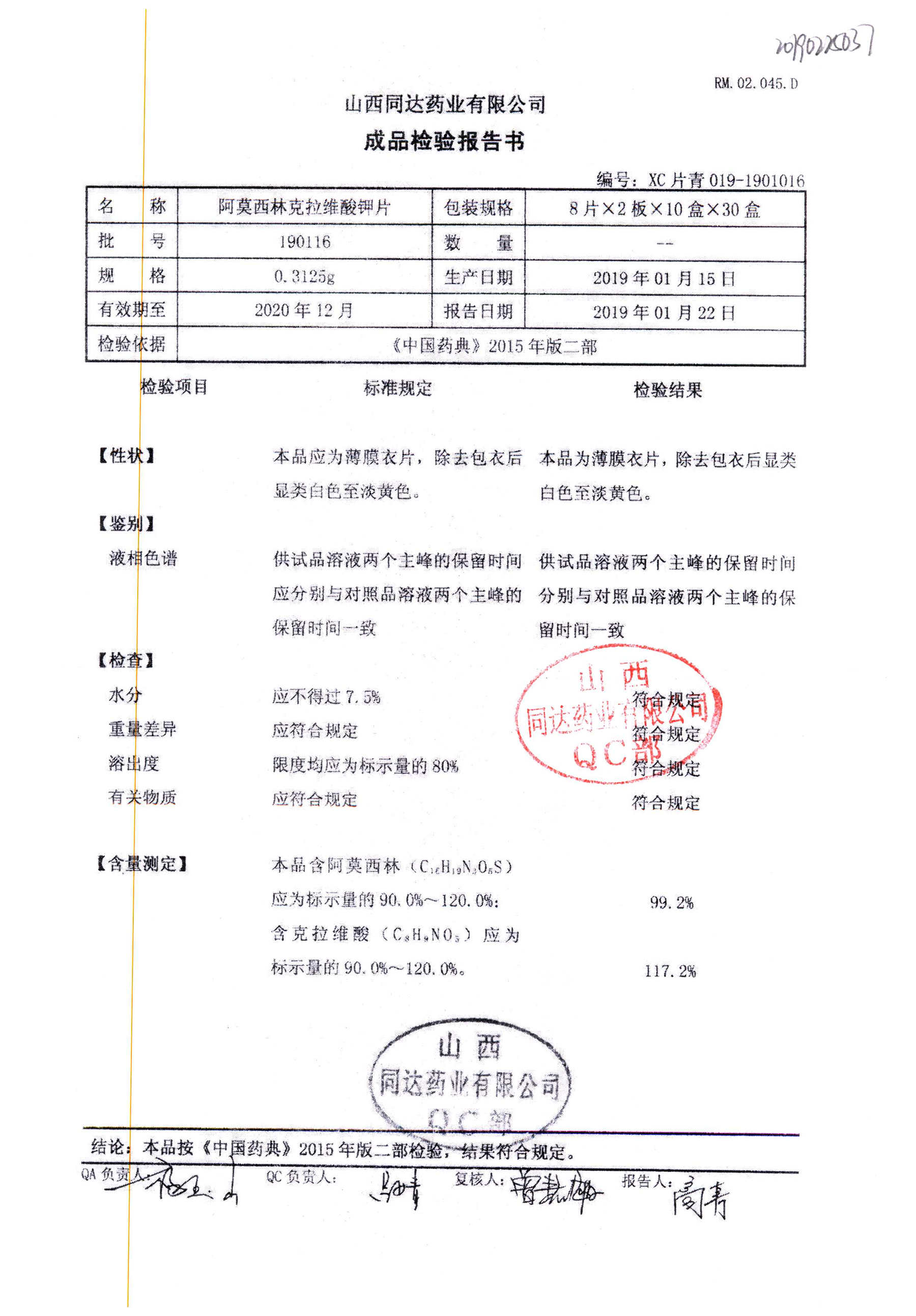 | 阿莫西林克拉維酸鉀片 | 0.3125g*16s | 190307 | 查看詳情 |