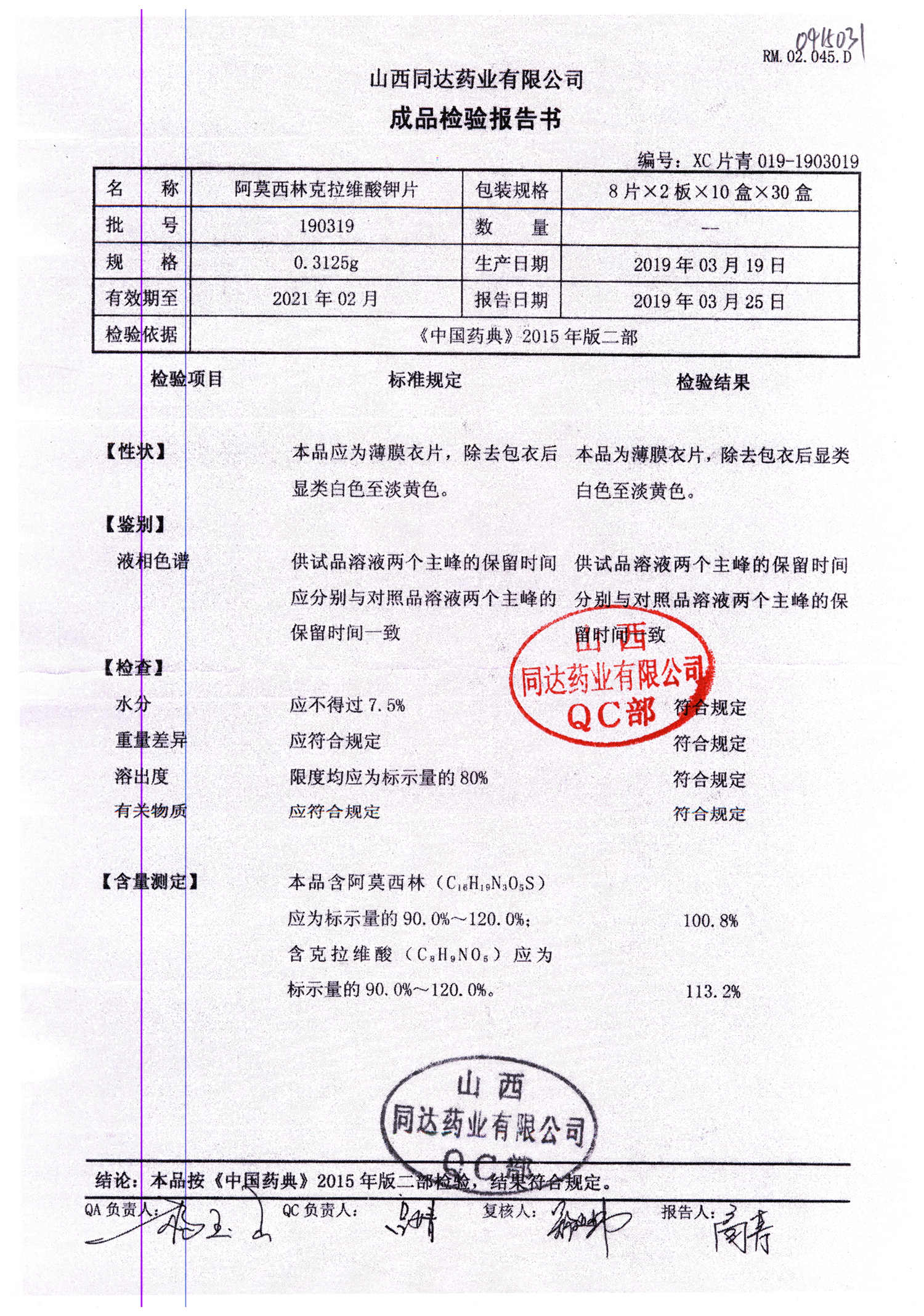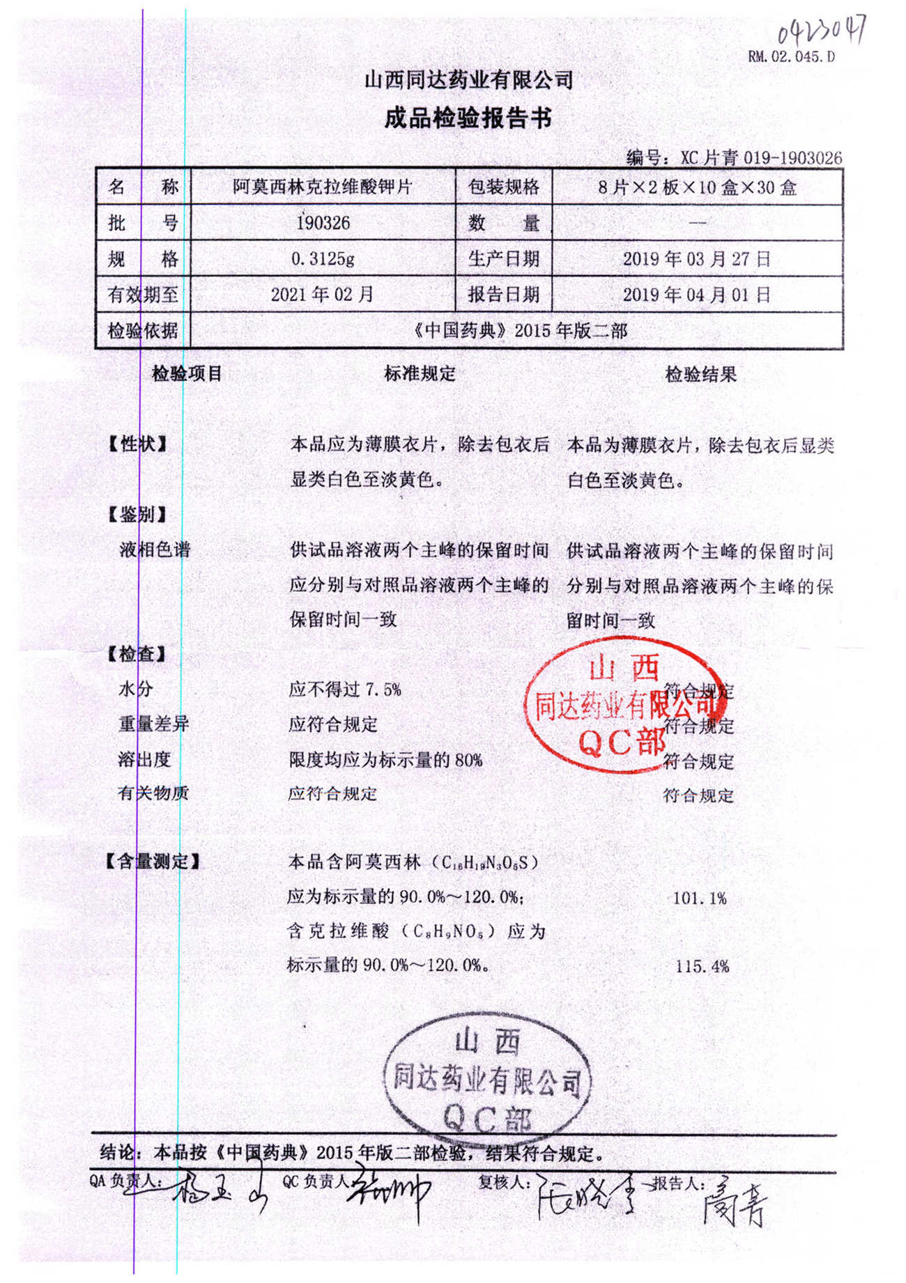 | 阿莫西林克拉維酸鉀片 | 0.3125g*16s | 190326 | 查看詳情 |