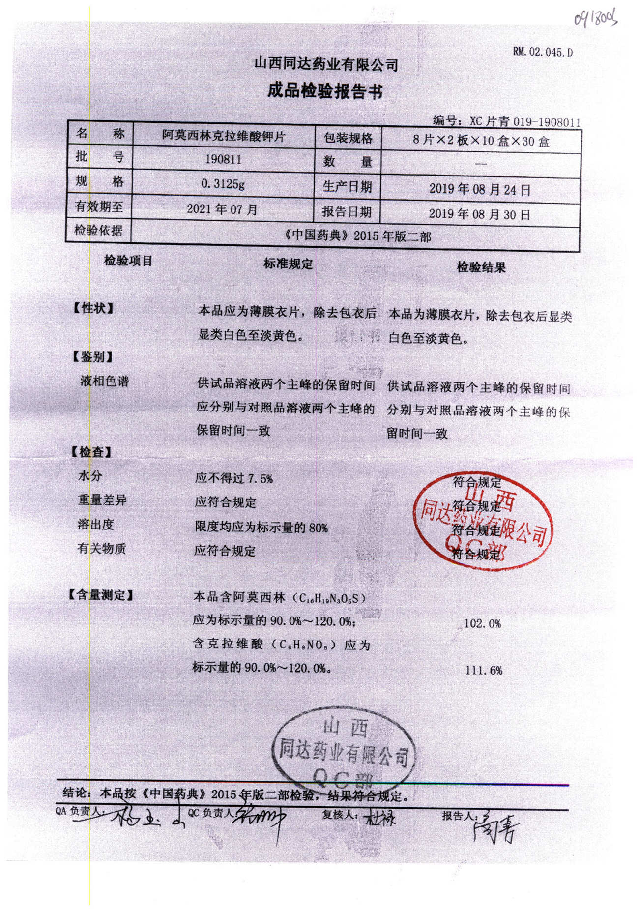 | 阿莫西林克拉維酸鉀片 | 0.3125g*16s | 190811 | 查看詳情 |