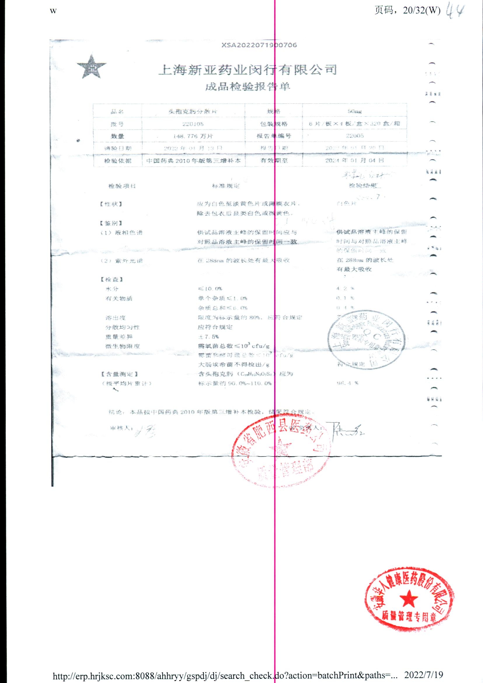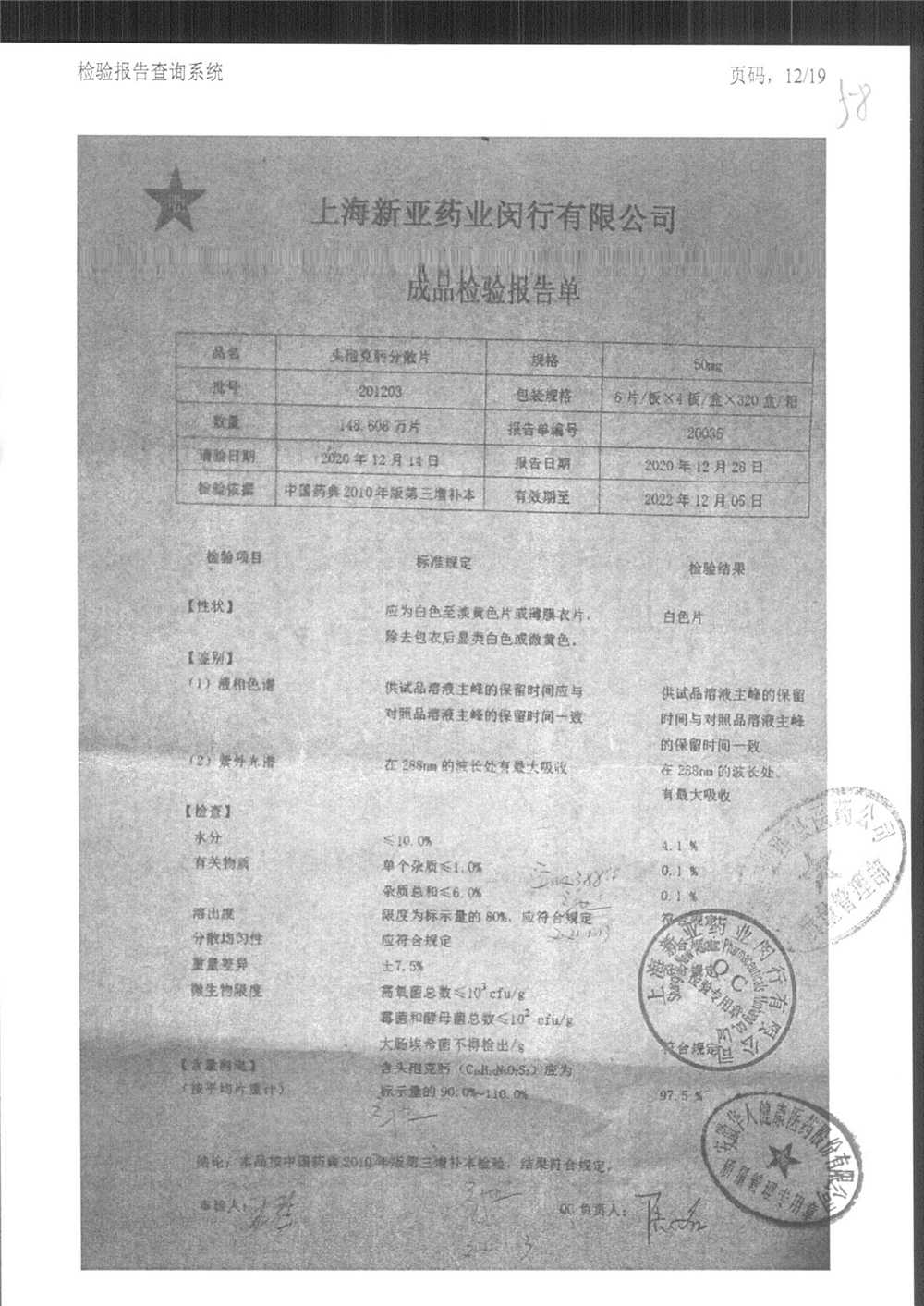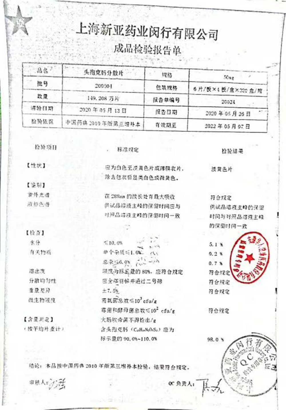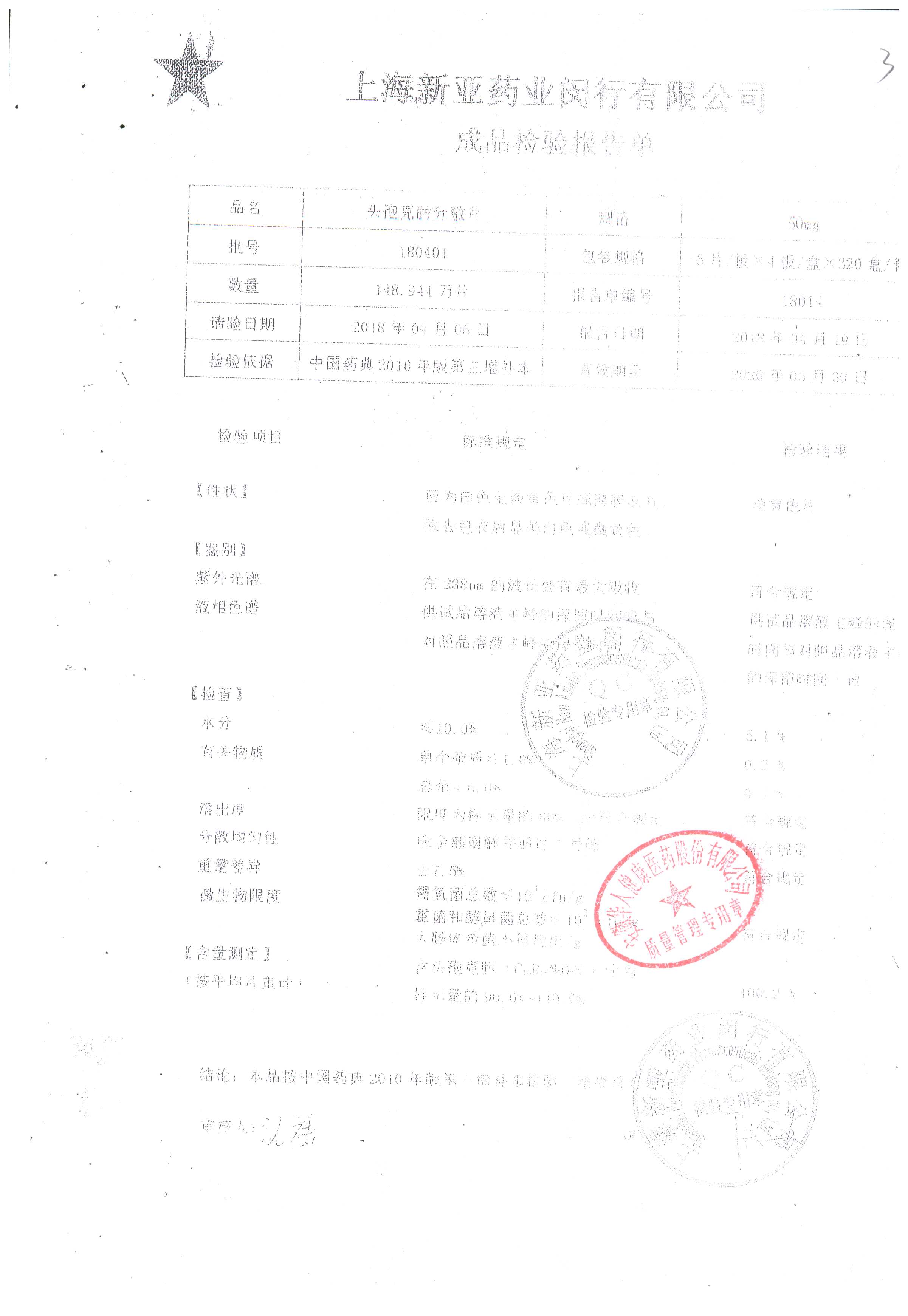 | 頭孢克肟分散片 | 50mg*24s | 210105 | 查看詳情 |