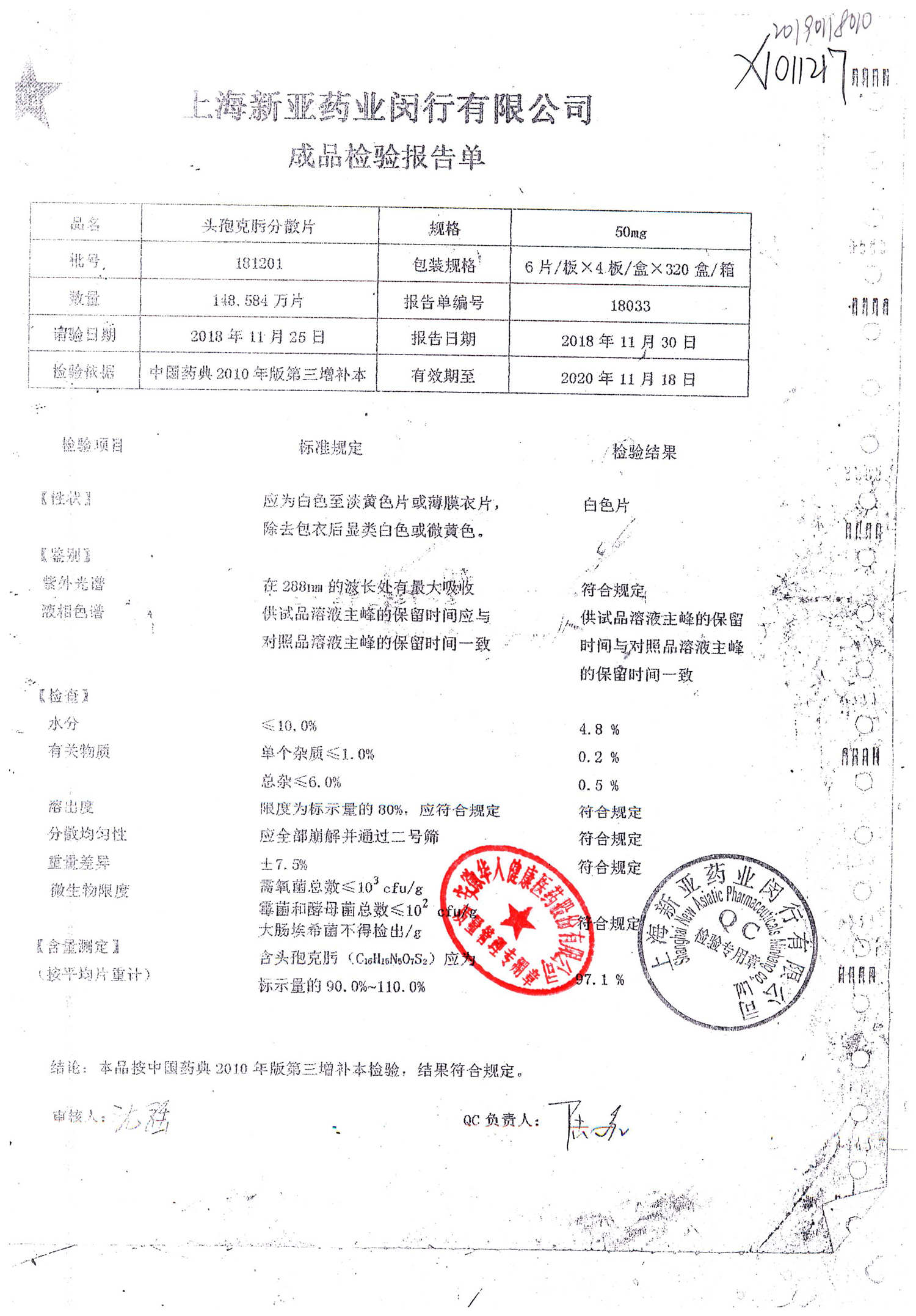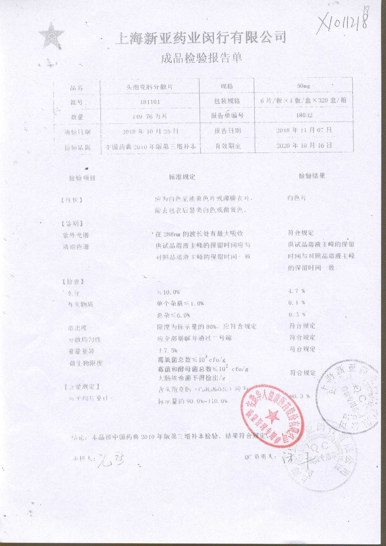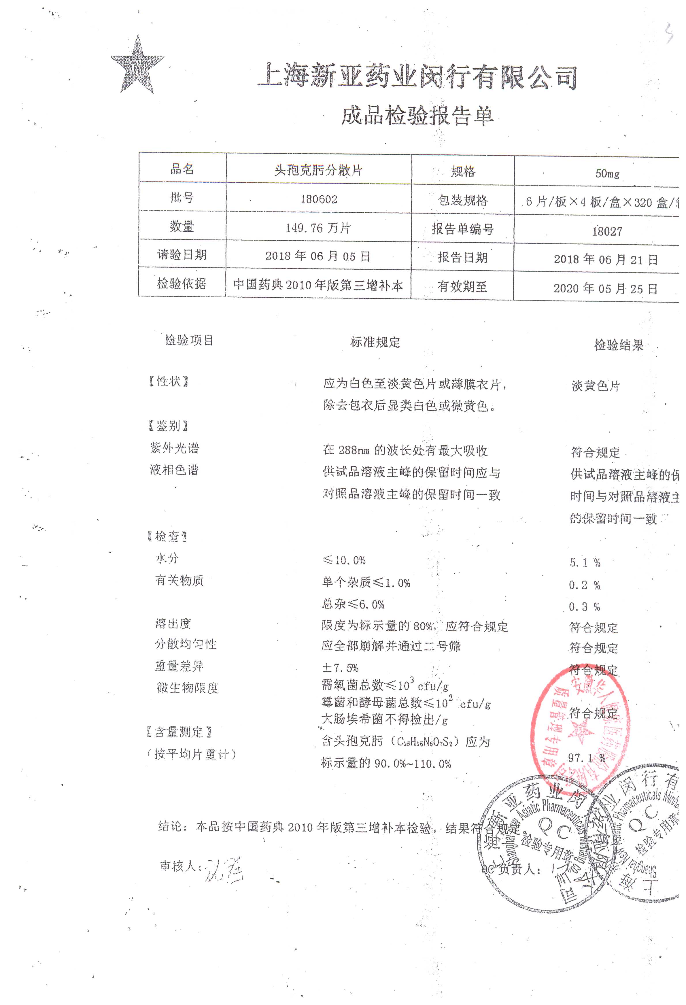 | 頭孢克肟分散片 | 50mg*24s | 190502 | 查看詳情 |