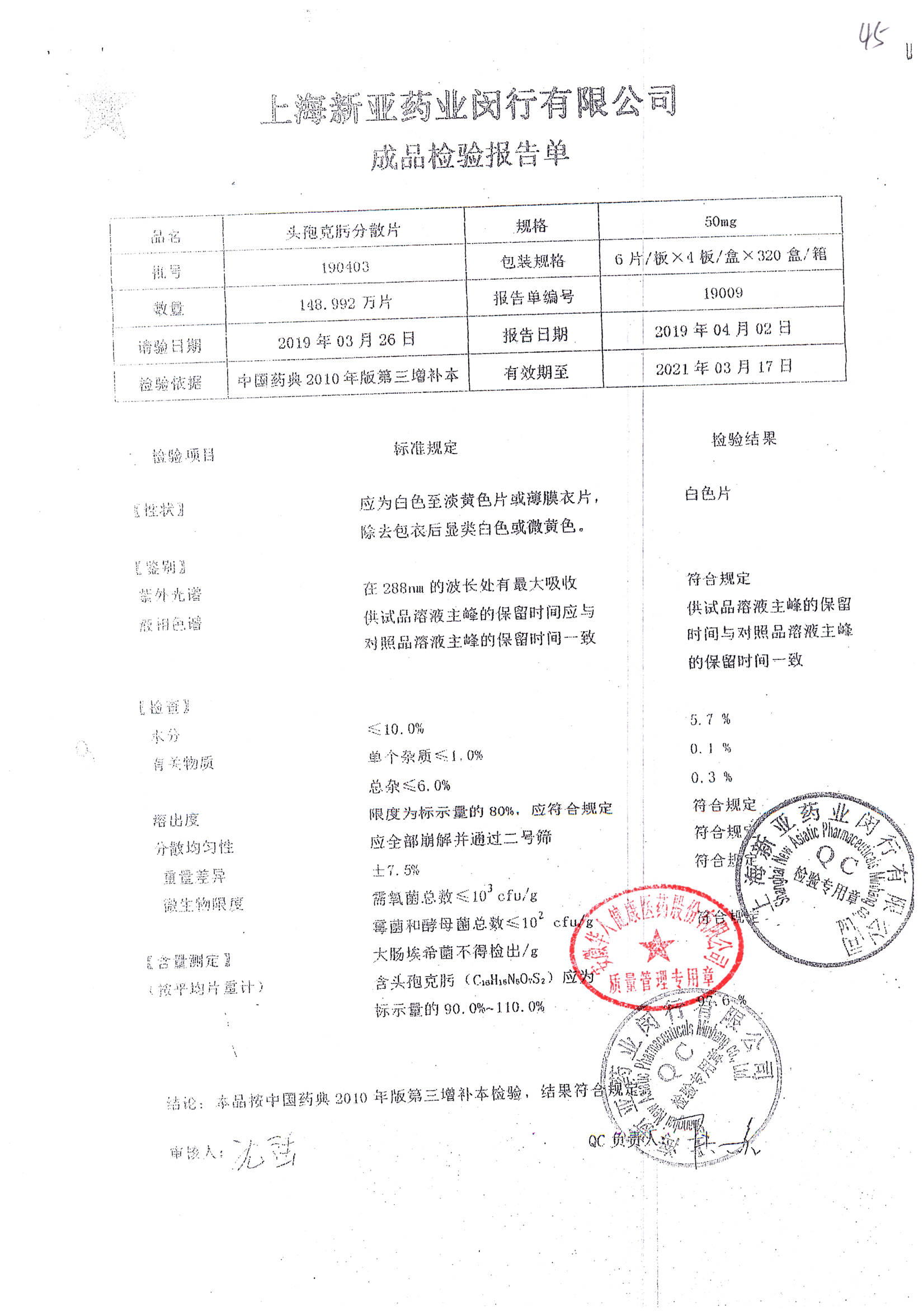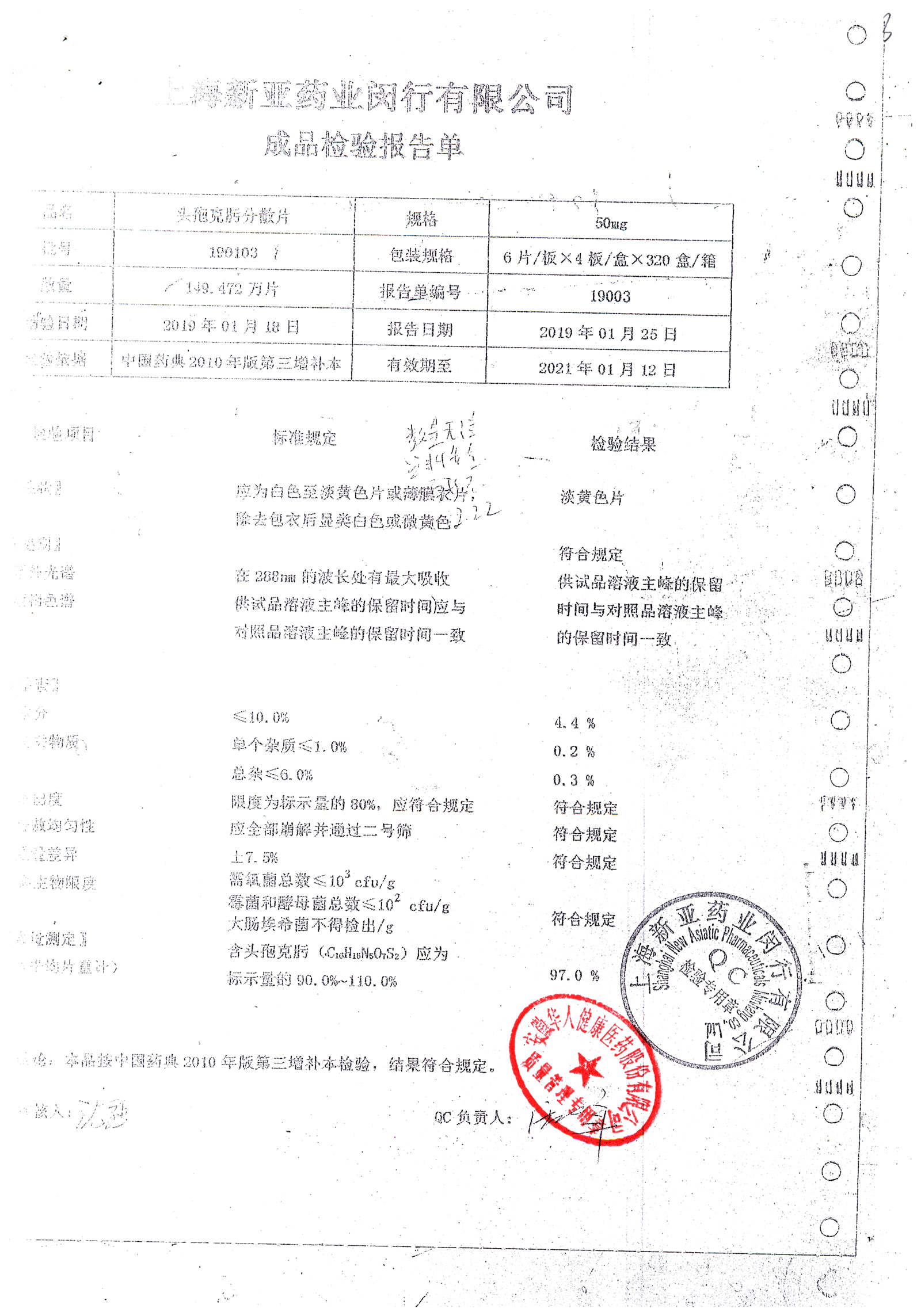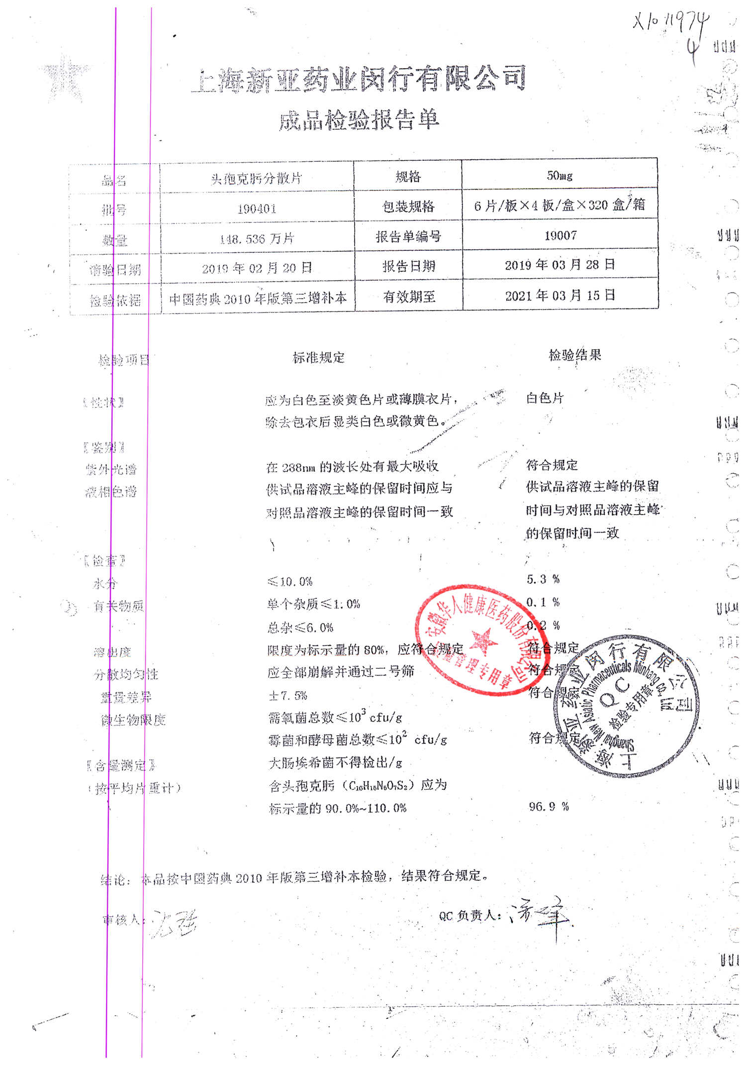 | 頭孢克肟分散片 | 50mg*24s | 190702 | 查看詳情 |