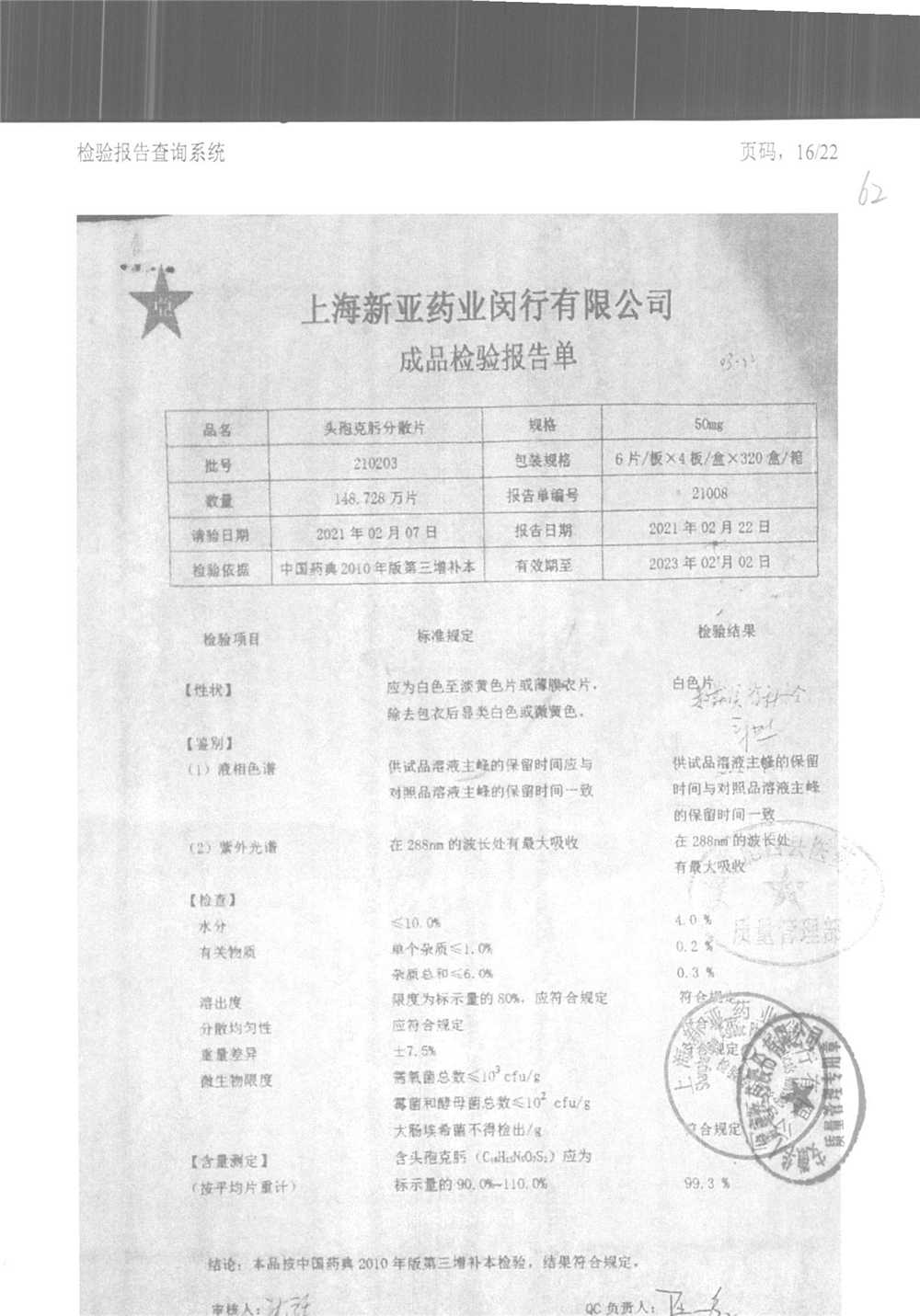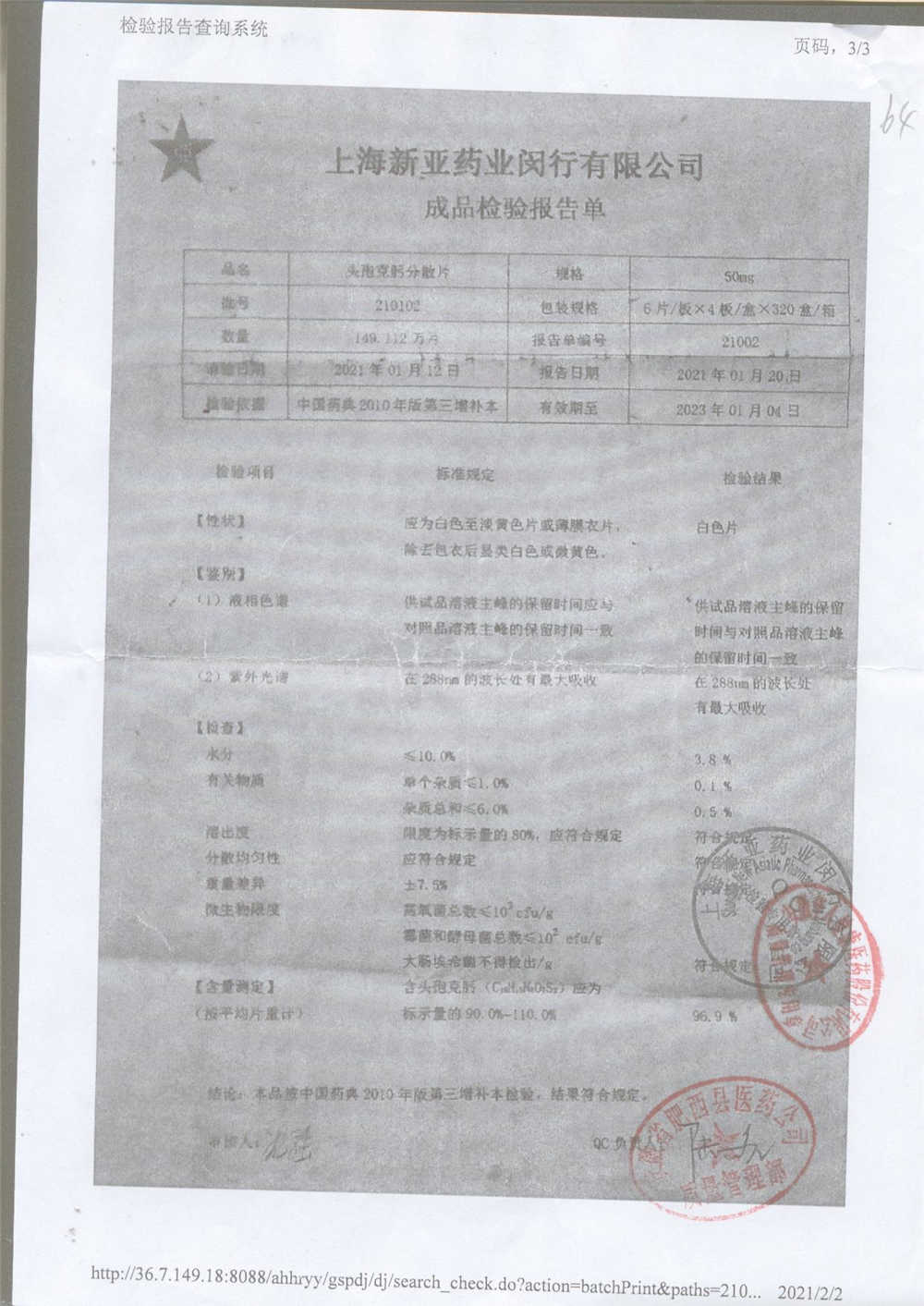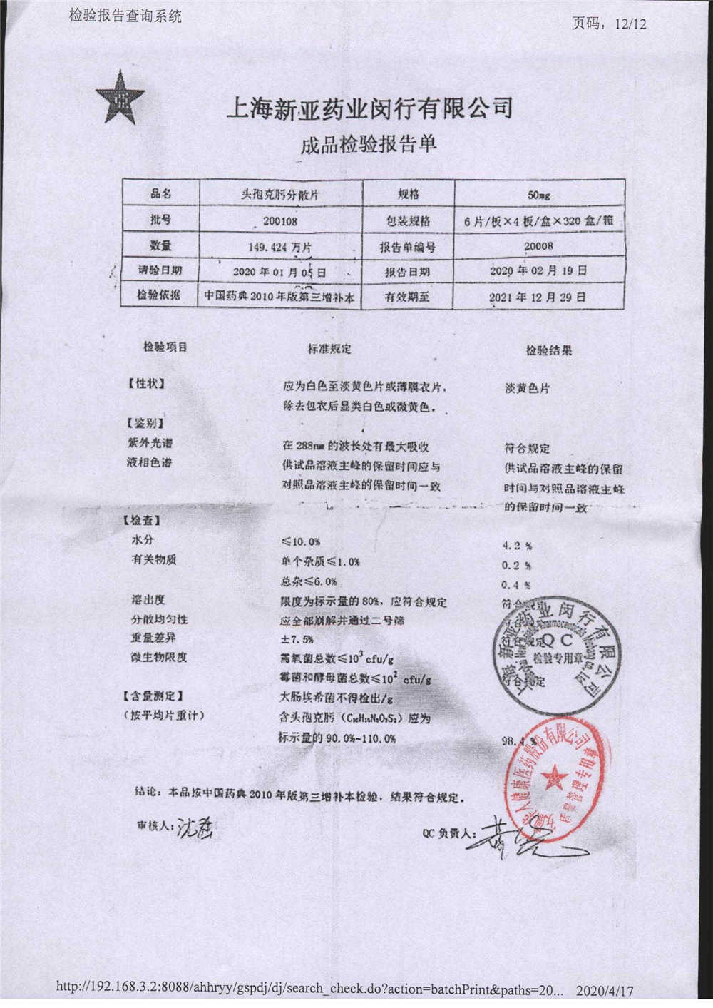 | 頭孢克肟分散片 | 50mg*24s | 210302 | 查看詳情 |