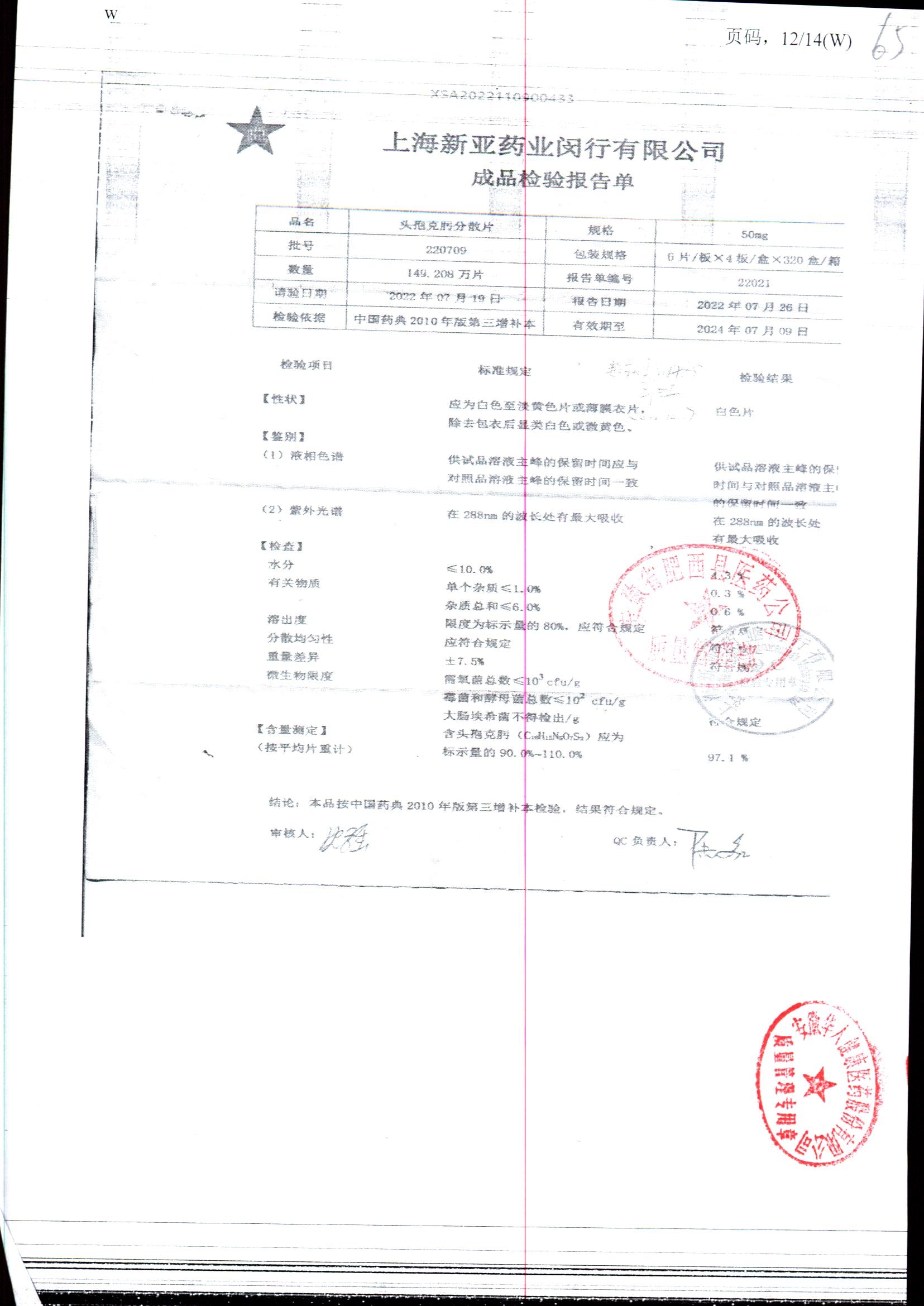 | 頭孢克肟分散片 | 50mg*24s | 220708 | 查看詳情 |