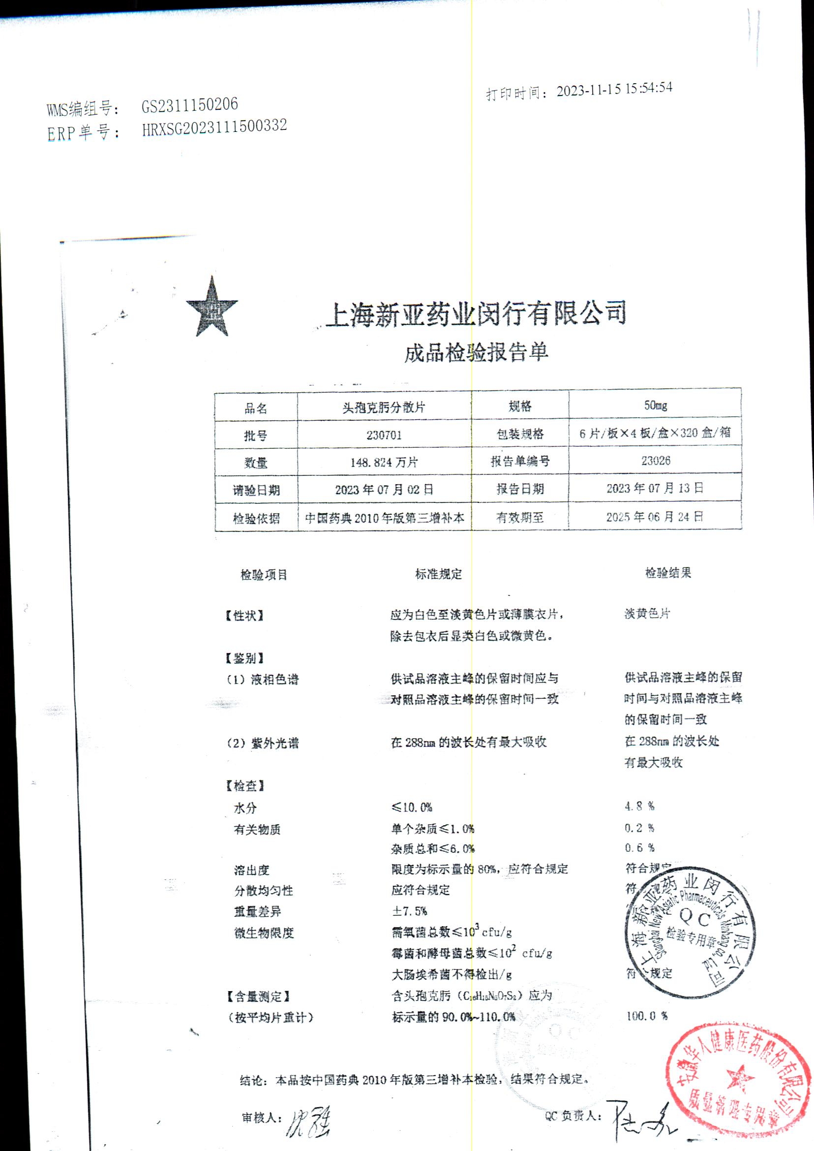 | 頭孢克肟分散片 | 50mg*24s | 230701 | 查看詳情 |