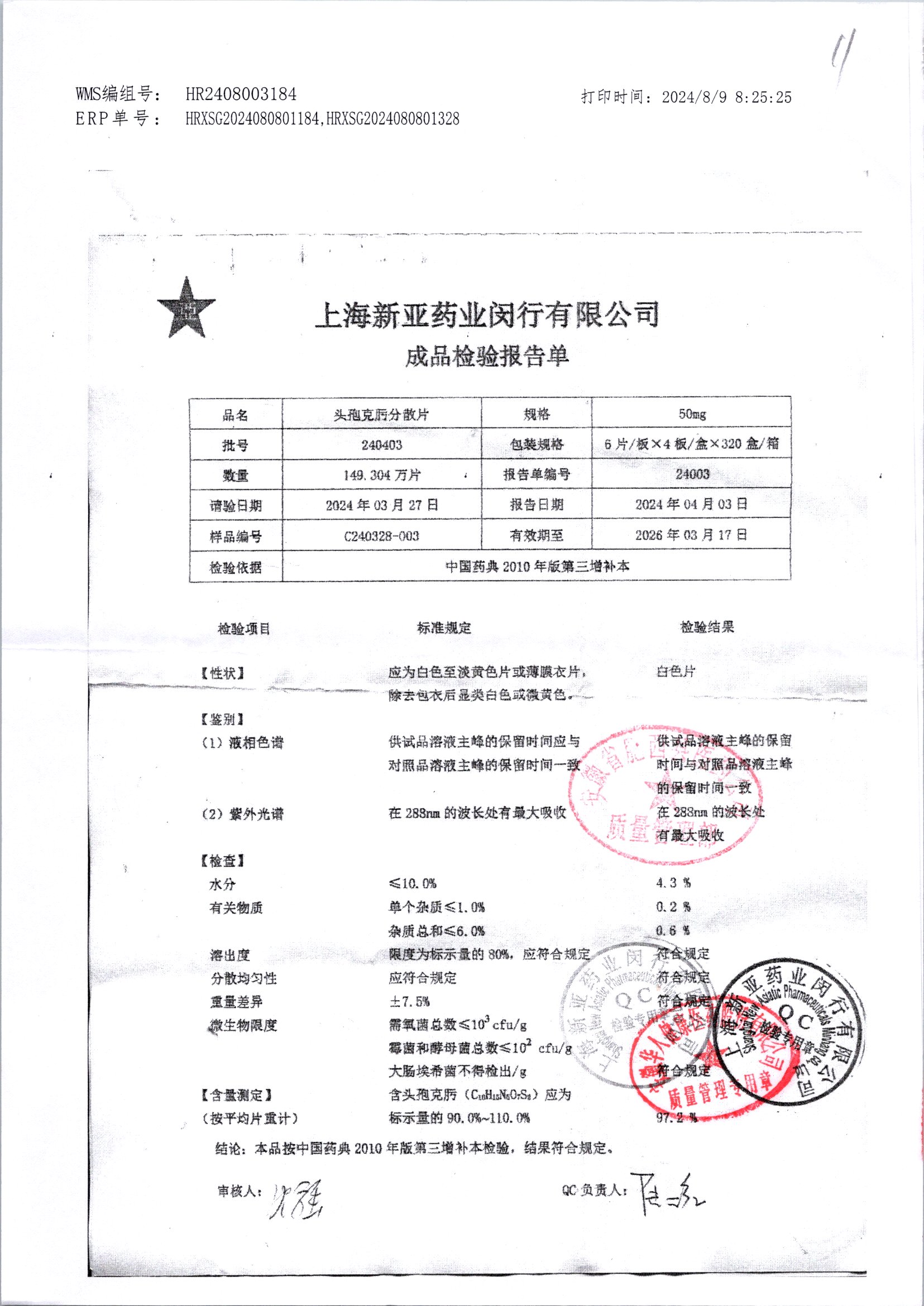 | 頭孢克肟分散片 | 50mg*24s | 240903 | 查看詳情 |